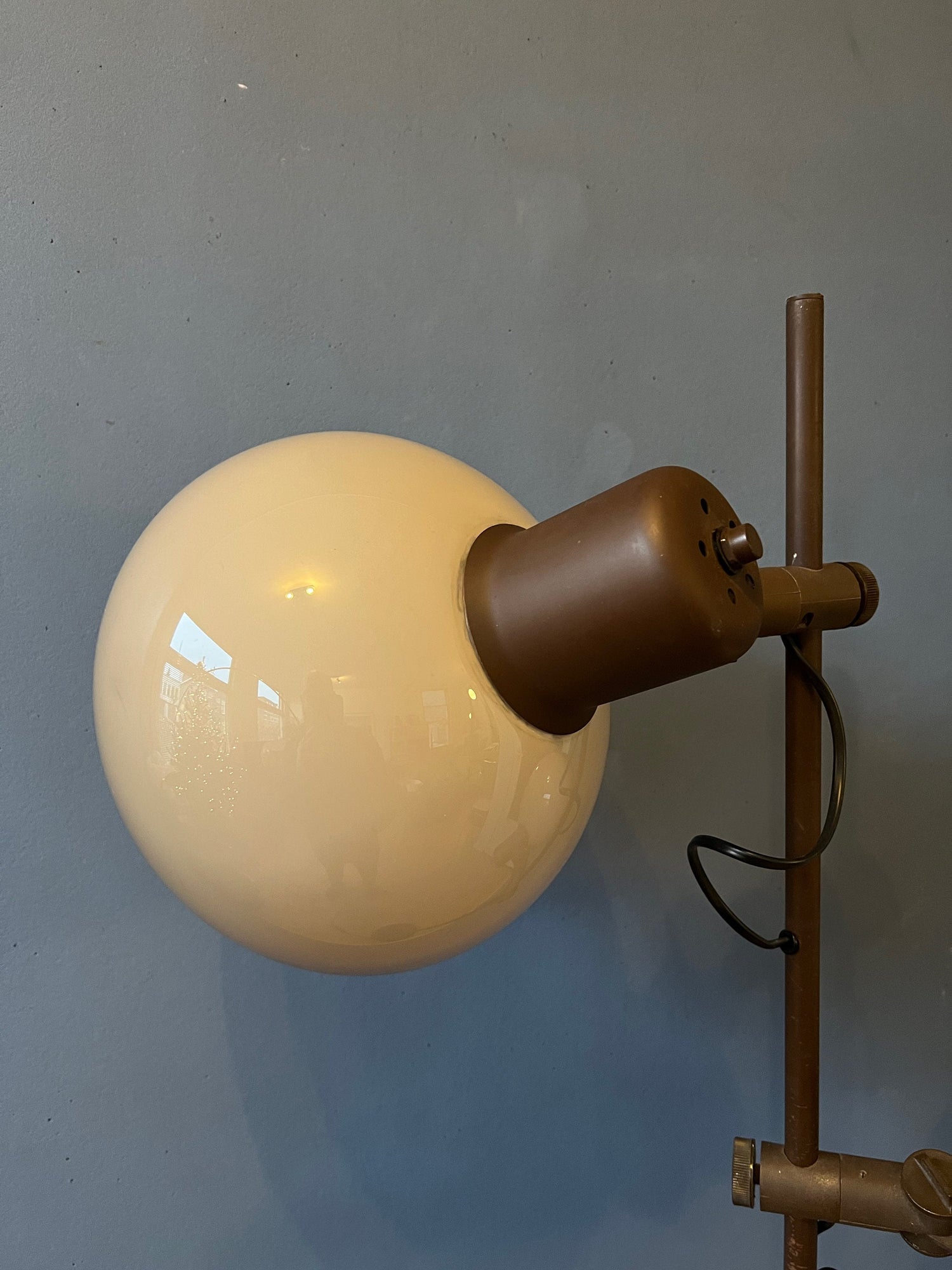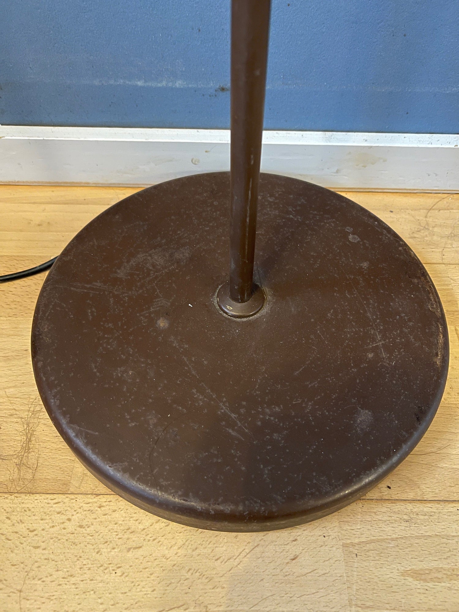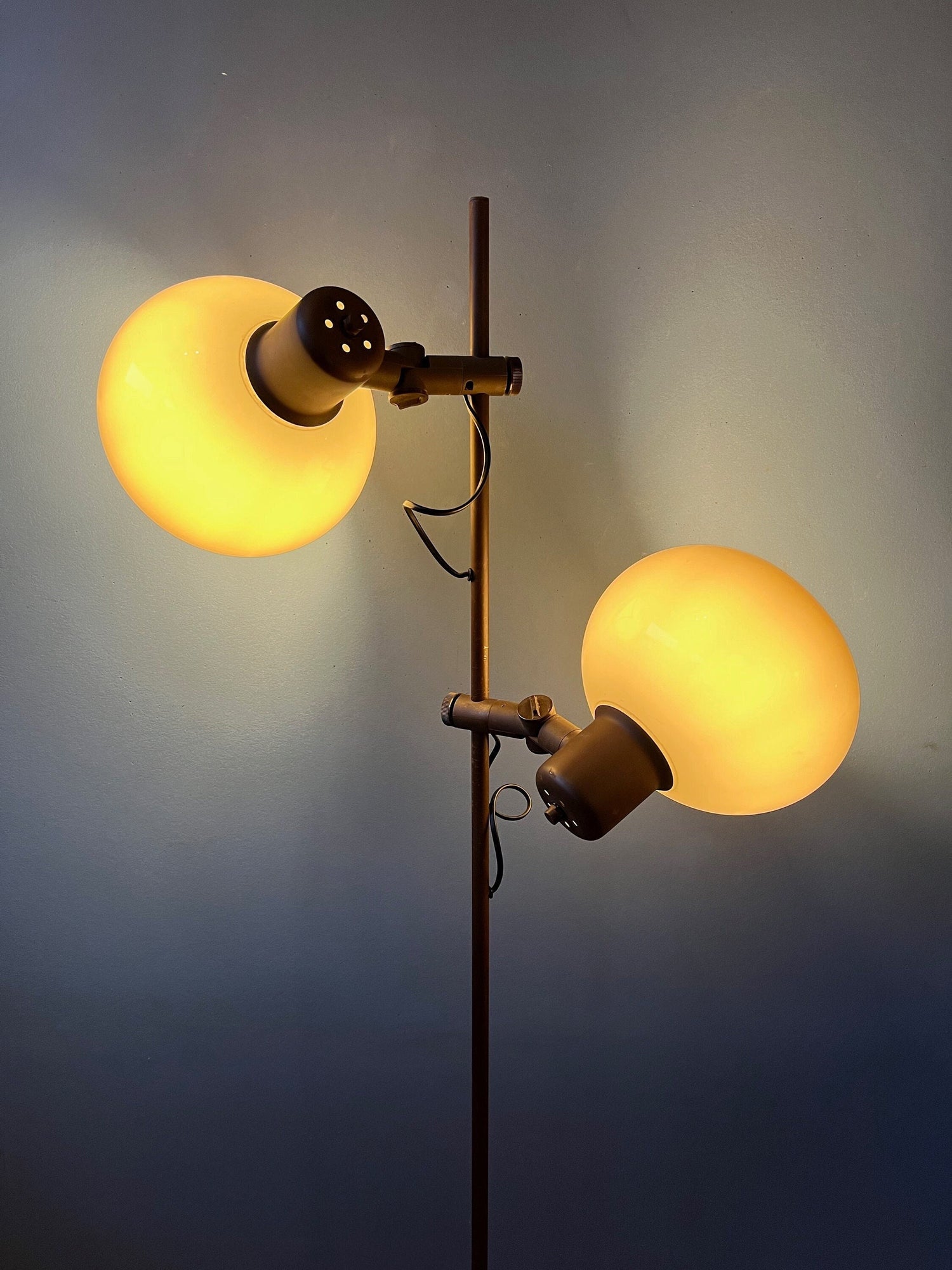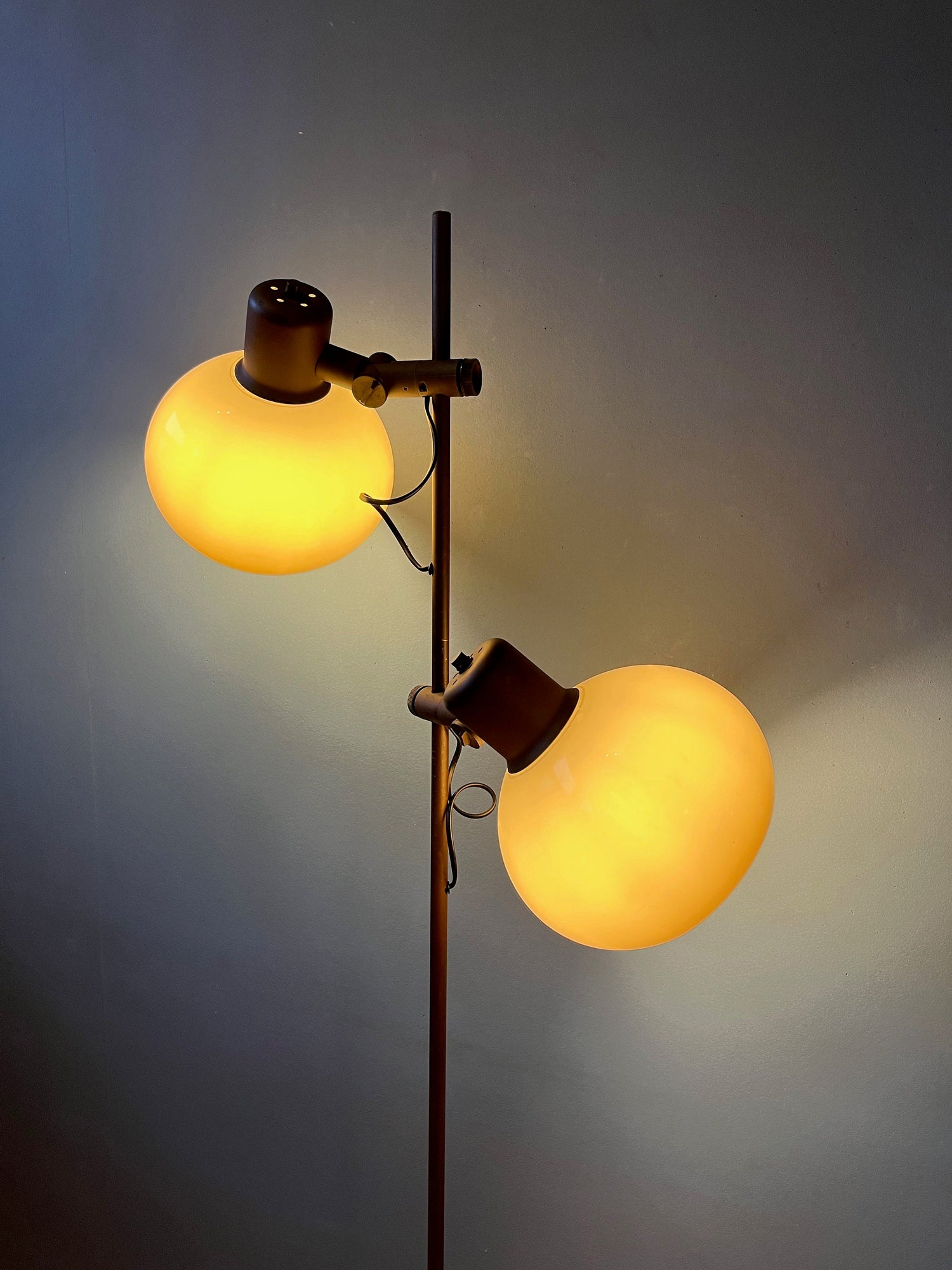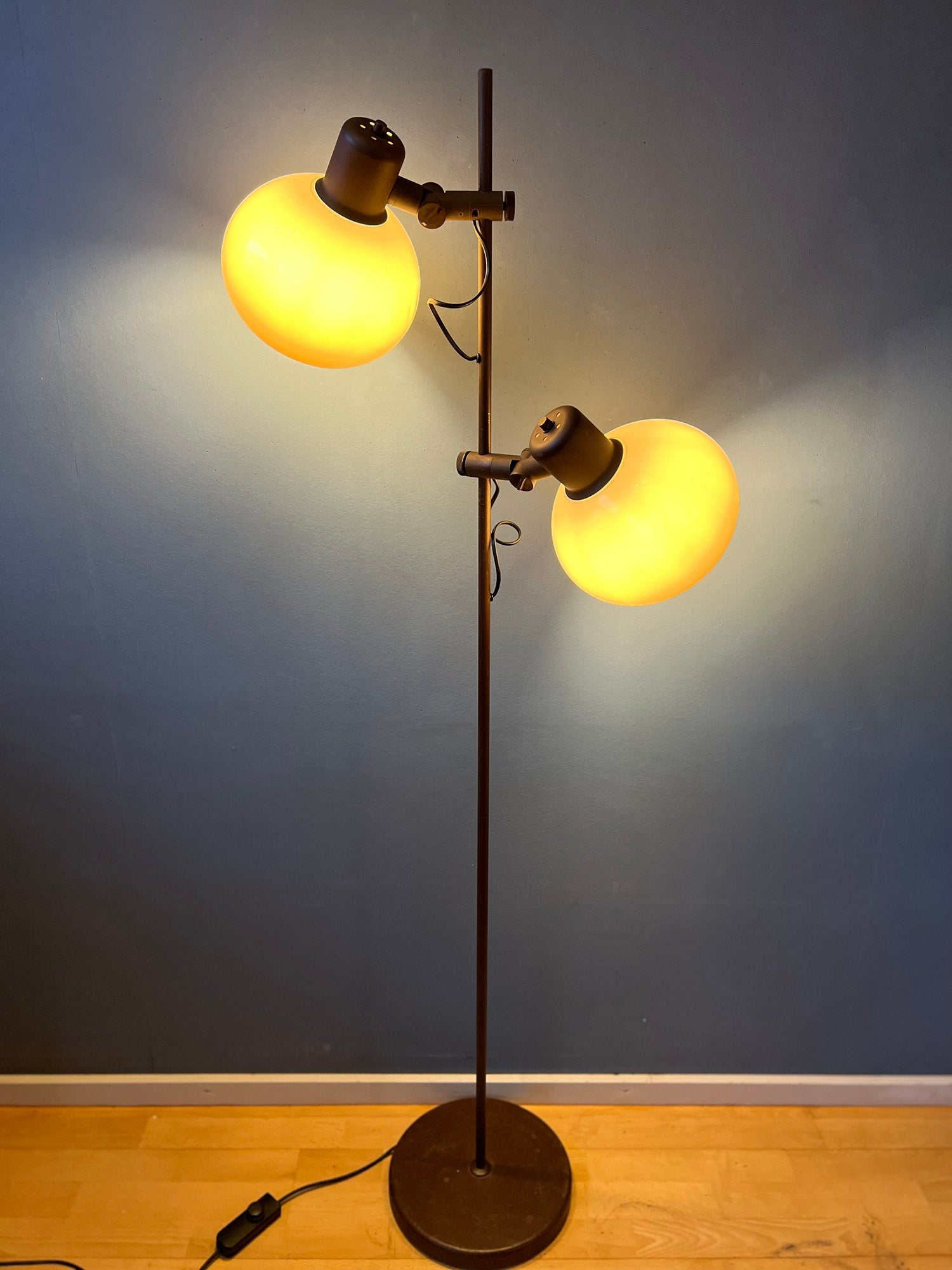 A beautiful mushroom floorlamp by Herda in brown colour. The mushroom spots can be turned in any direction and move up and down the base. The floorswitch allows you to switch on the lights simultaneously or separately. The lamp requires two E27 lightbulbs.