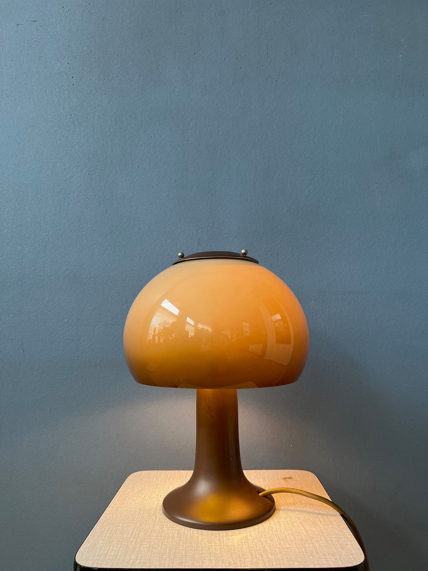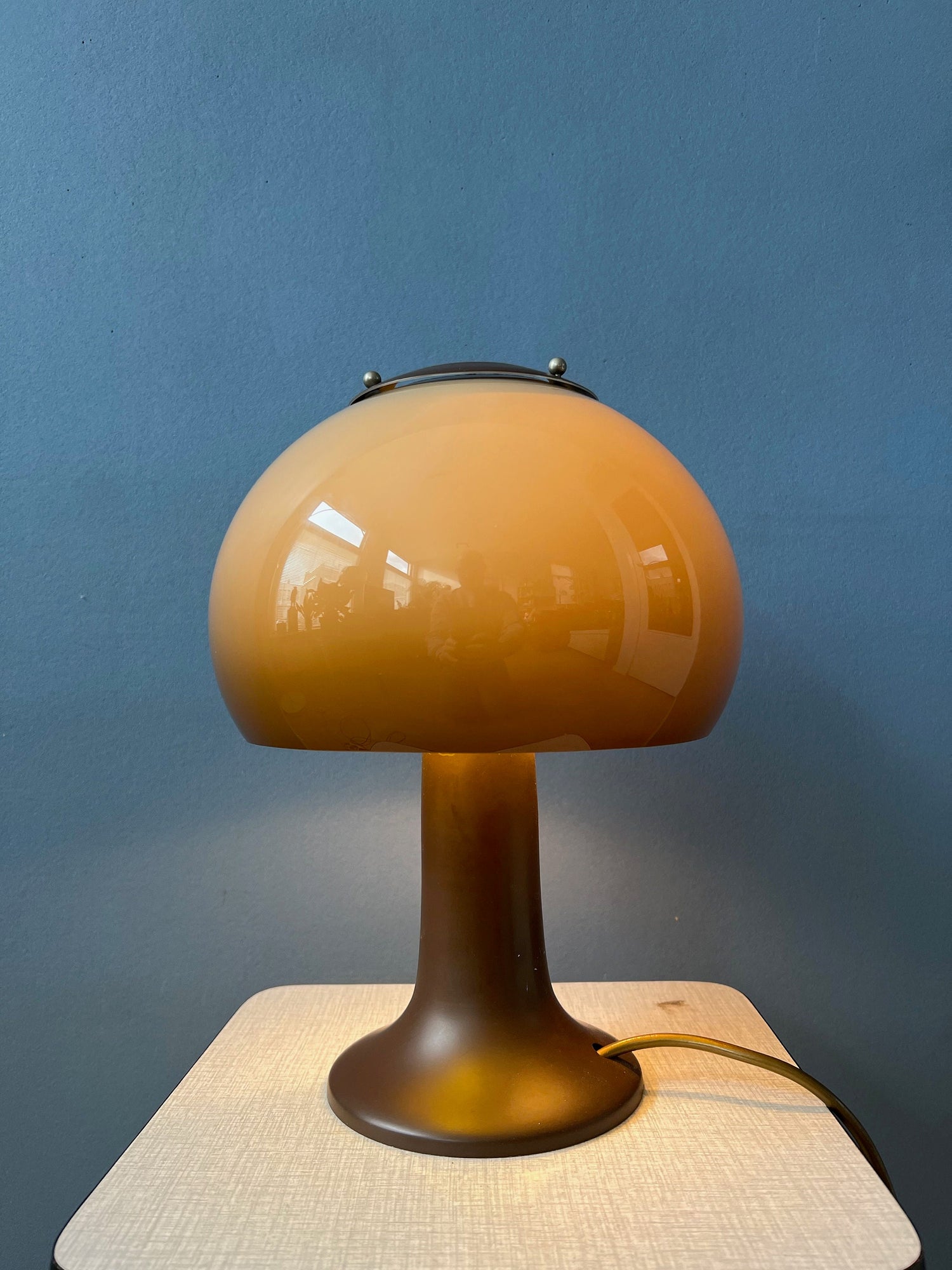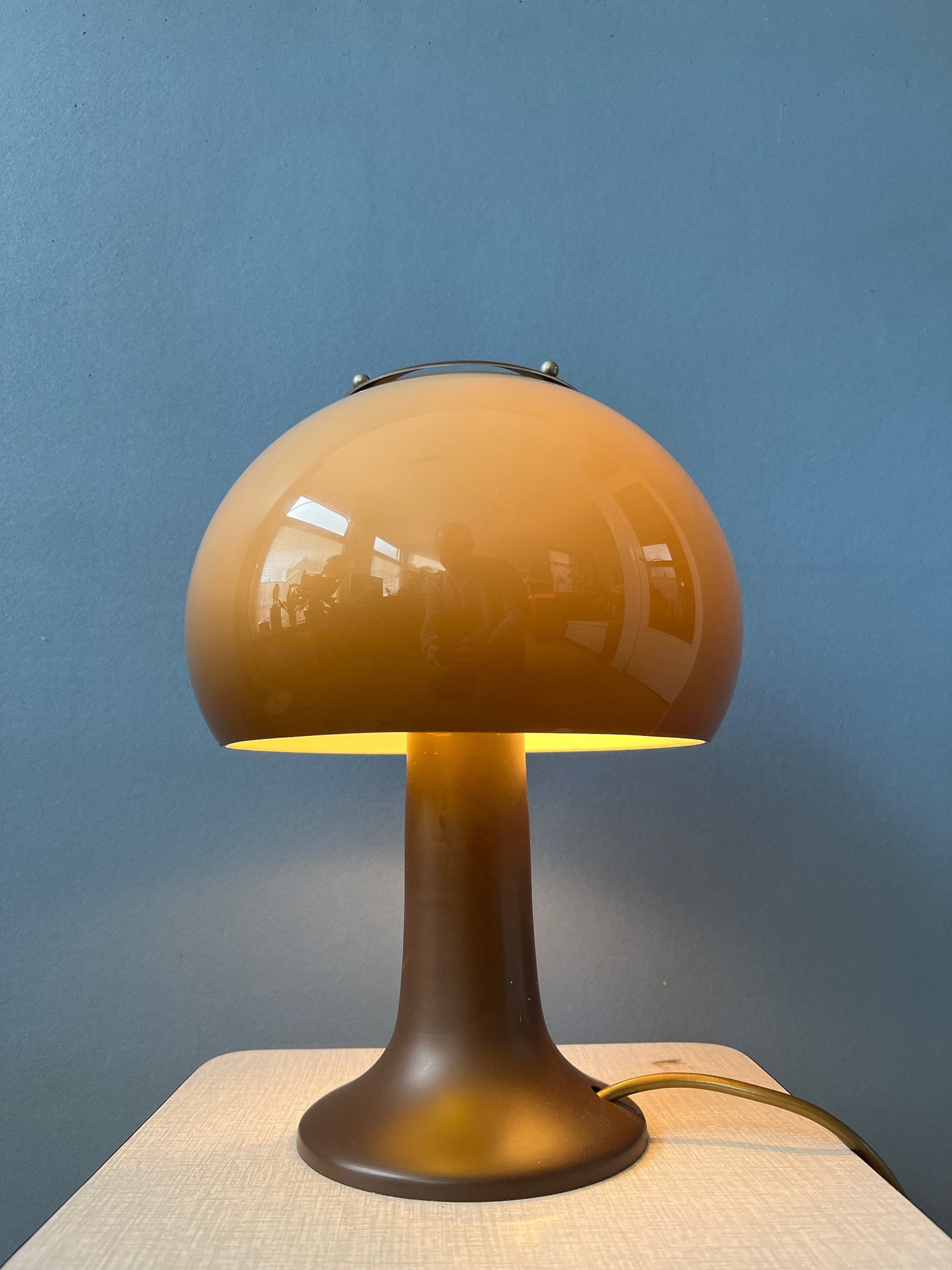 Small mushroom table lamp by the Dutch brand Herda. The mocca-coloured shade produces a nice and warm light. The lamp requires one E27 (standard) lightbulb and currently has an EU-plug.