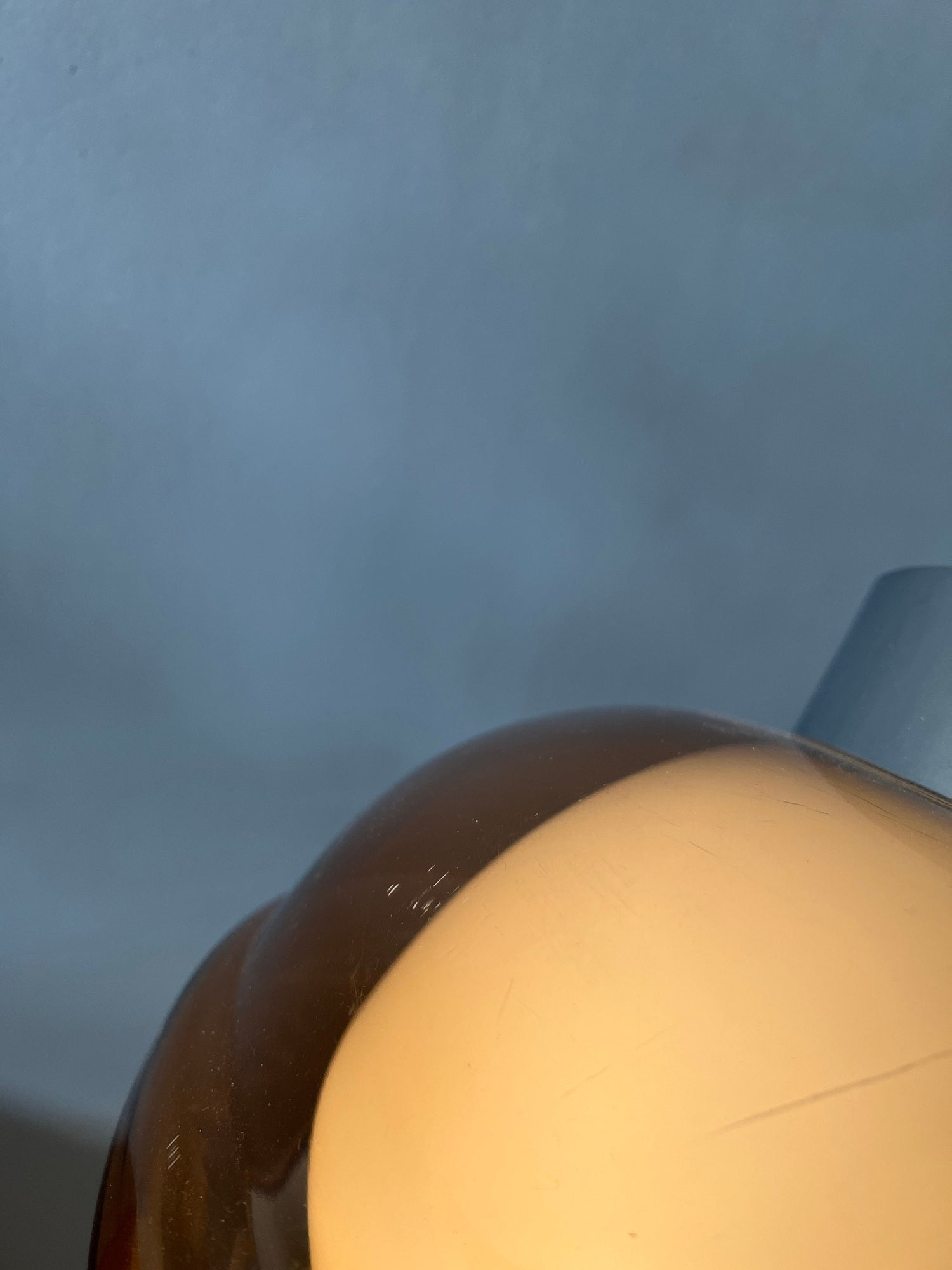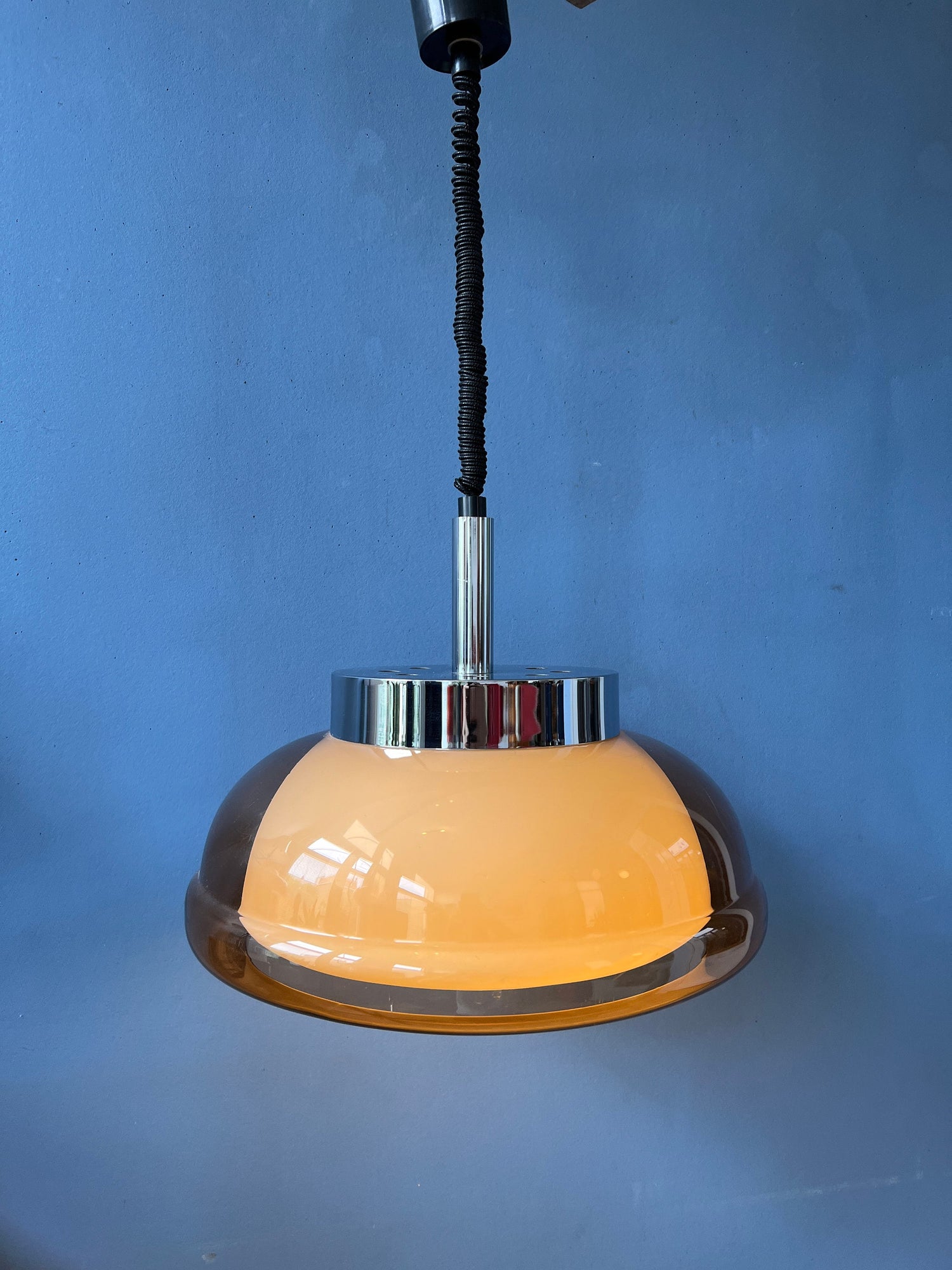 A very special space age pendant by the Dutch brand Herda. The lamp consists of an acrylic copper coloured outer shade and a white inner shade. The height of the lamp can be adjusted with the suspension mechanism. The lamp requires one E27/26 lightbulb.