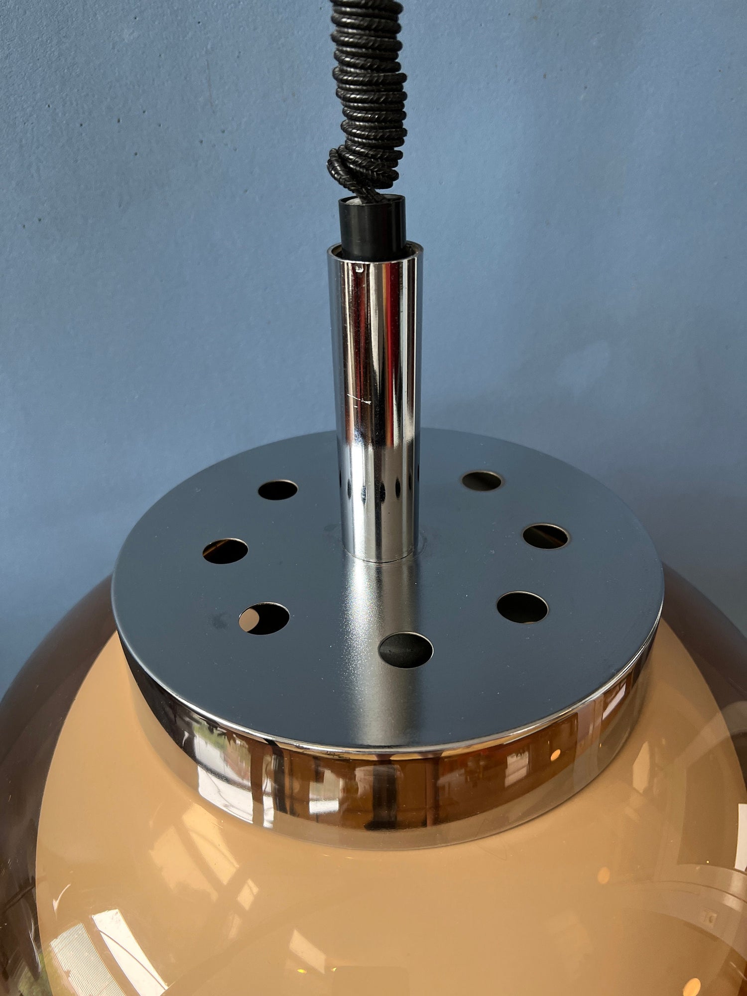 A very special space age pendant by the Dutch brand Herda. The lamp consists of an acryllic orange/brown/copper coloured outer shade and a white inner shade. The height of the lamp can be adjusted with the rise-and-fall system. The lamp requires one E27 lightbulb.