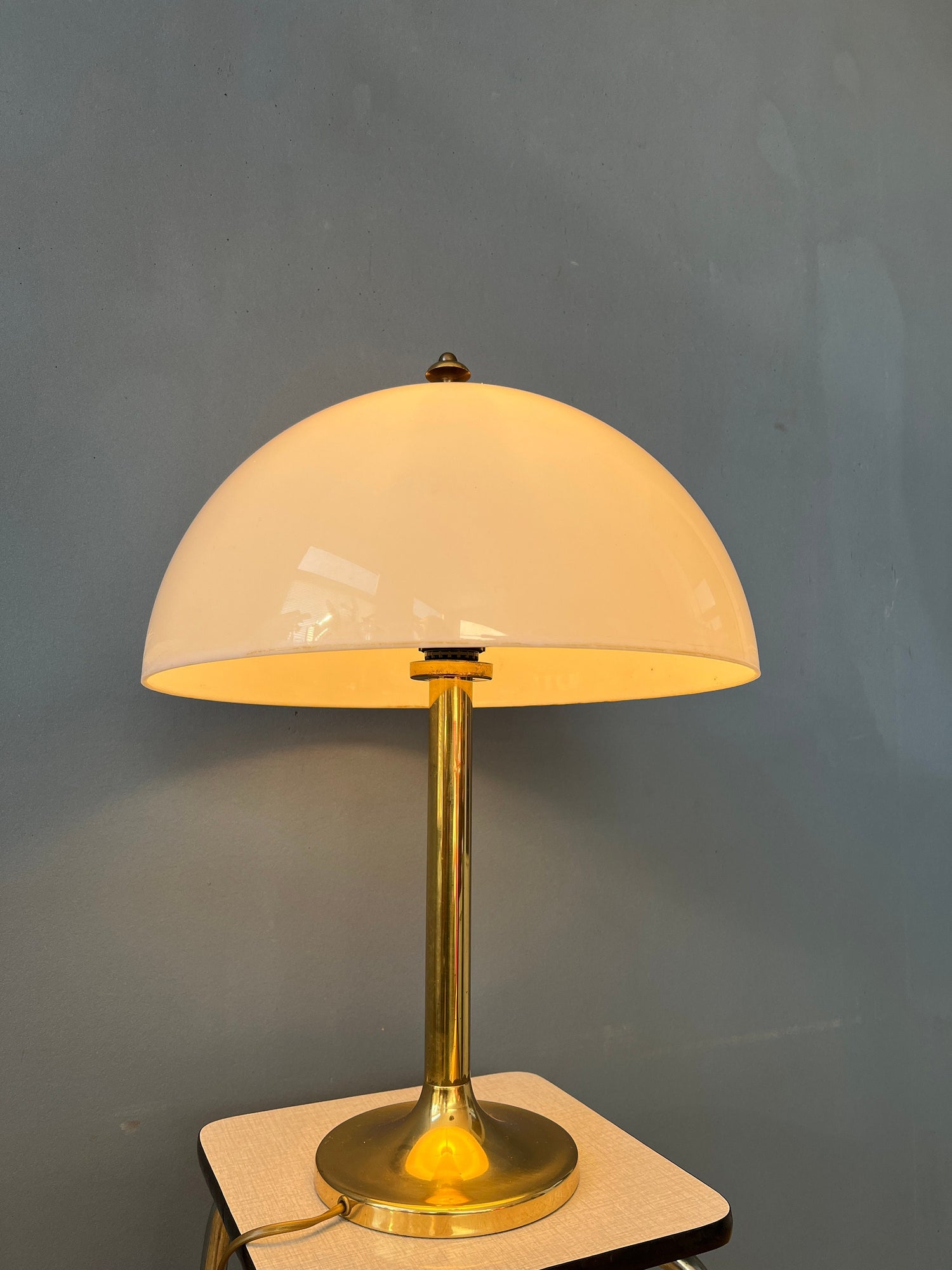 Vintage hollywood regency mushroom table lamp with golden base and white shade. The white acrylic glass shade produces a nice and warm light. The lamp requires one E27/26 (standard) lightbulb and currently has an EU-plug (works outside EU with plug-converter).