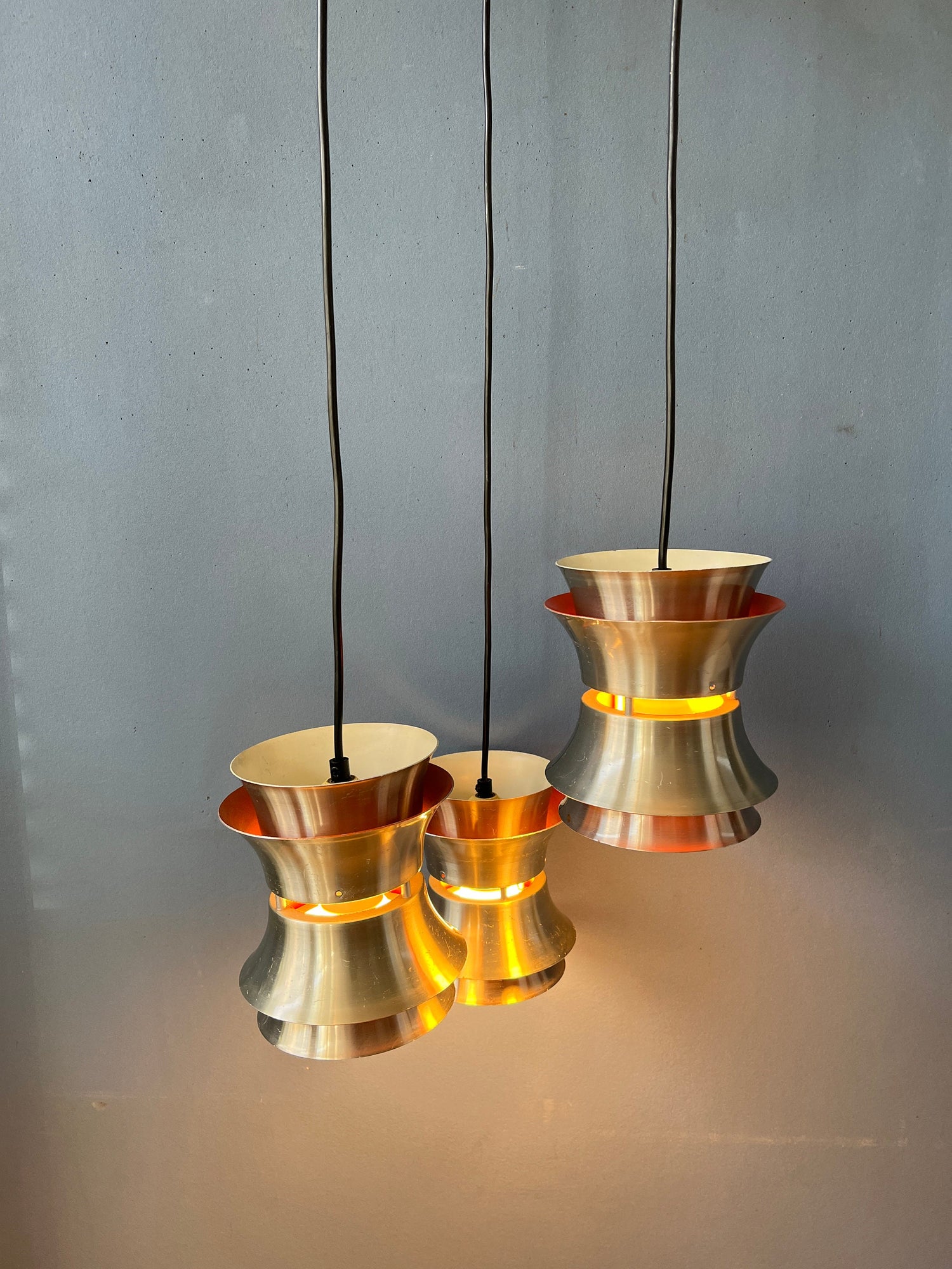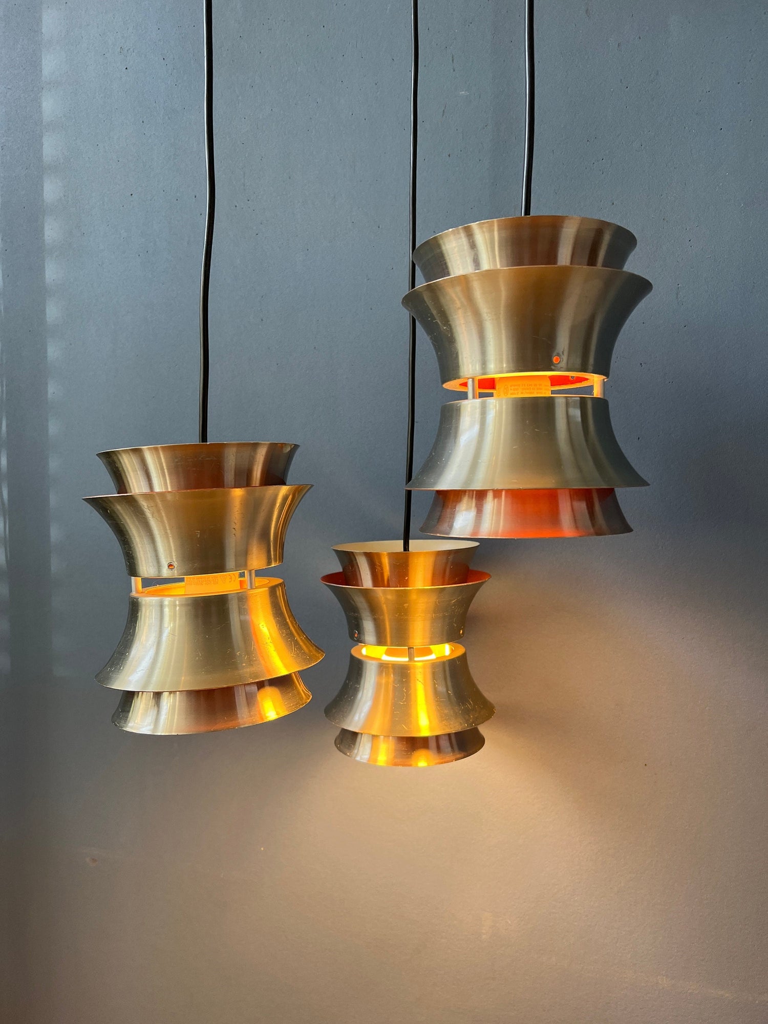Vintage Lakro Amstelveen cascade pendant lamp reminding of Carl Thore's trava lamps. It has three aluminium shades with orange lacquer on the inside. The lamp requires three small E27/26 (standard) lightbulbs.