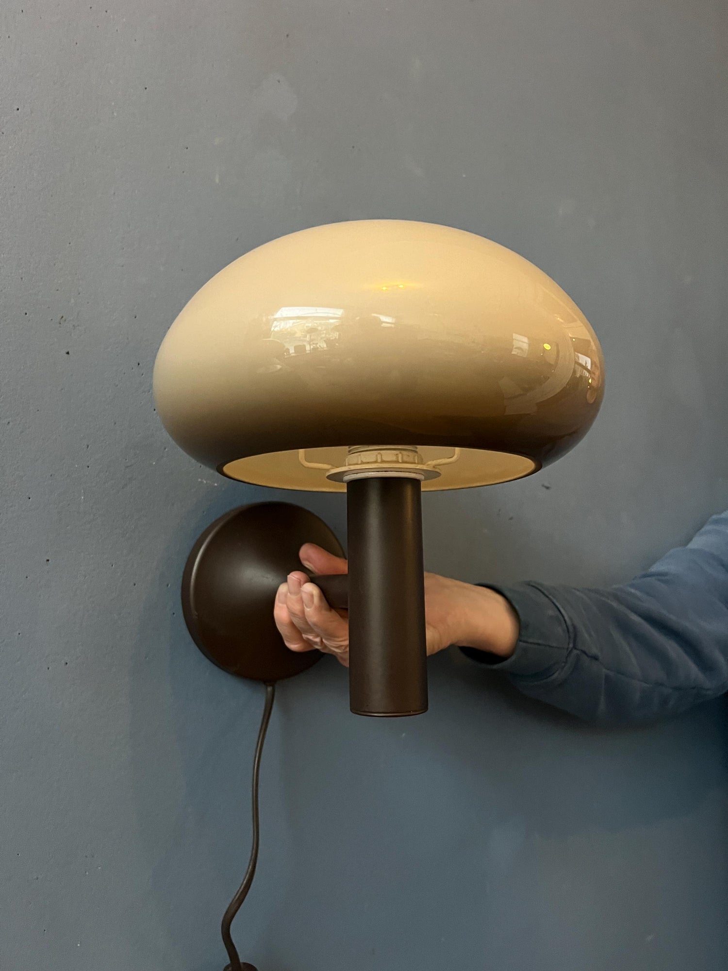 Small vintage space age mushroom wall lamp by Massive. The frame is made of metal and has a brown lacquer. The beige/brown shade is made of acrylic glass. The lamp requires one E27/26 lightbulb and currently has an EU-plug.