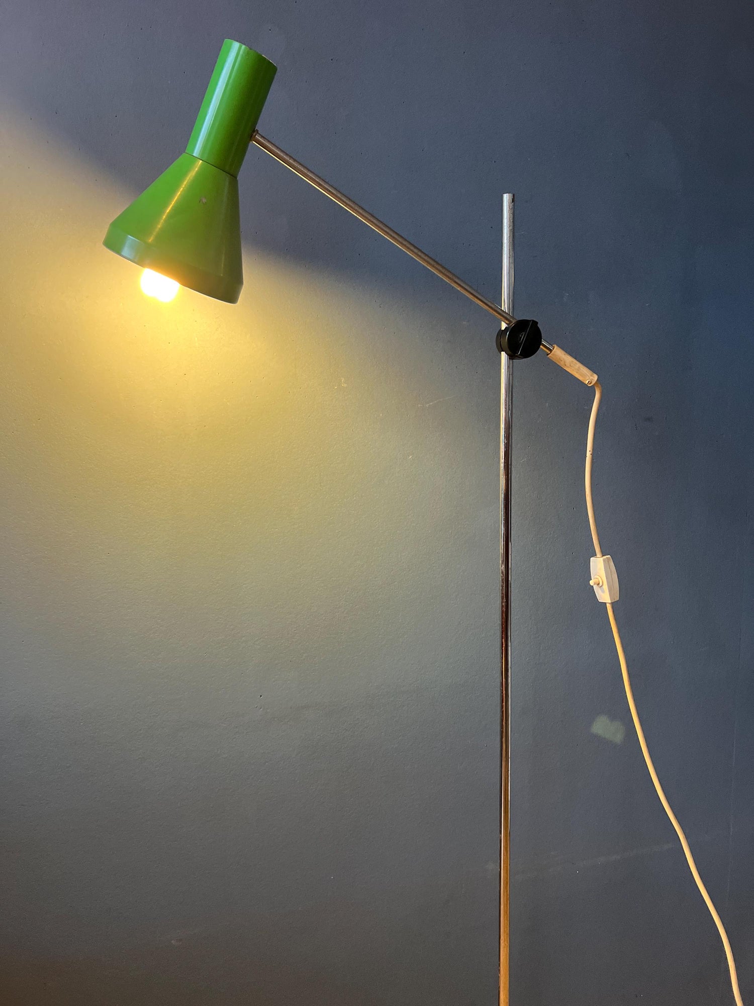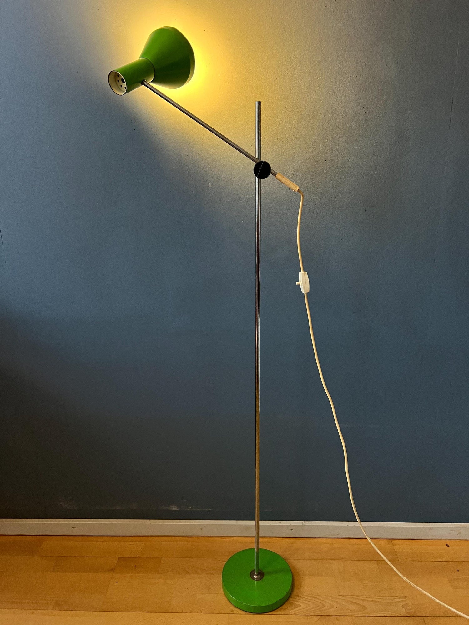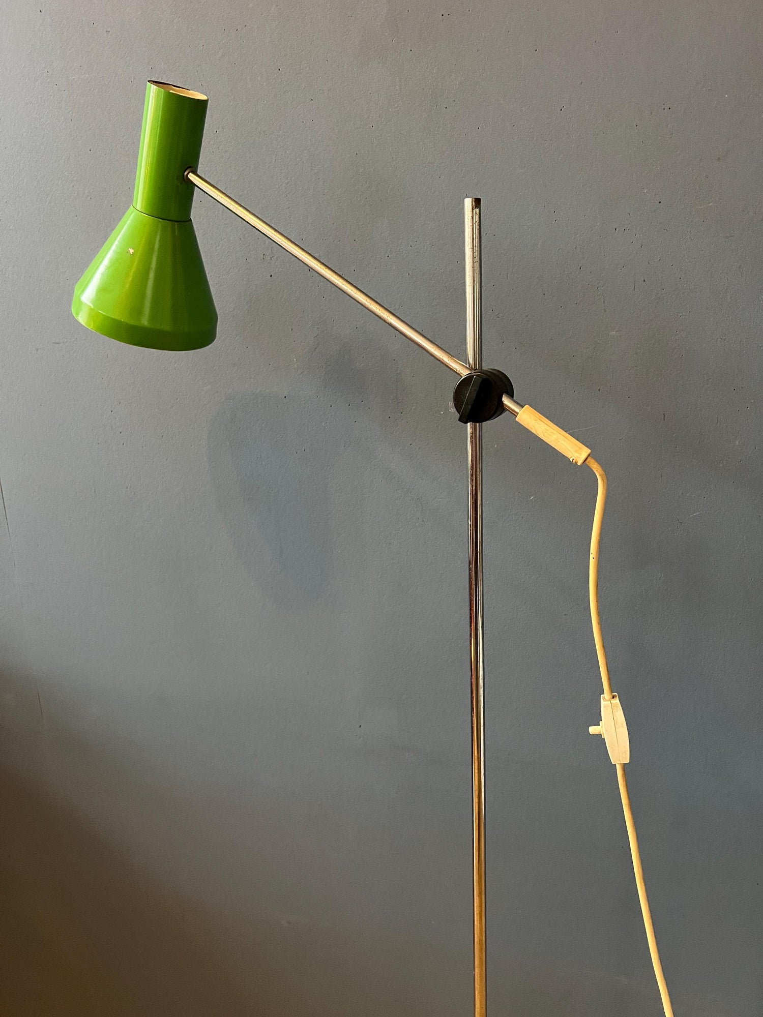 Apple green mid century floor lamp with adjustable arm. The design allows you to position the arm at a different height and width. The lamp requires one E27/26 lightbulb and currently has a EU-plug.