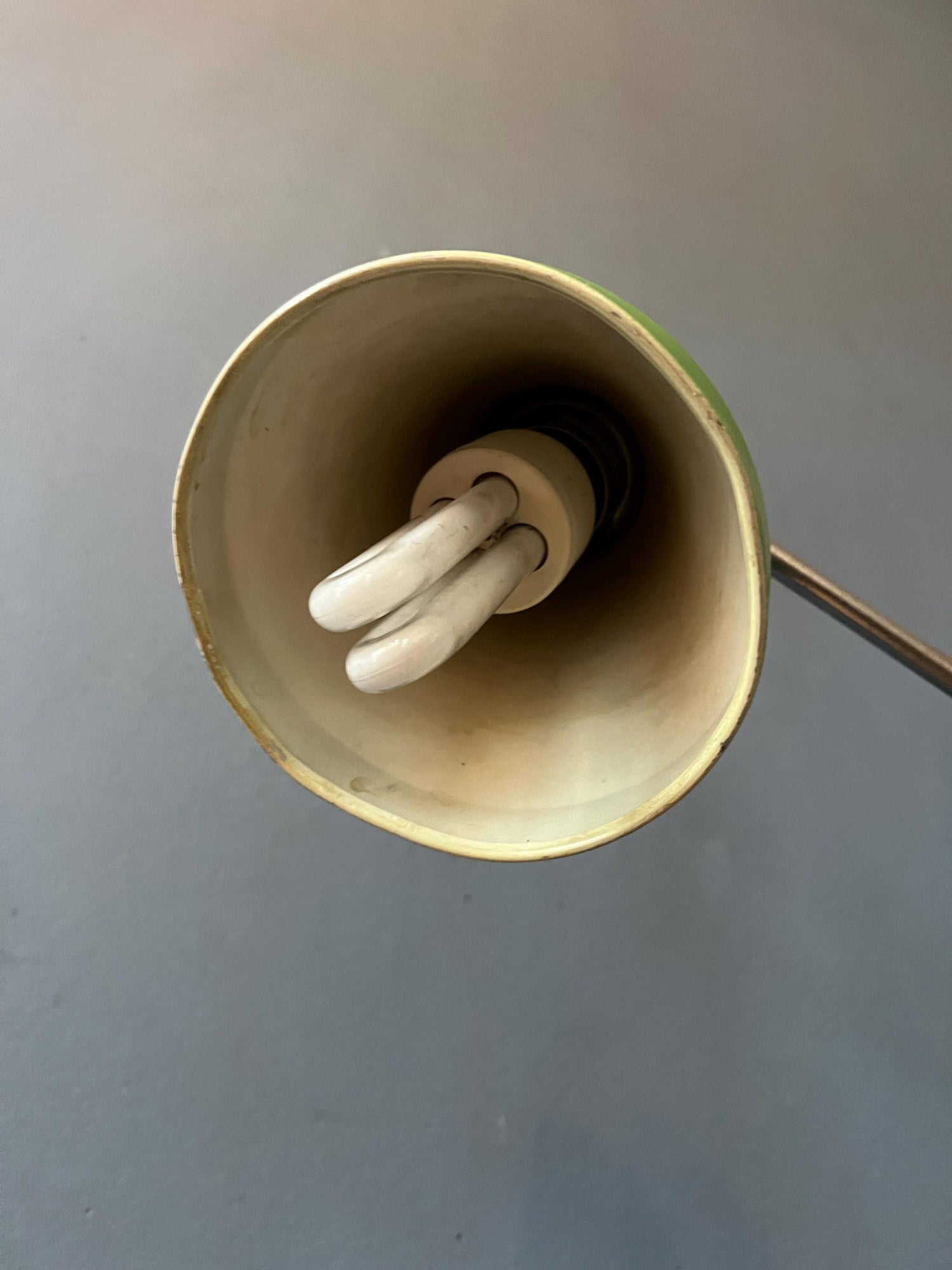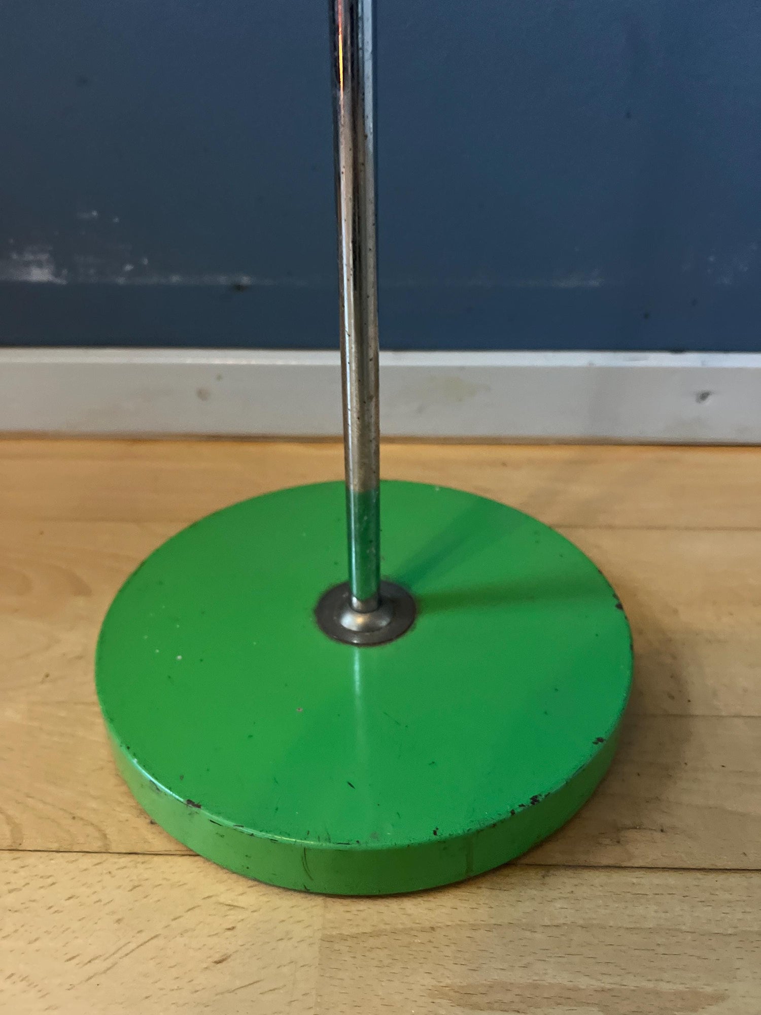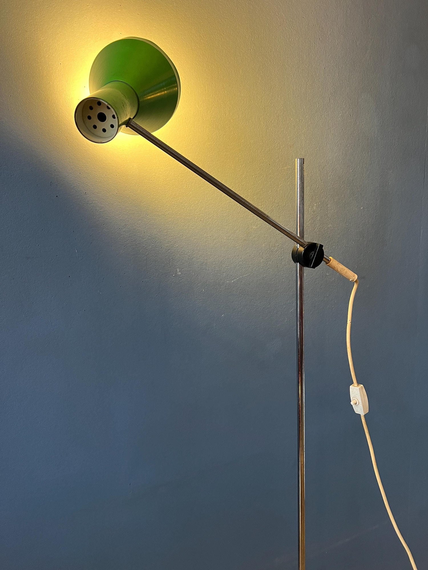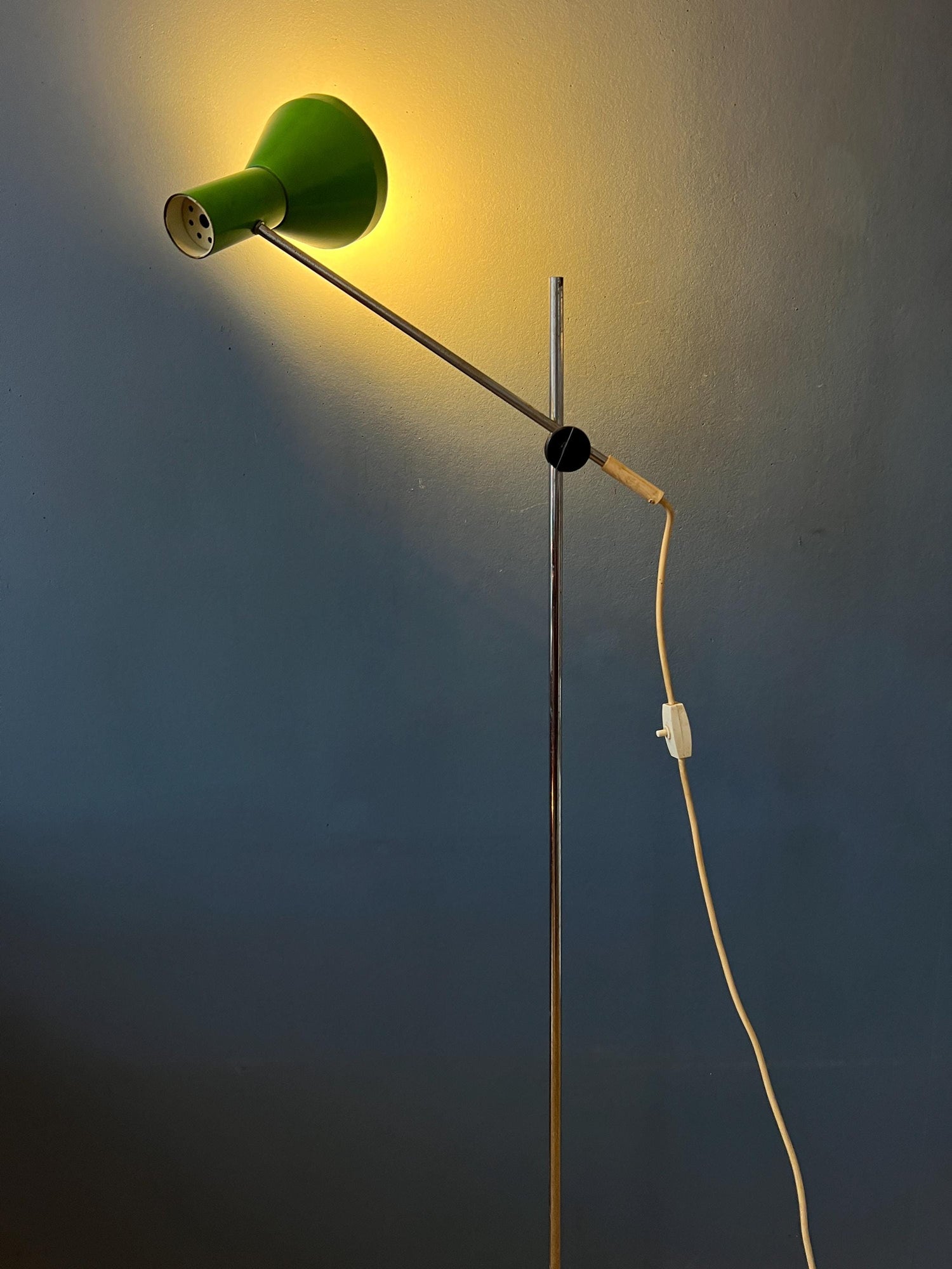 Apple green mid century floor lamp with adjustable arm. The design allows you to position the arm at a different height and width. The lamp requires one E27/26 lightbulb and currently has a EU-plug.