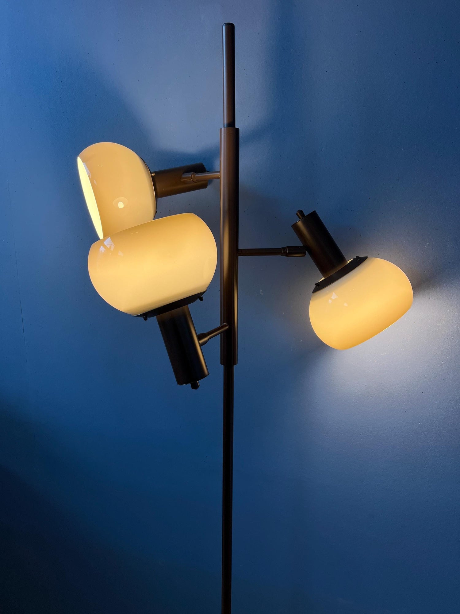 Very rare space age mushroom floor lamp by Dijkstra. The three plexiglass mushroom shades can be turned in any direction desirable. The lights can switched on simultaneously or separately. The lamp requires three E27/26 lightbulbs and currently has an EU-plug.