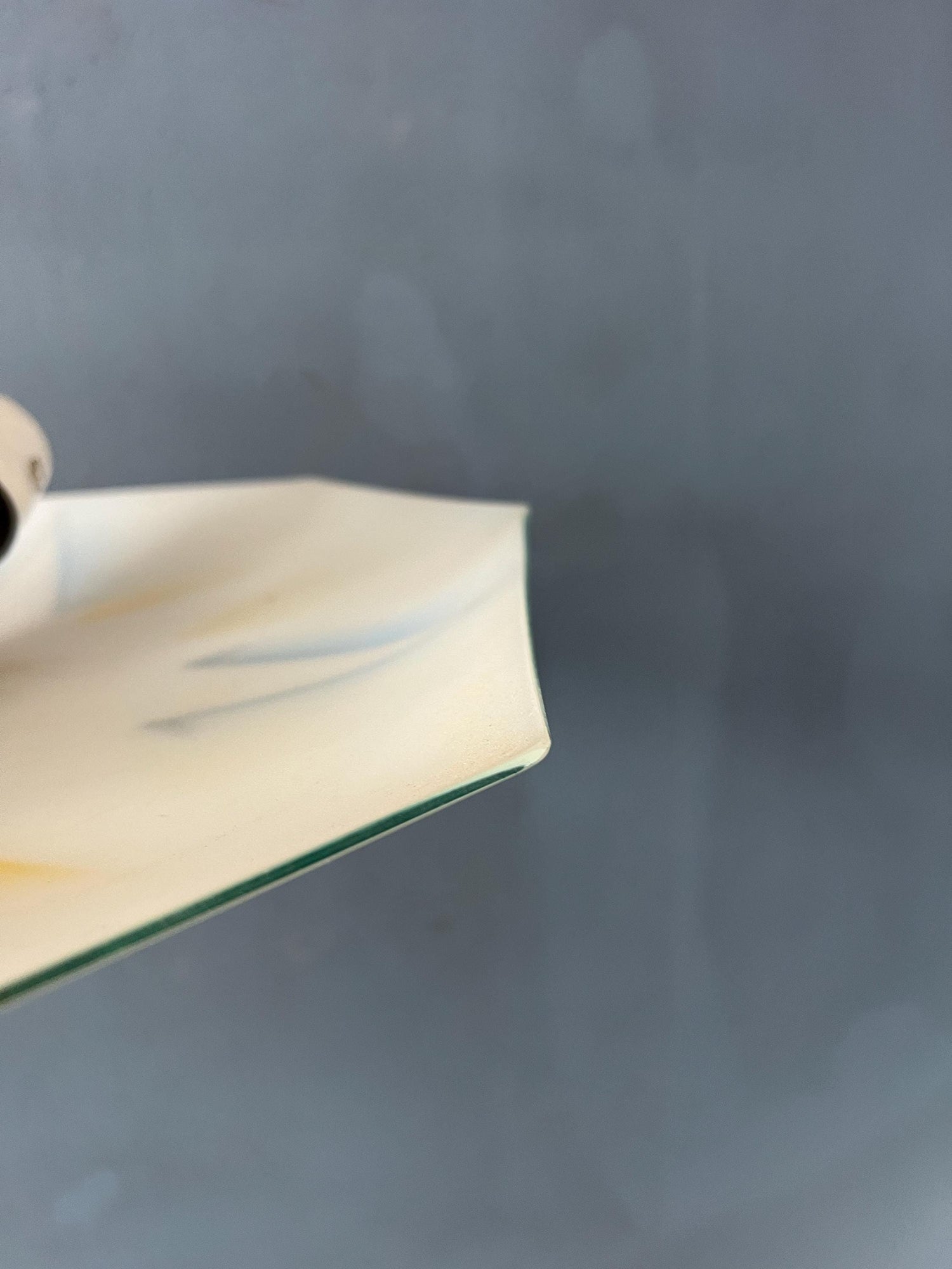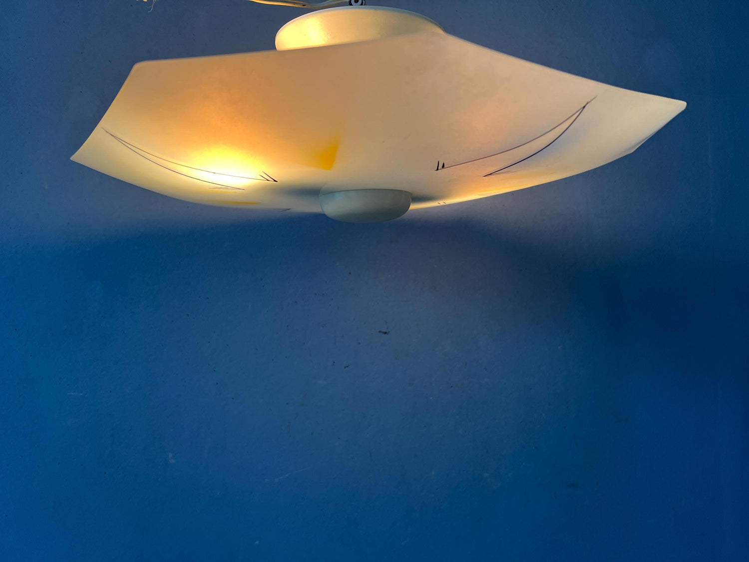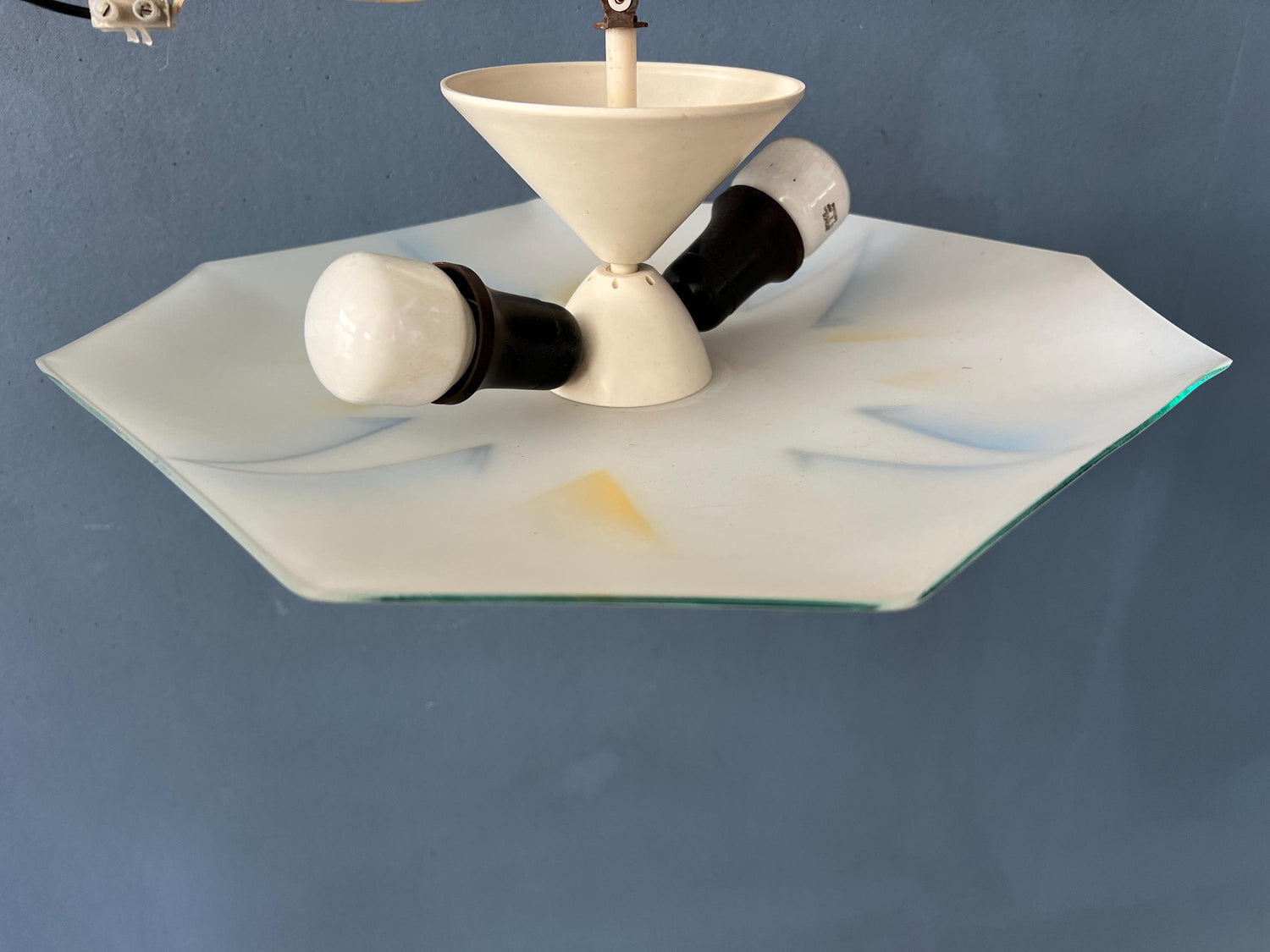 Mid century glass ceiling lamp, The piece is made out of glass and some blue and yellow colours. The lamp requires 2 small E26/27 lightbulbs and is currently hardwired.