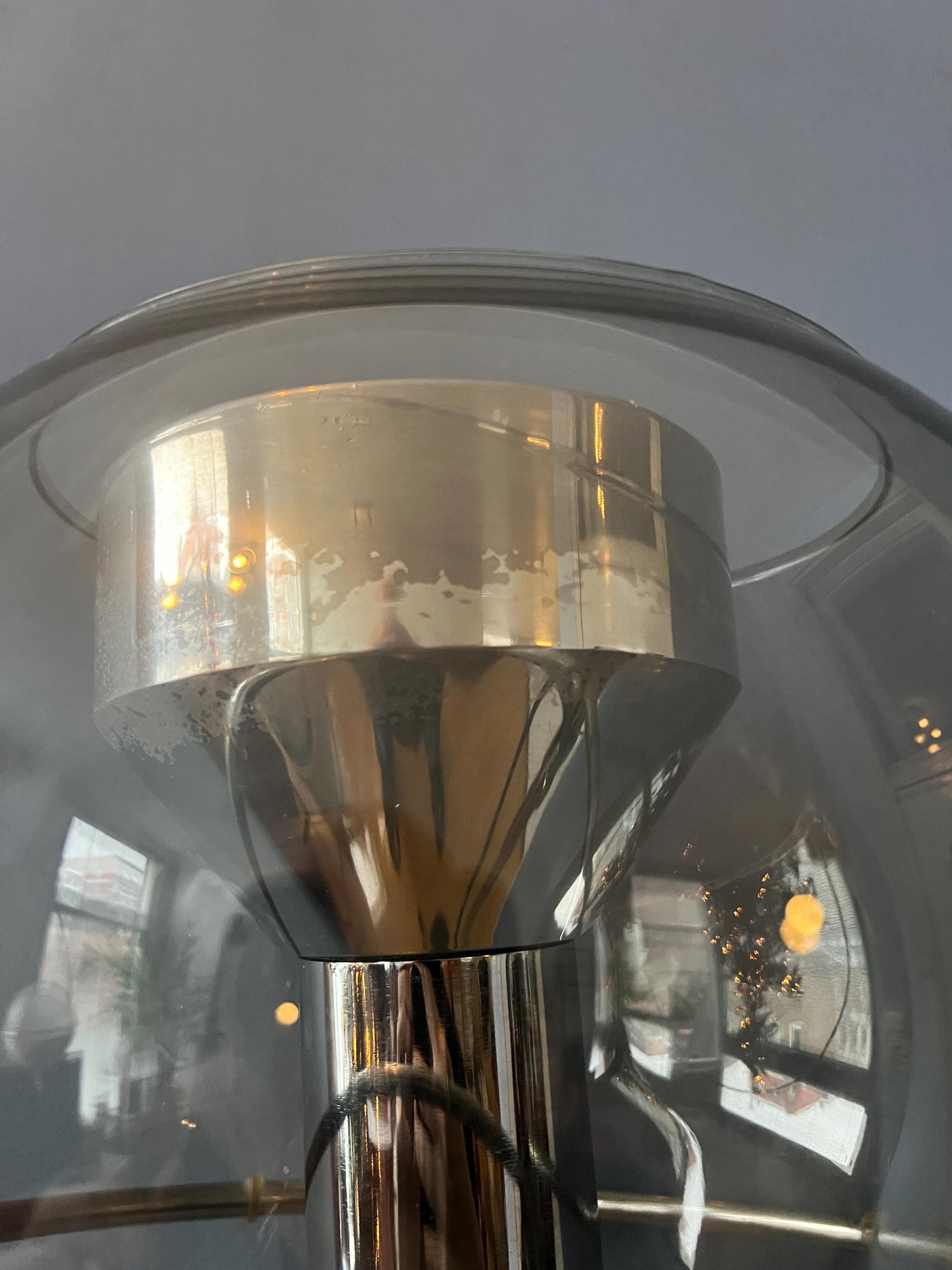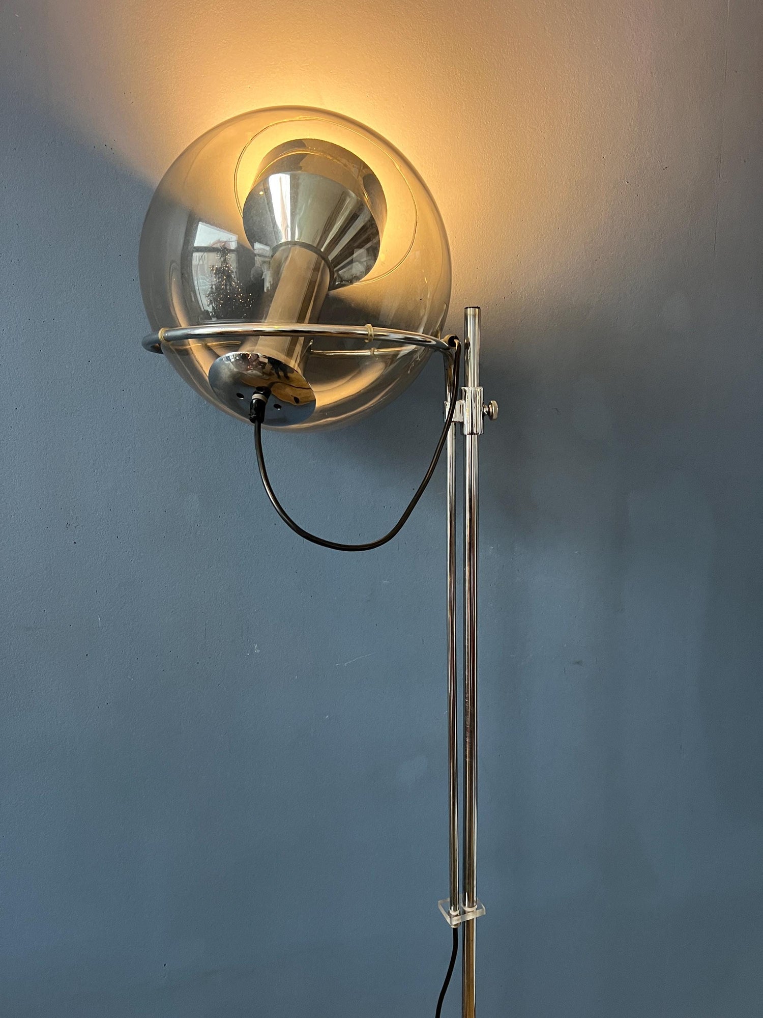 Stunning very rare space age eyeball floor lamp by GEPO with clear glass 'globe' shade. The design allows you to position the eyeball shade in any position desirable. The height of the lamp can be easily adjusted by moving the parallel pole up or down. The globe is made out of glass and has an aluminium inner shade with chrome coating. The lamp requires one E26/27 lightbulb and currently has an EU-plug (easily used outside EU with plug-converter).