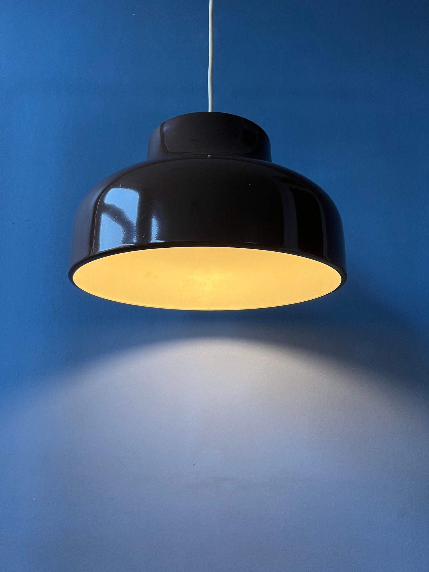 Mid century pendant light made in brown lacquered metal. The lamp requires one E27/26 lightbulb.