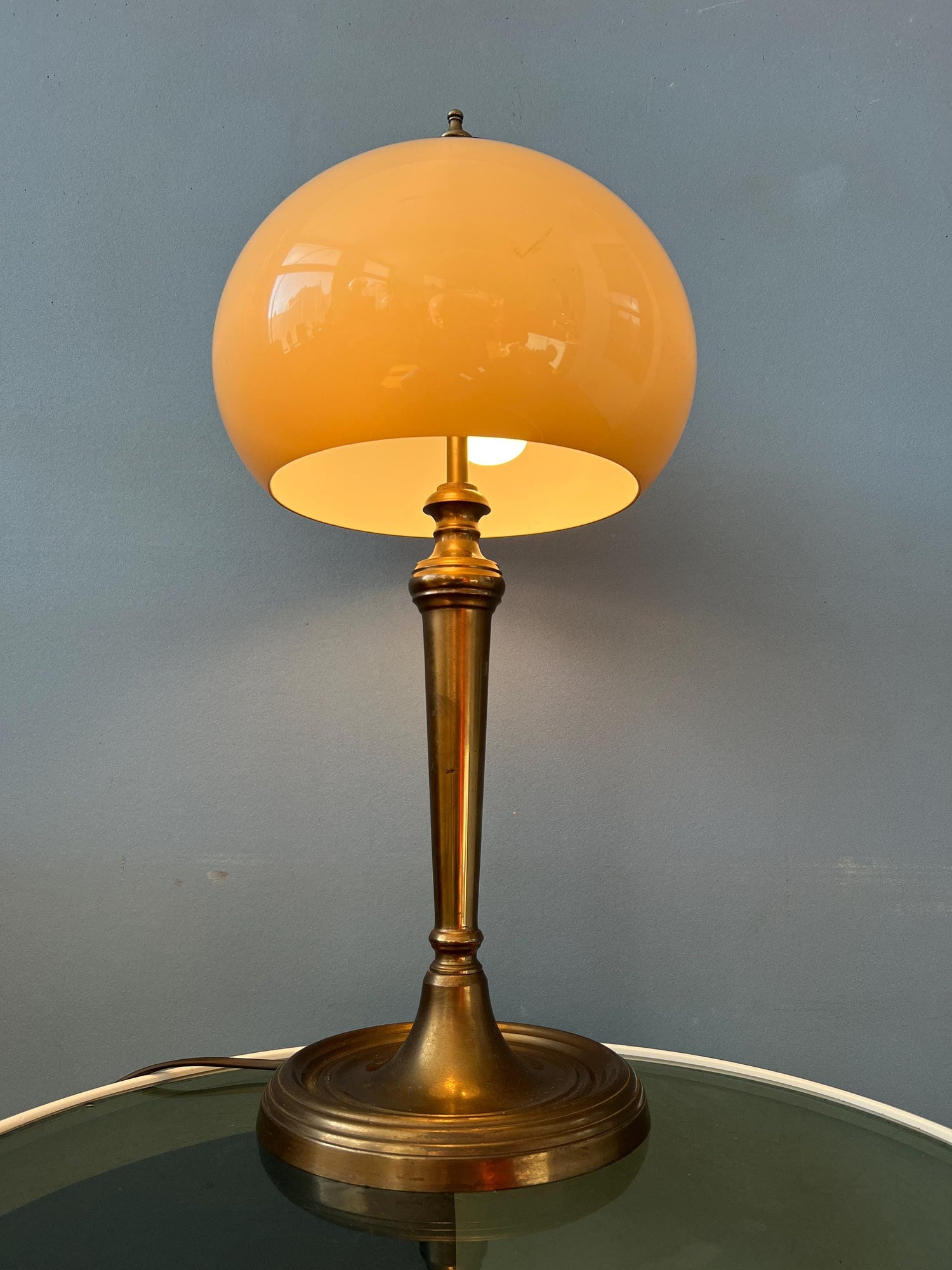 Unique vintage mushroom table lamp with plexiglass shade and brass base. The beige/brown mushroom shades produces a warm and cosy light. The lamp requires two E27 lightbulbs and currently has an EU-plug.