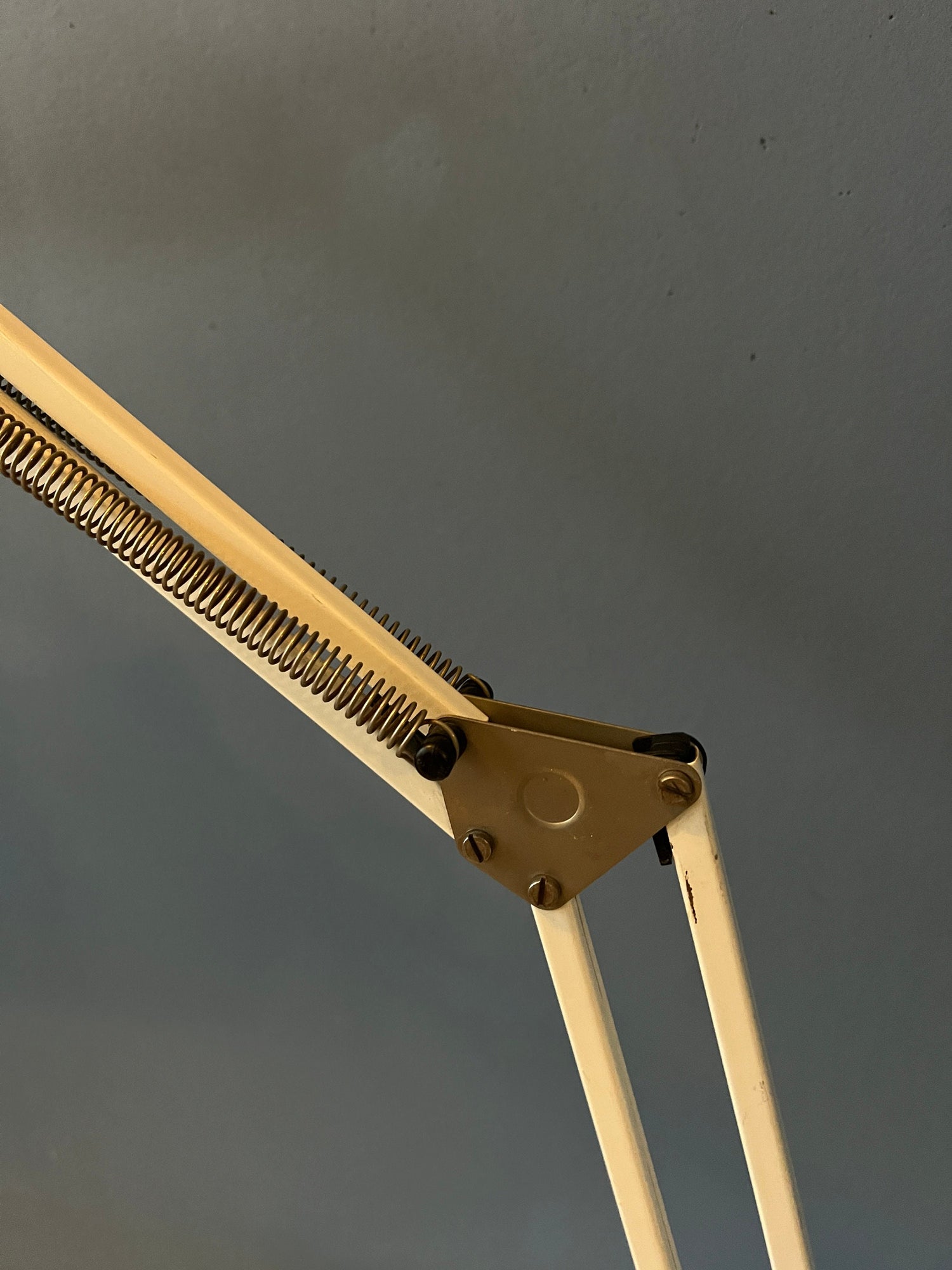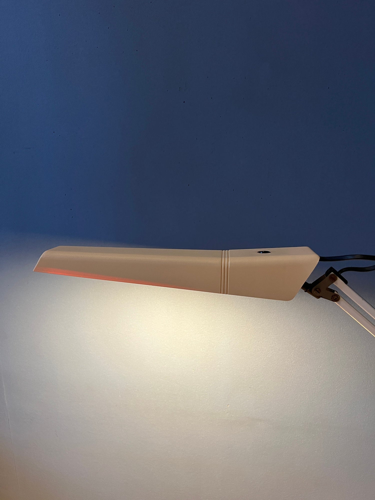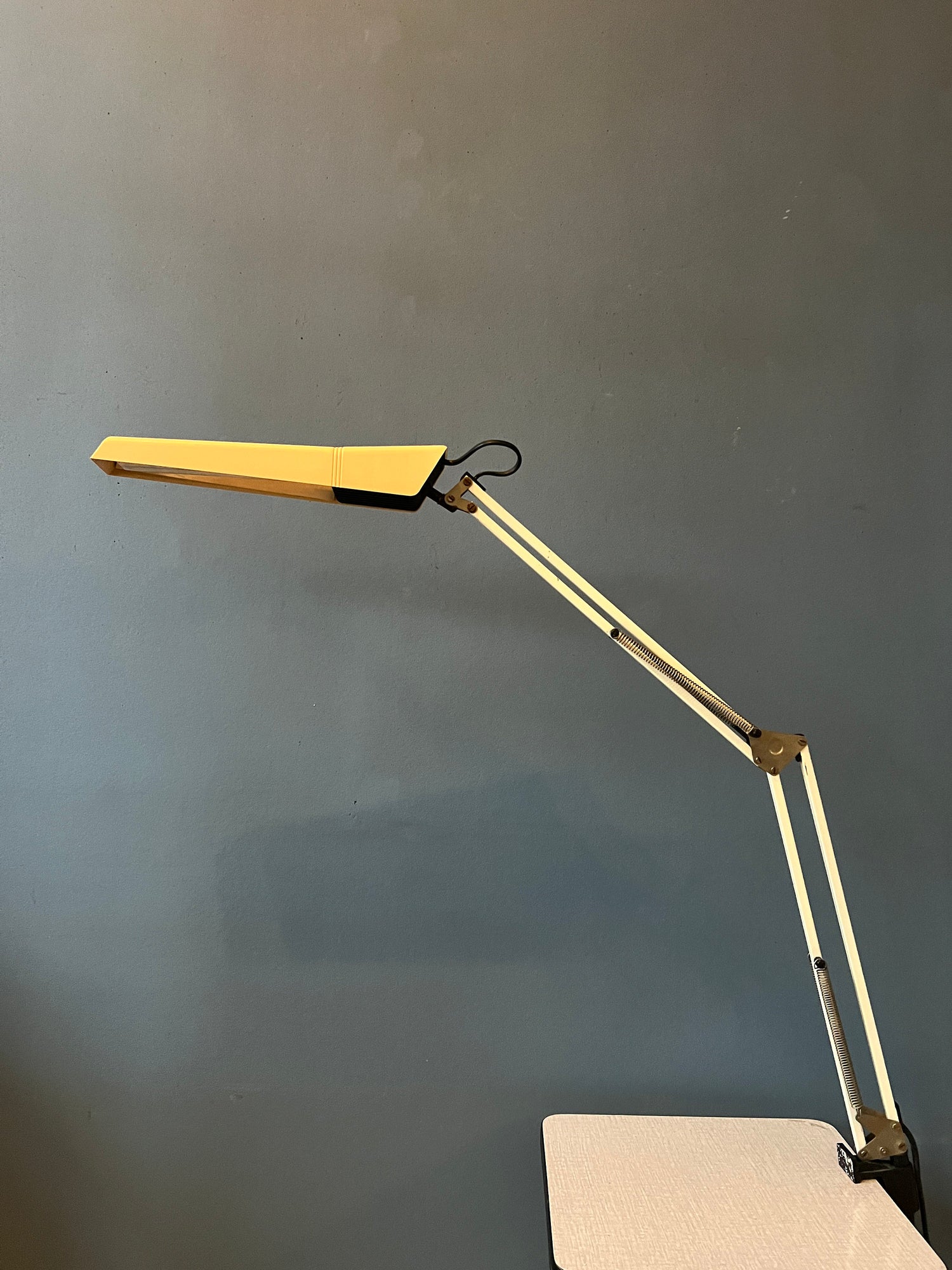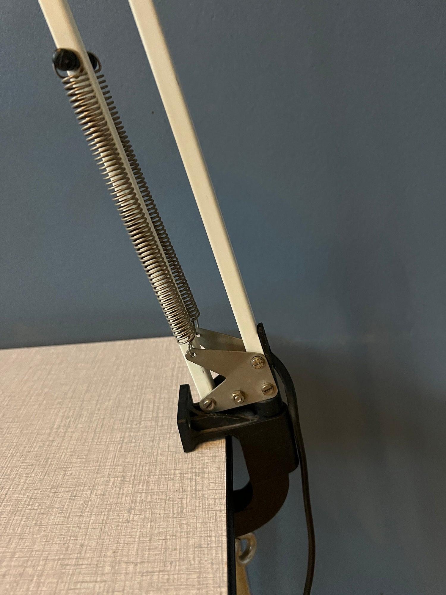 Vintage office desk lamp with clamp mechanism. The arm be adjusted in any way desirable. Also the shade it self can move. The lamp requires an E27/26 bulb and currently has an EU-plug (easily used outside EU with plug converter).