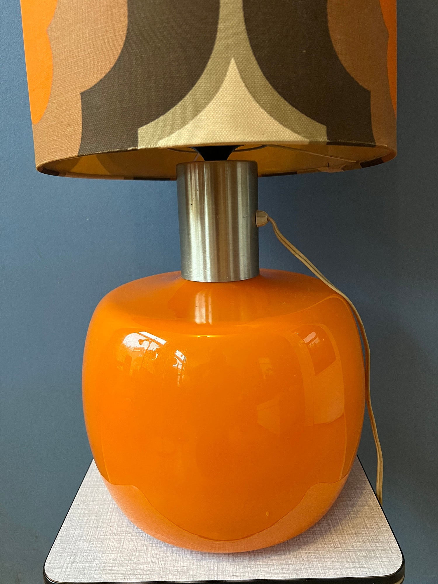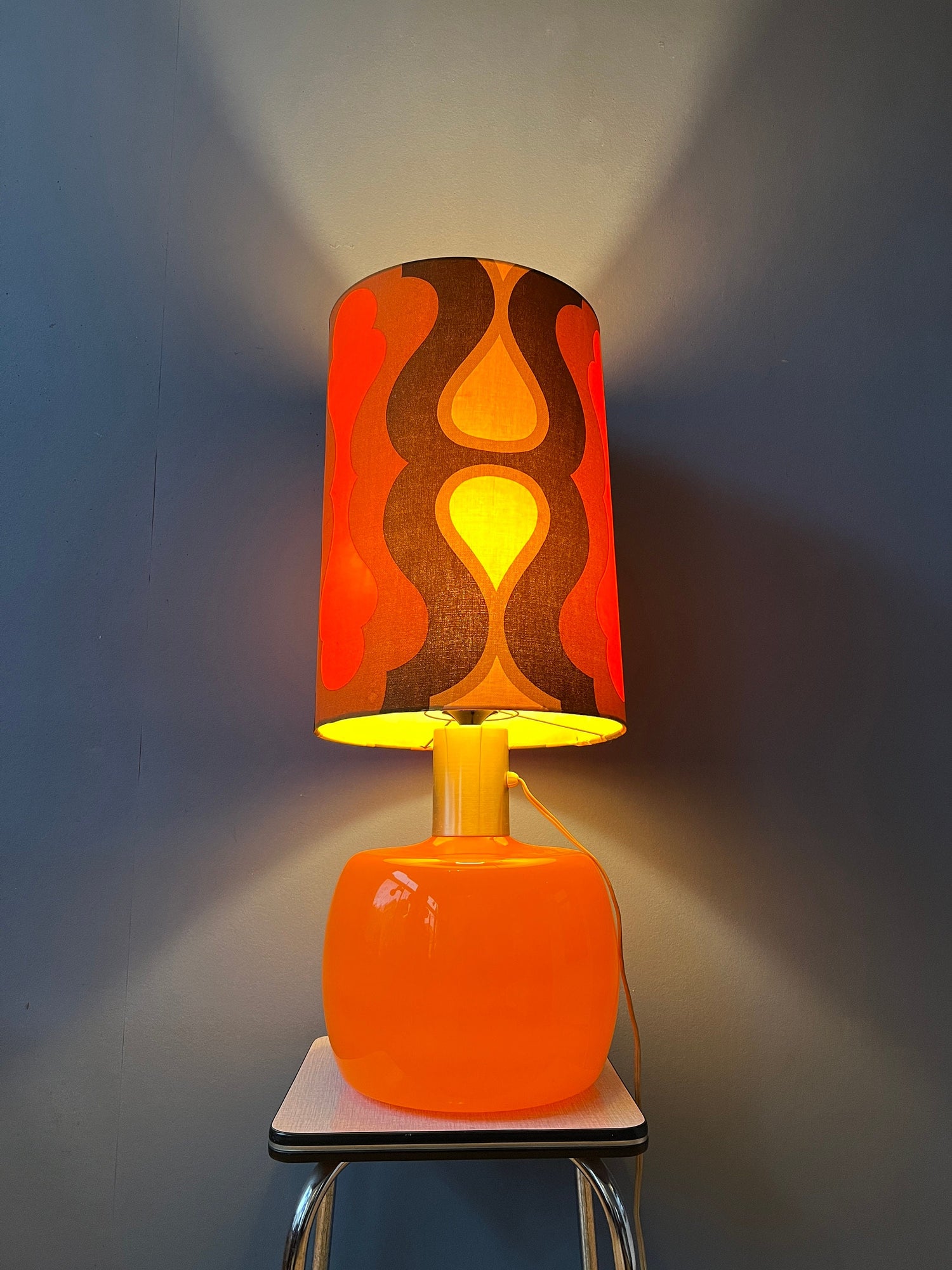 Big vintage space age table lamp with orange glass base and a shade with flower patterns, reminding of the west germany style. The lamp requires one E27/26 lightbulb and currently has an EU-plug.