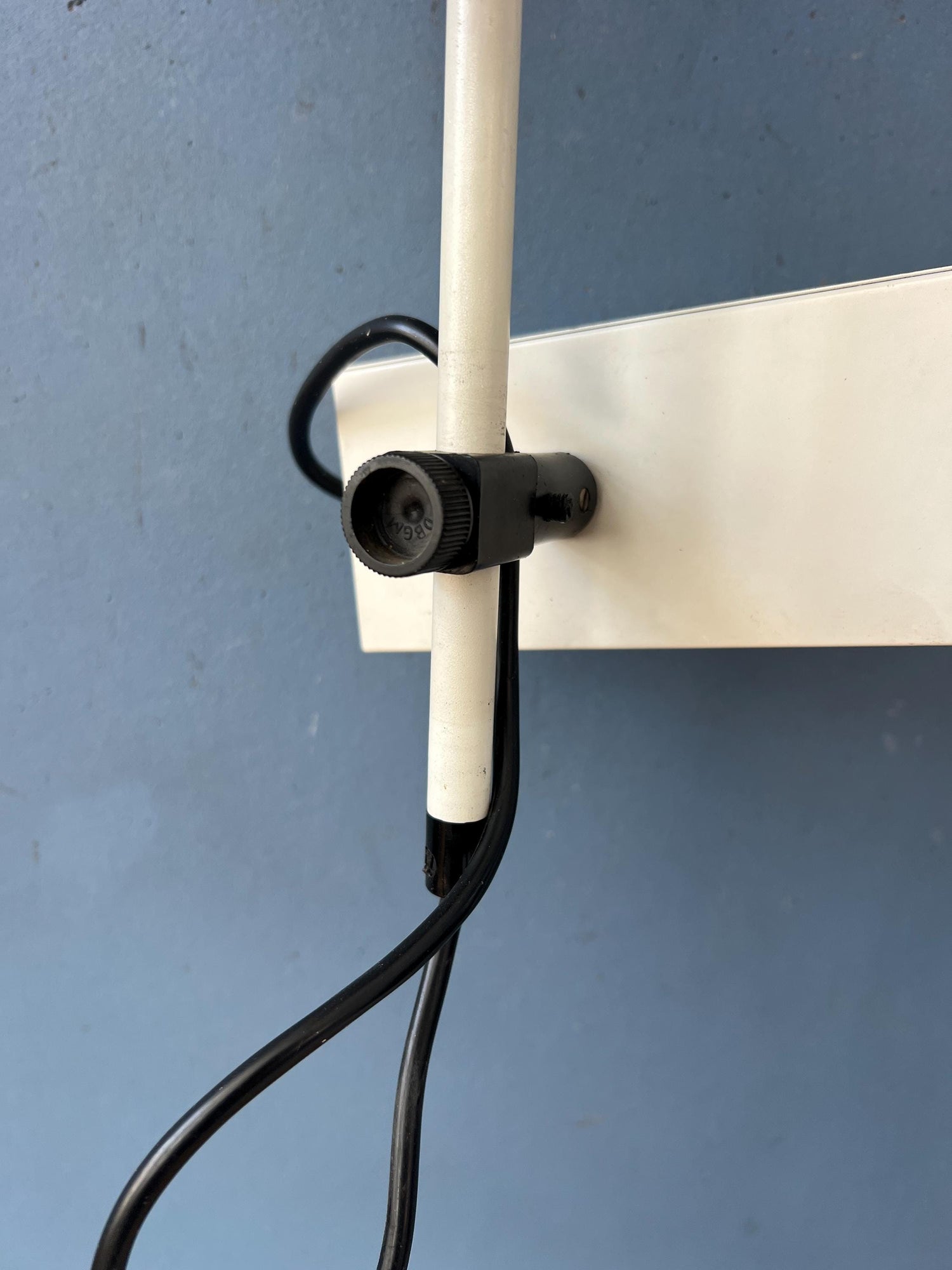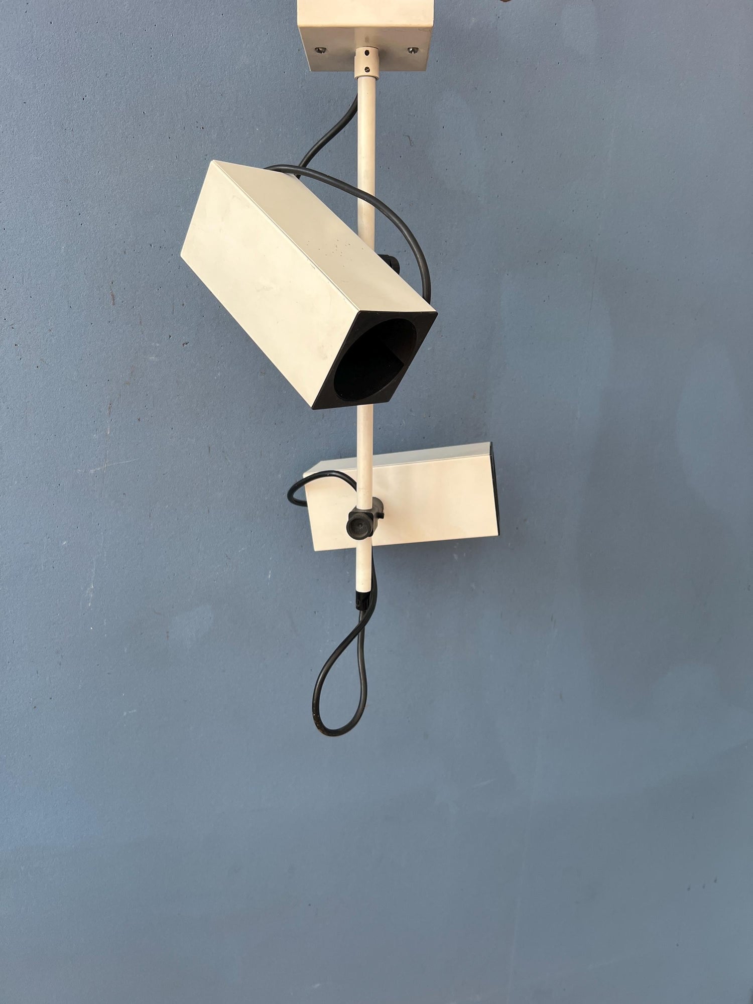 Philips vintage downrod ceiling lamp with 2 rectangular spots. The metal spots easily be redirected. The lamp requires two small E27/26 (standard) lightbulbs.