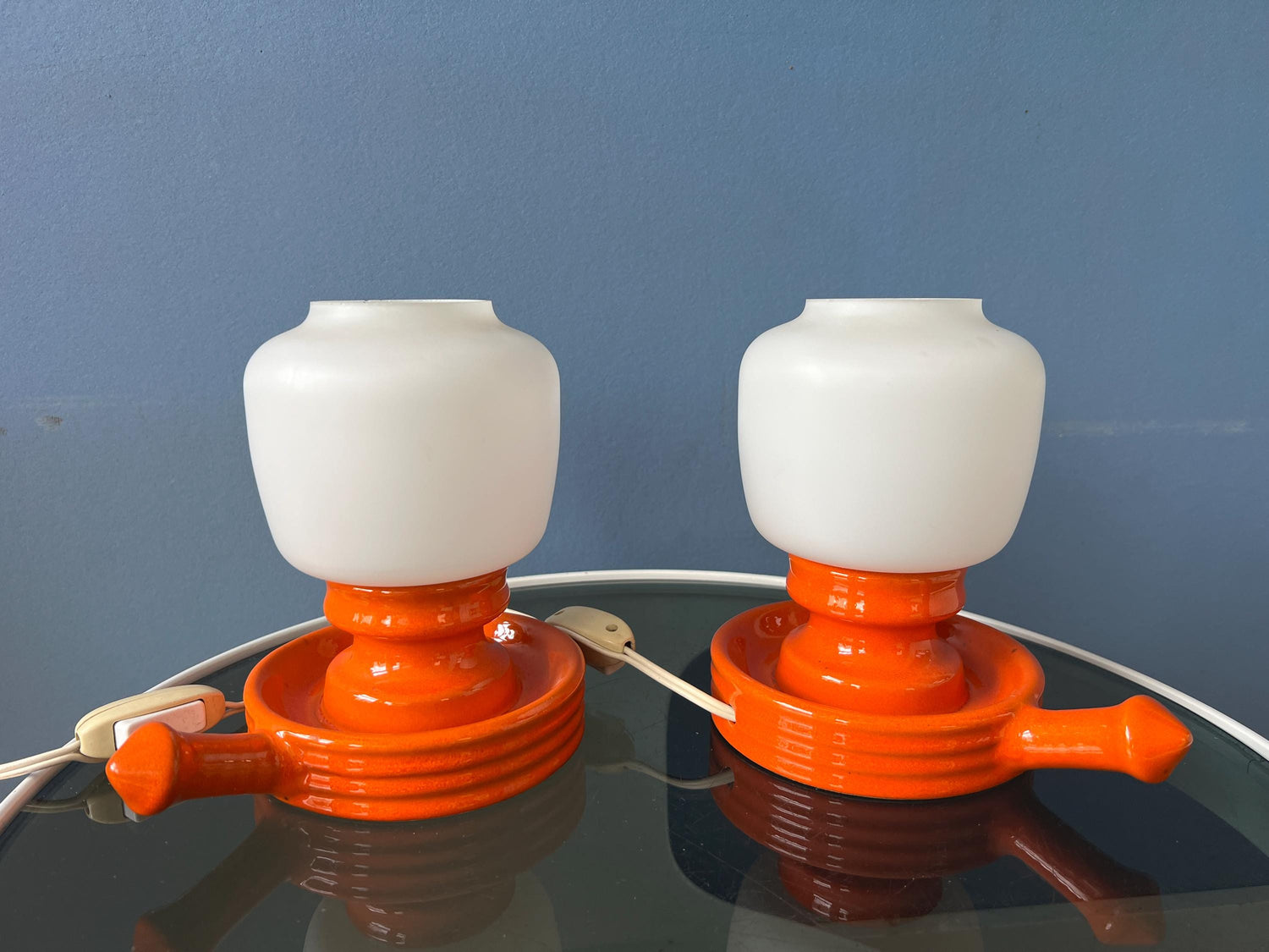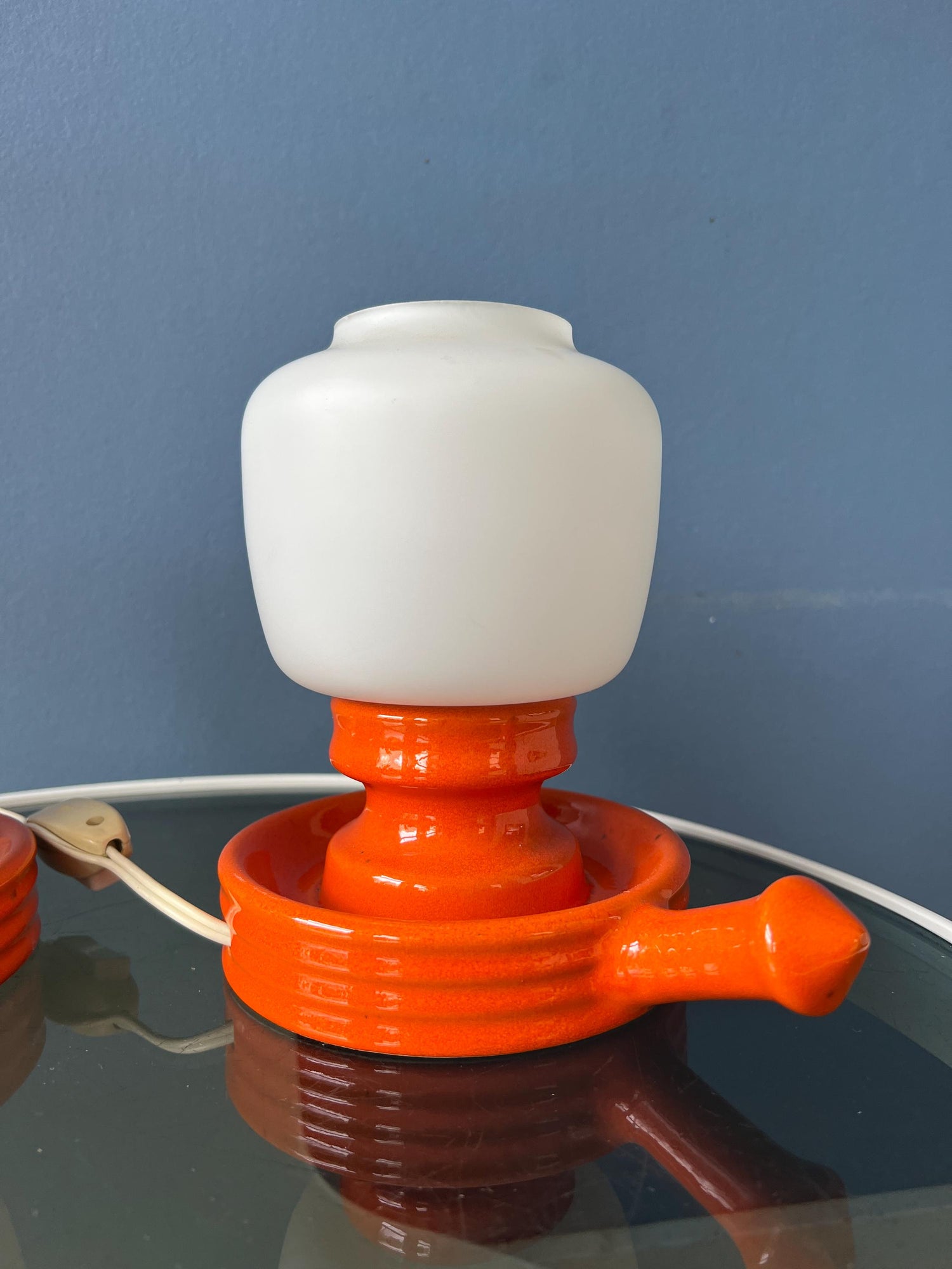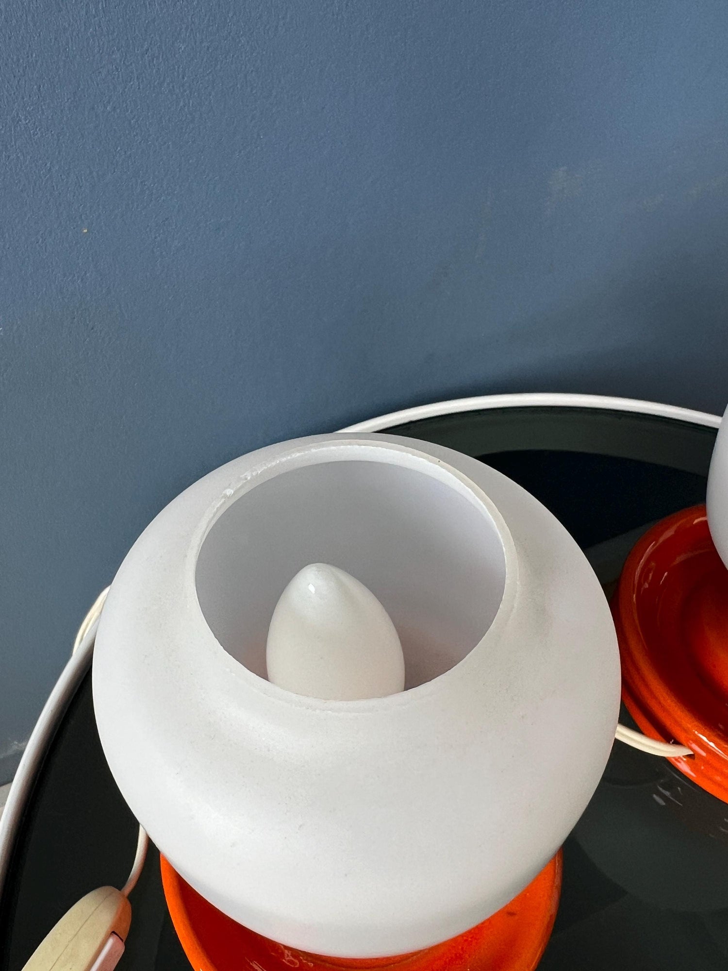 A set of ceramic pop-art table lamps with opaline glass shades. The glass shades are mat white and the base is orange ceramic. The lamps require one E14 lightbulb each and currently have EU-plugs (easily used outside EU with plug-converter).
