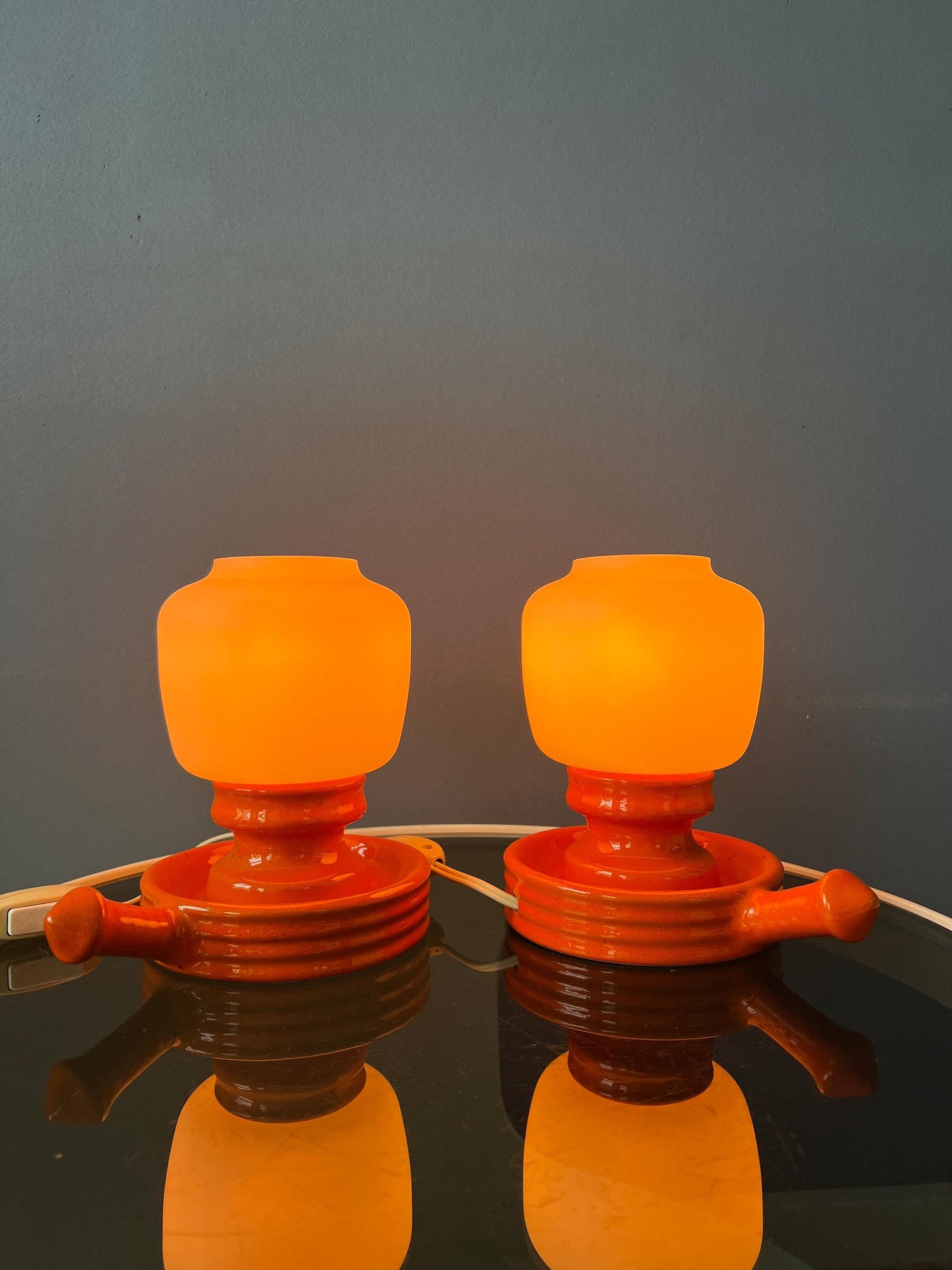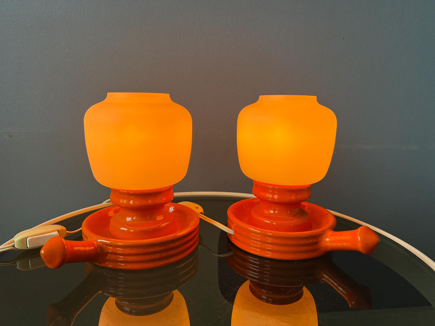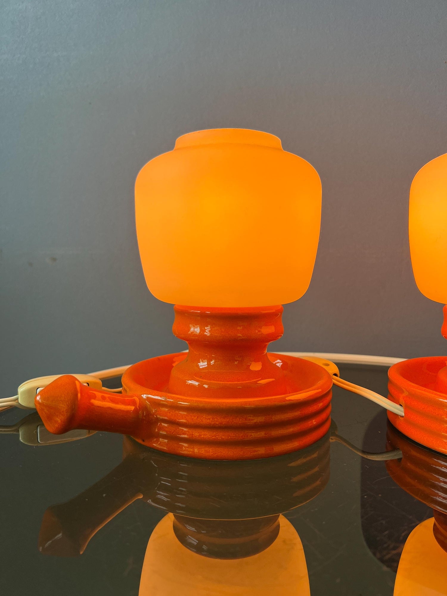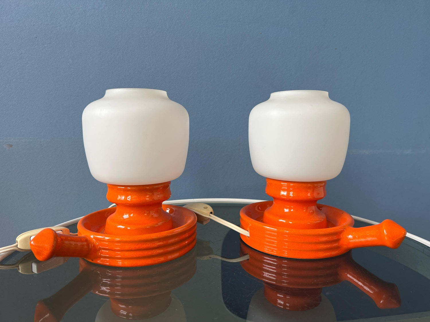 A set of ceramic pop-art table lamps with opaline glass shades. The glass shades are mat white and the base is orange ceramic. The lamps require one E14 lightbulb each and currently have EU-plugs (easily used outside EU with plug-converter).