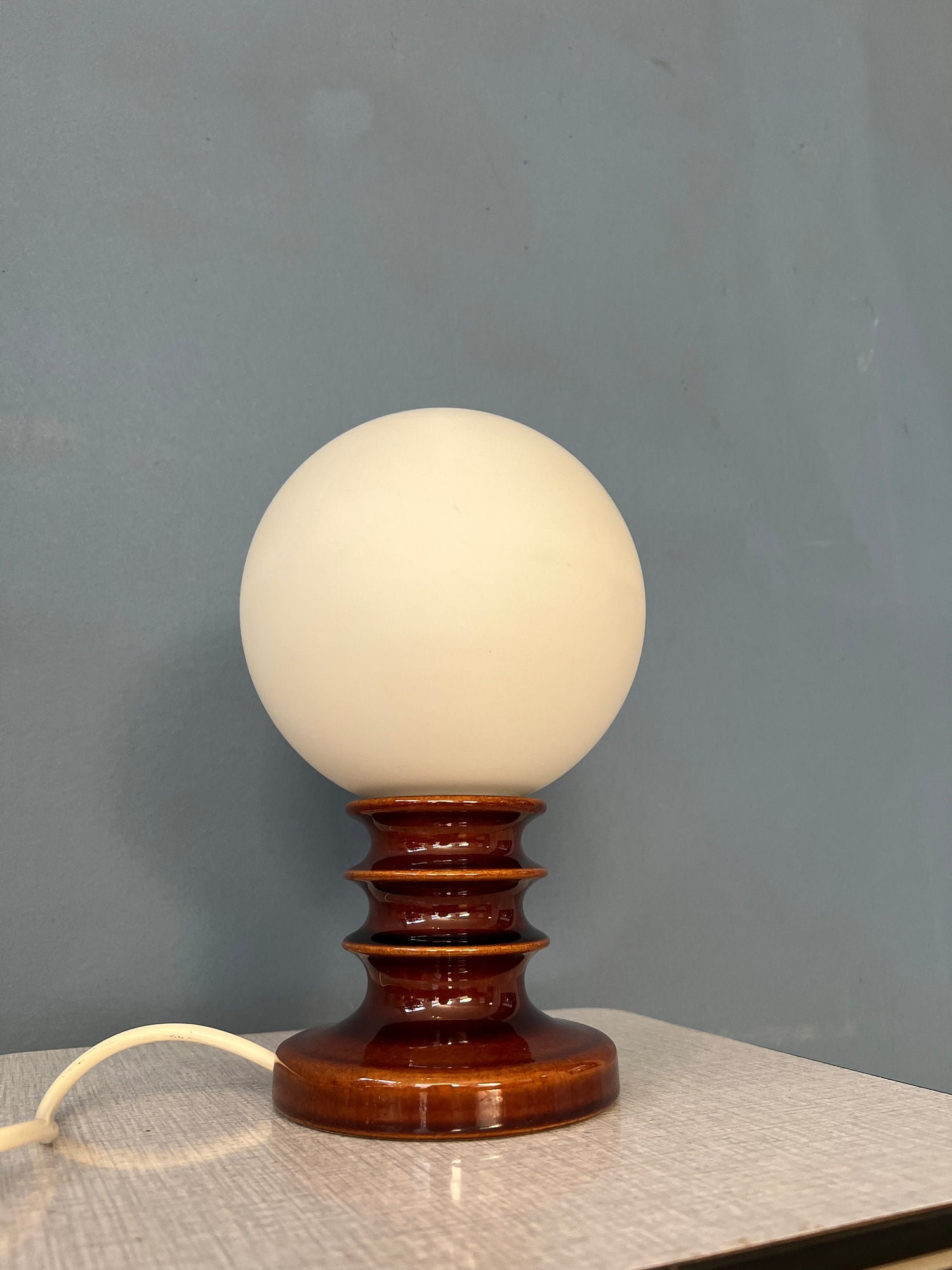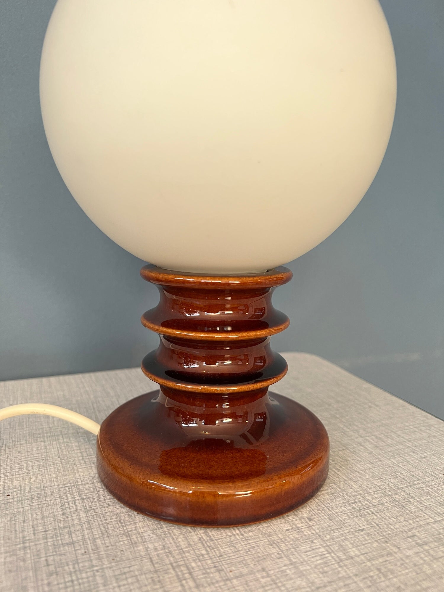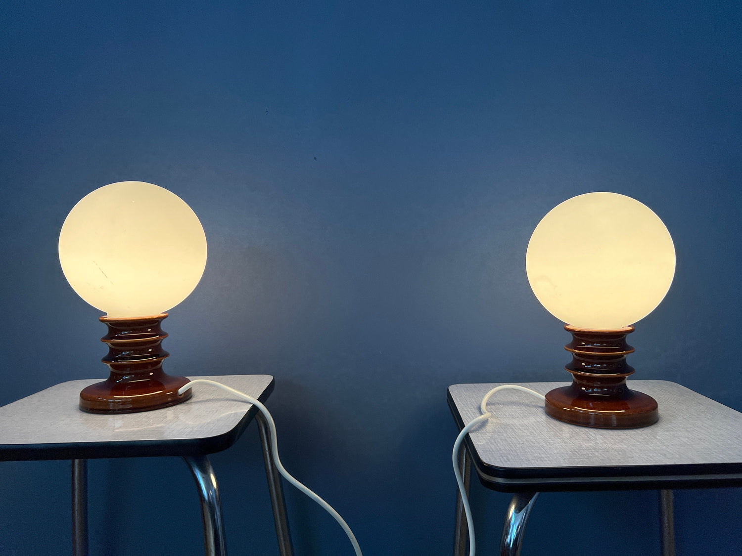 Two small west germany ceramic table lamps with opaline glass shades. The lamps requires one E14 lightbulb each and currently have EU-plugs.