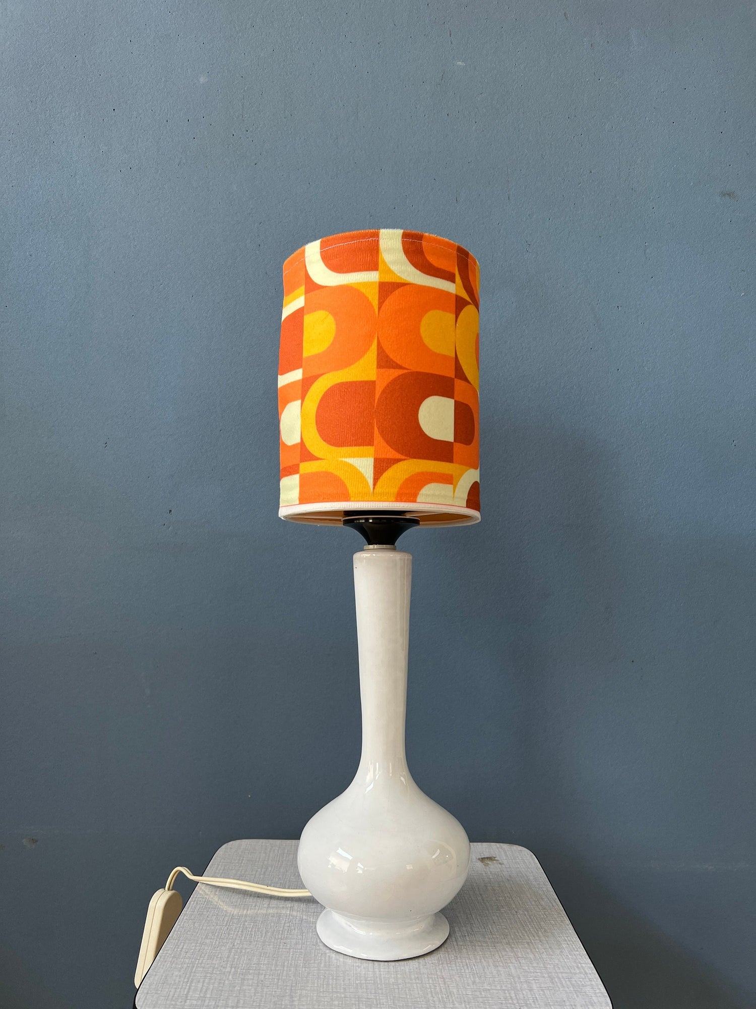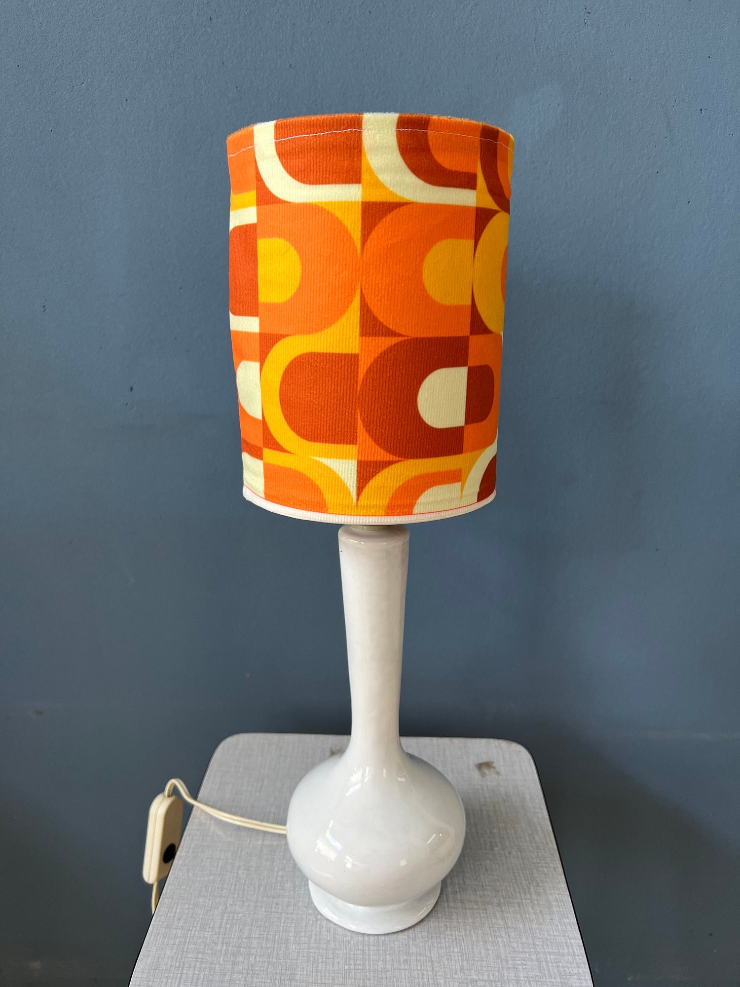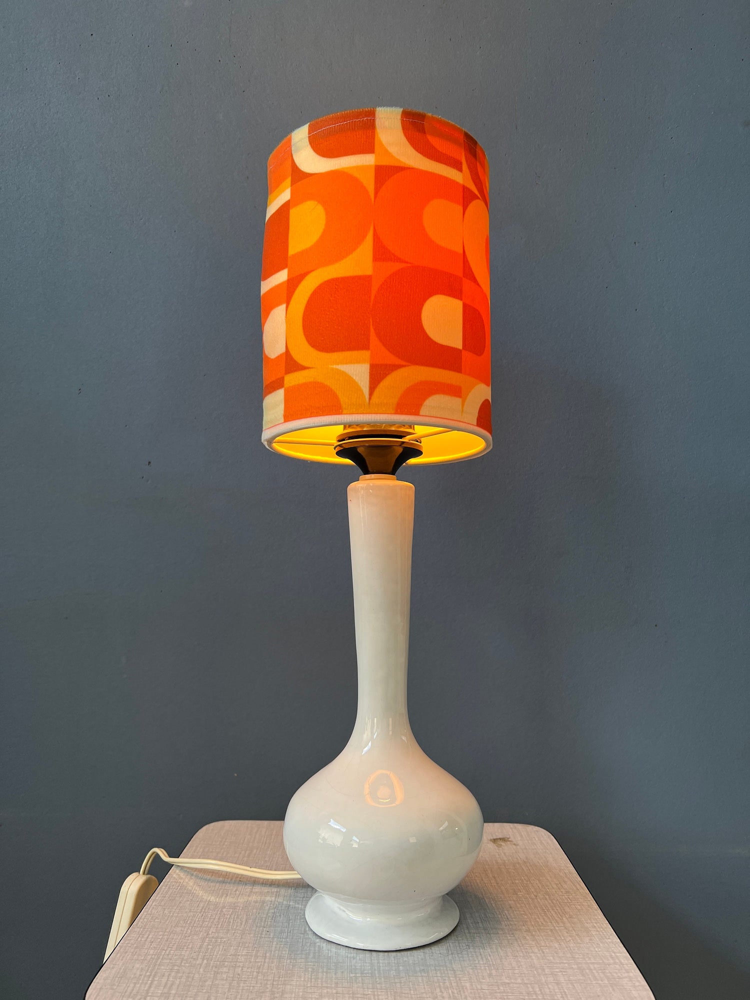 A small vintage space age table lamp with orange shade and porcelain base. The lamp requires one E27 lightbulb and currently has an EU-plug.