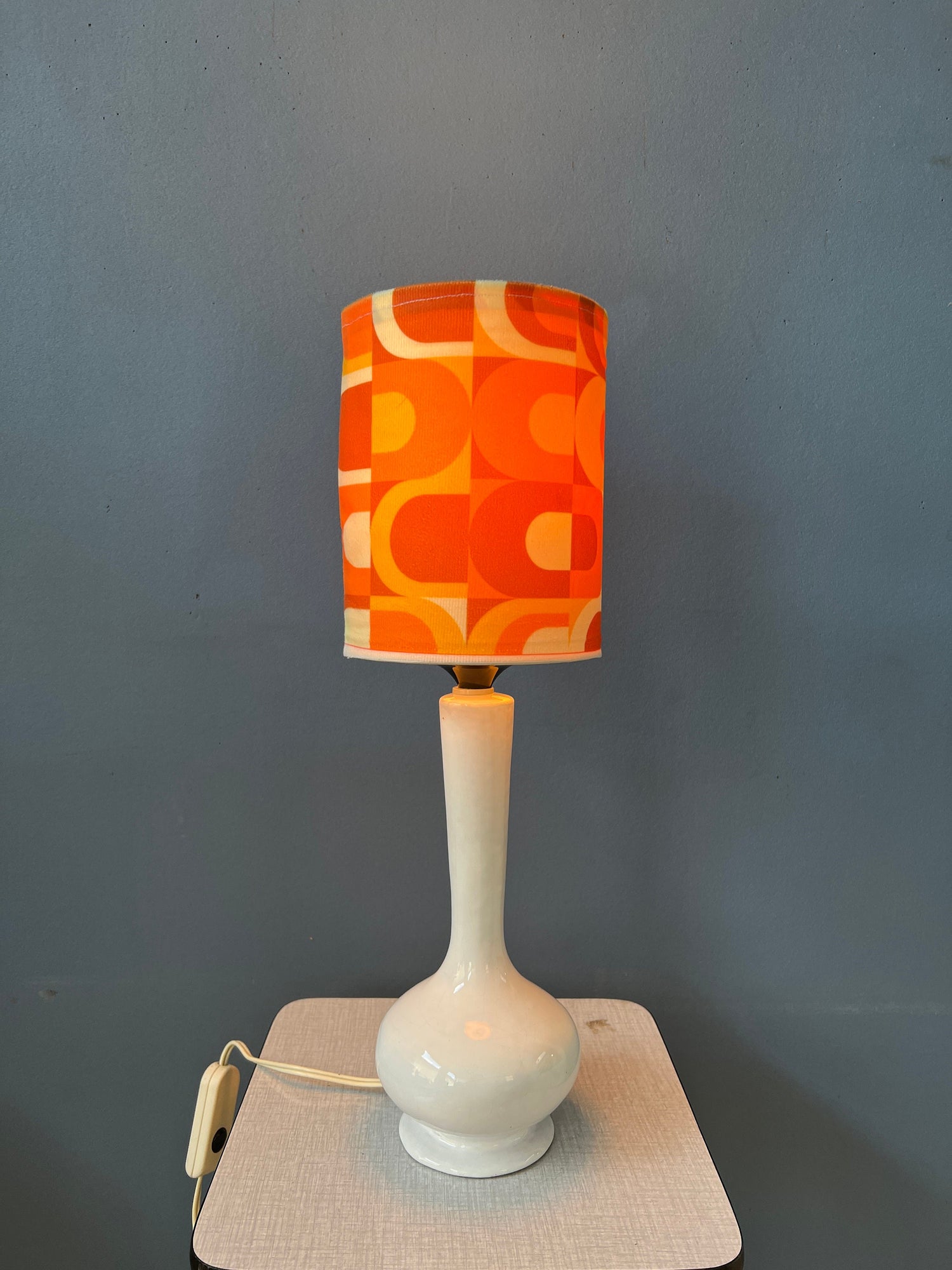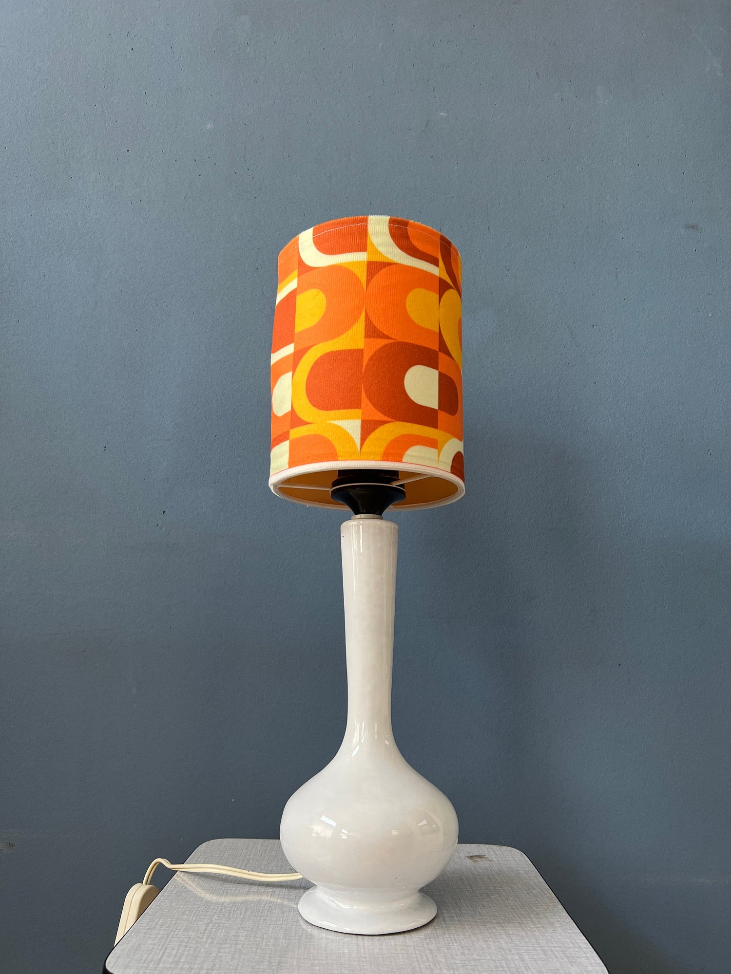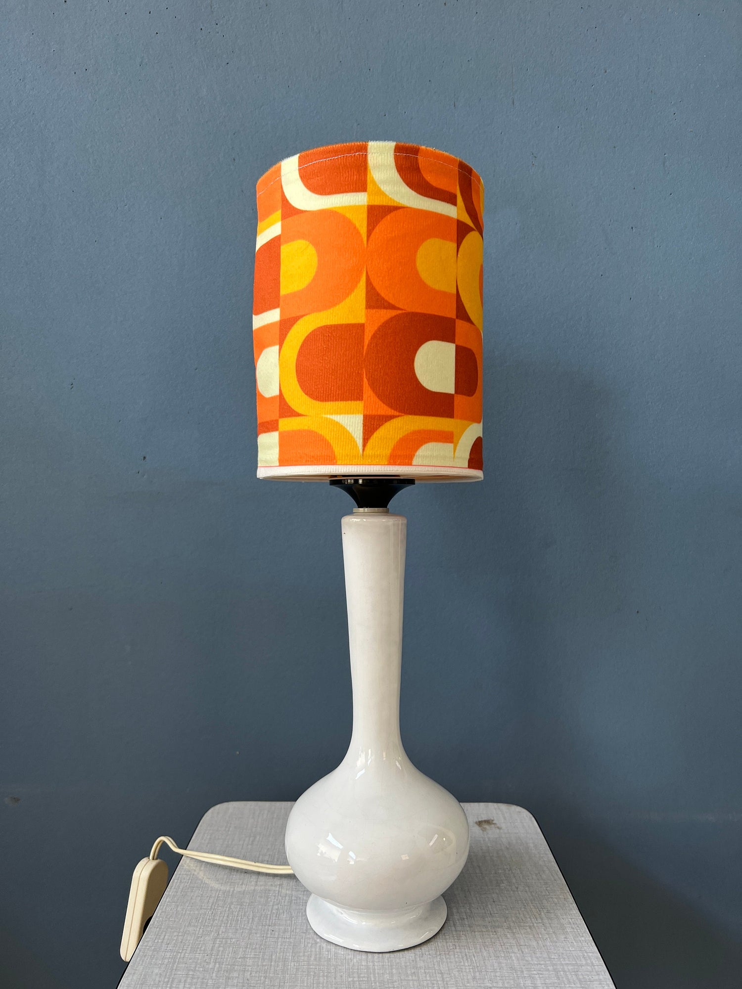 A small vintage space age table lamp with orange shade and porcelain base. The lamp requires one E27 lightbulb and currently has an EU-plug.