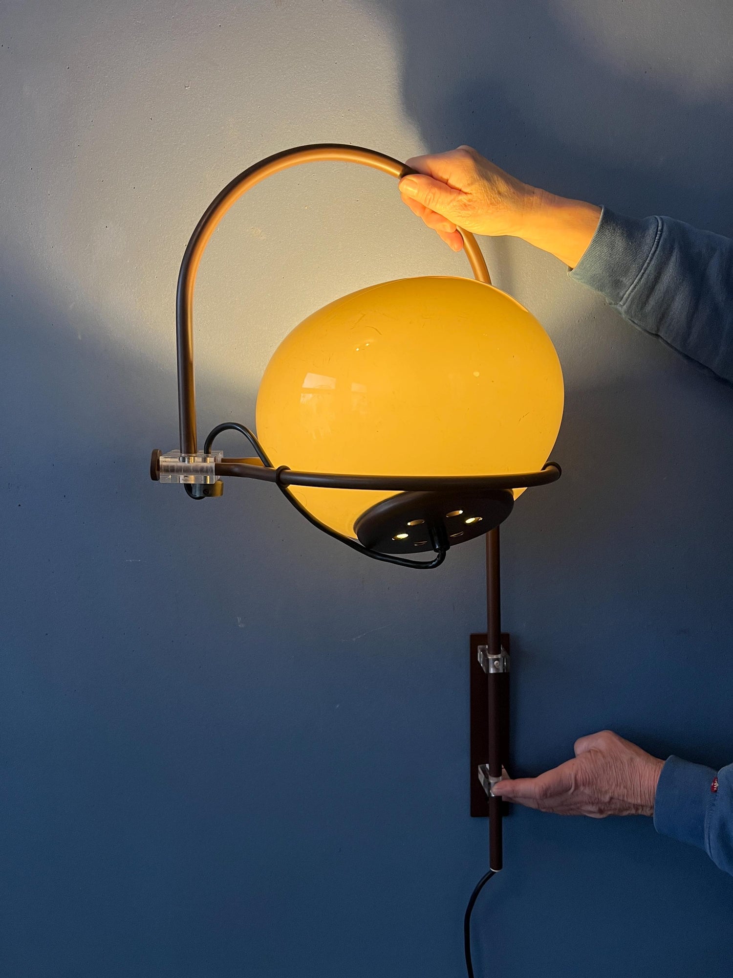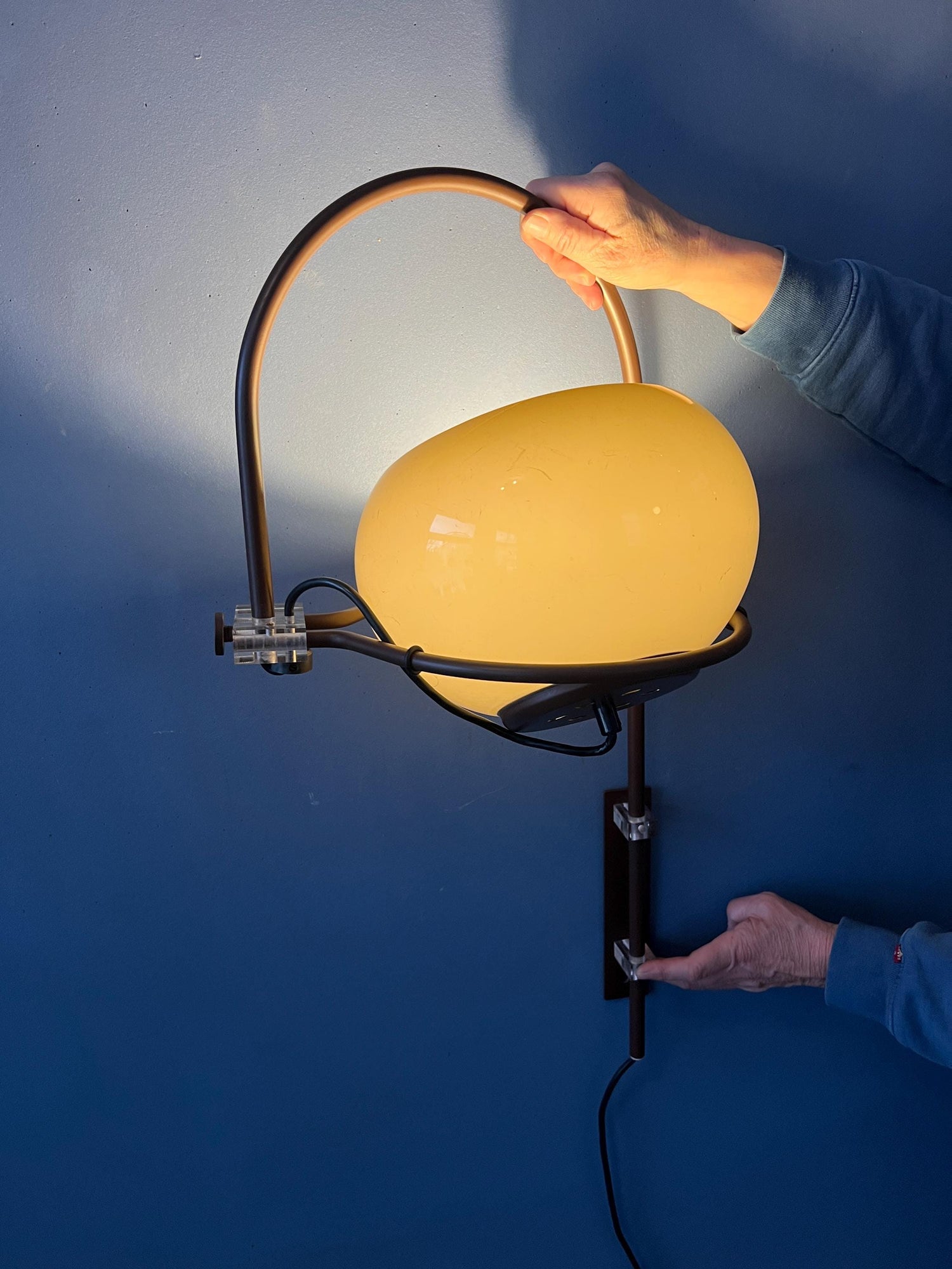 Classic Herda mushroom arc wall lamp with a brown frame. The mocca-coloured shade produces a warm light and can be turned in any direction desirable. The shade can move inside and outside the arc. The arc itself can move left and right from the wall bracket position. The lamp requires an E27 lightbulb and currently has an EU-plug.