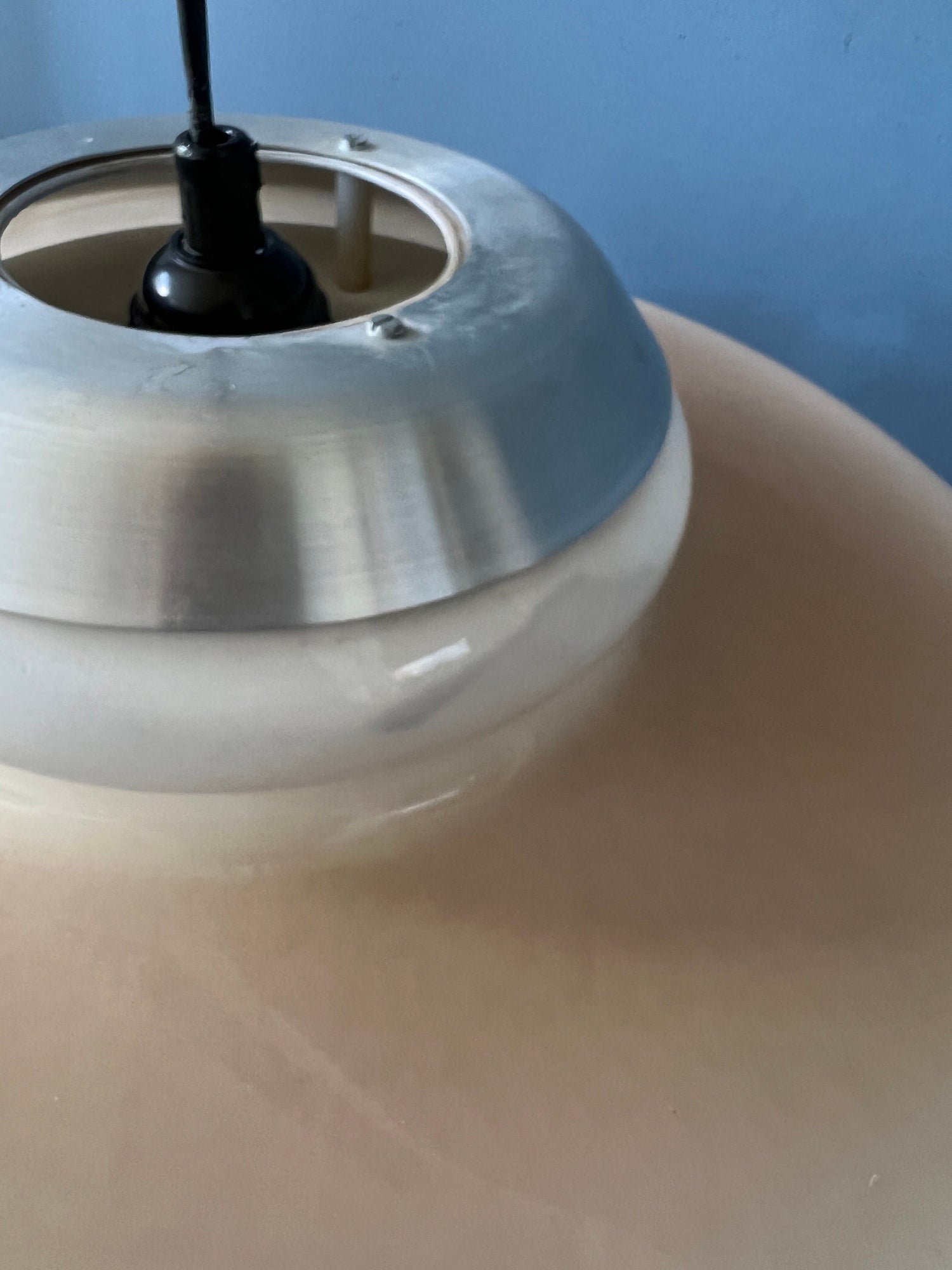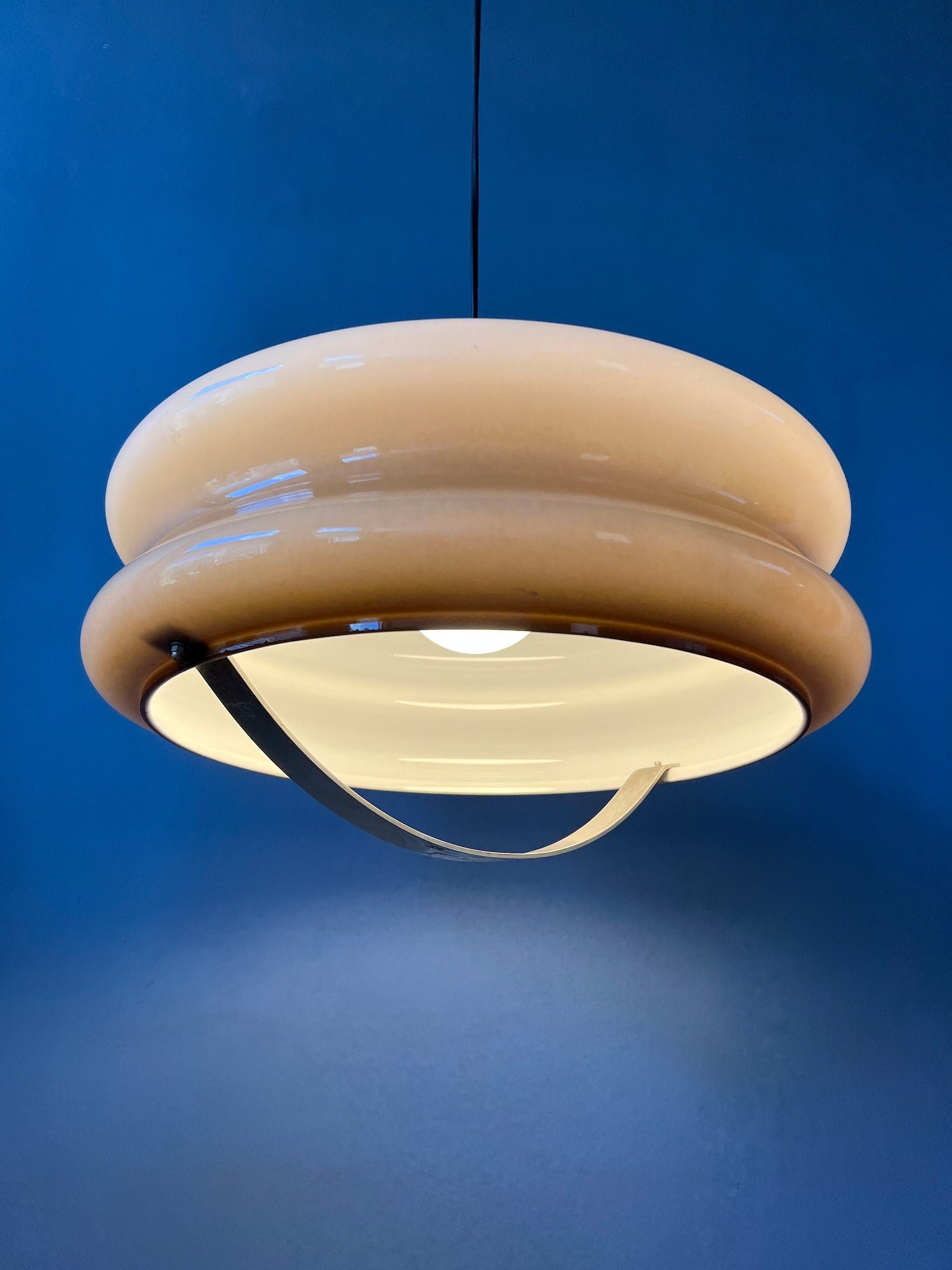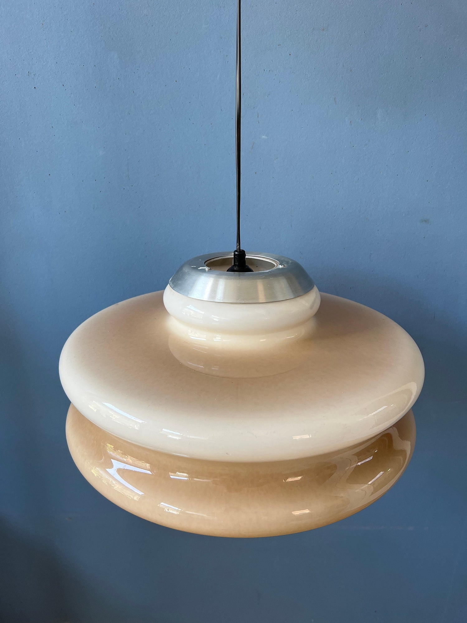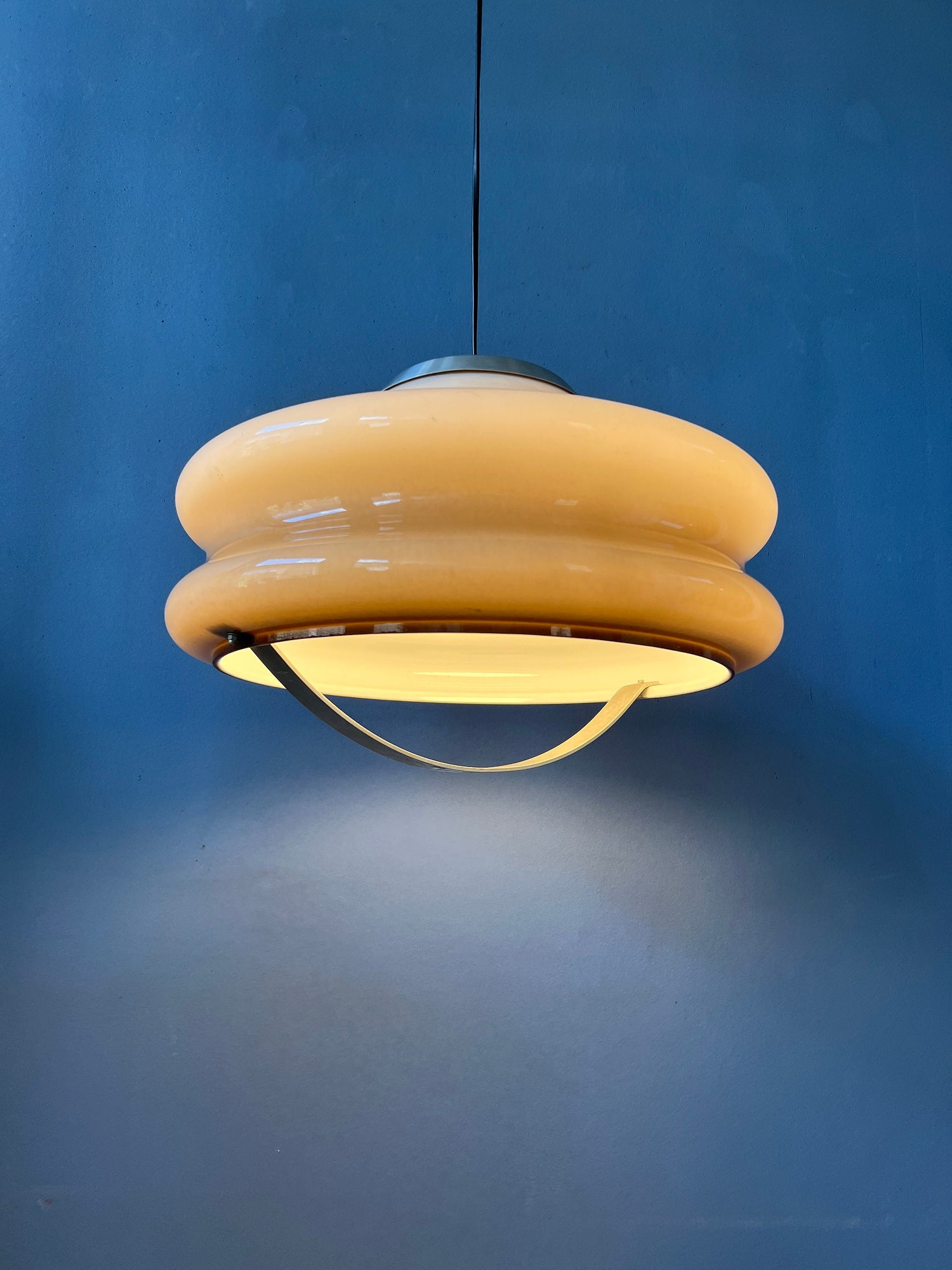 A vintage space age pendant light by Herda with an acrylic glass mushroom shade. The shade has an aluminum 'arc' underneath the shade that reflects the light nicely. The lamp requires one E27 lightbulb.