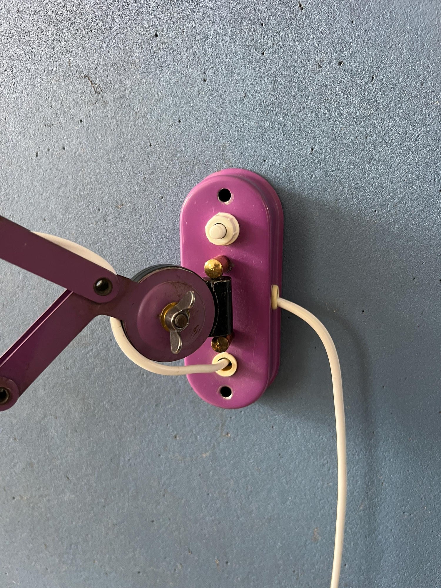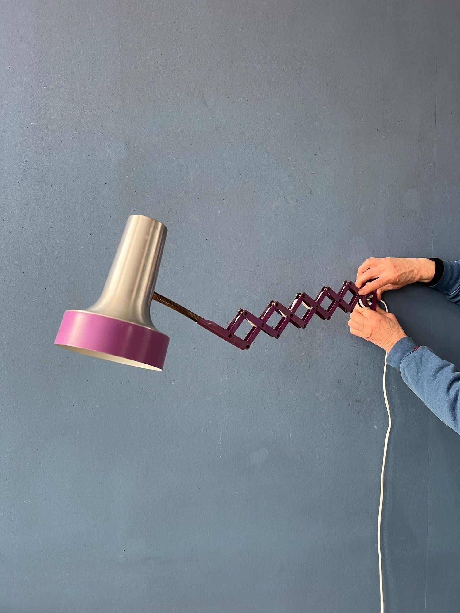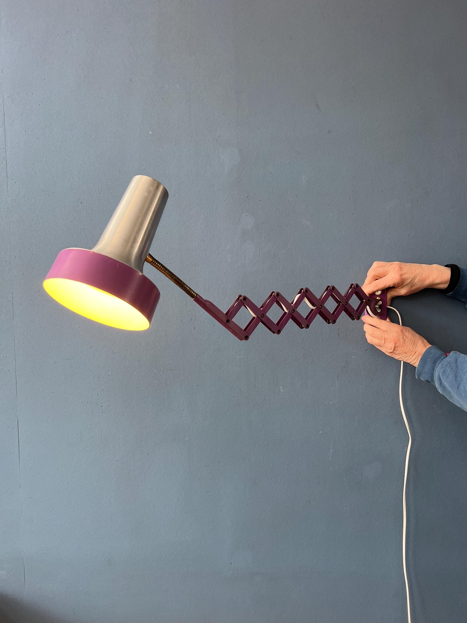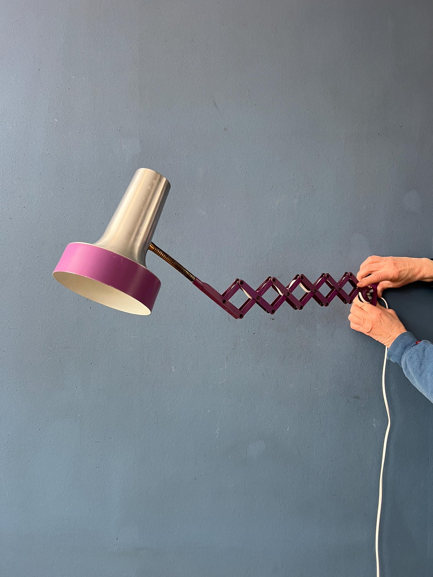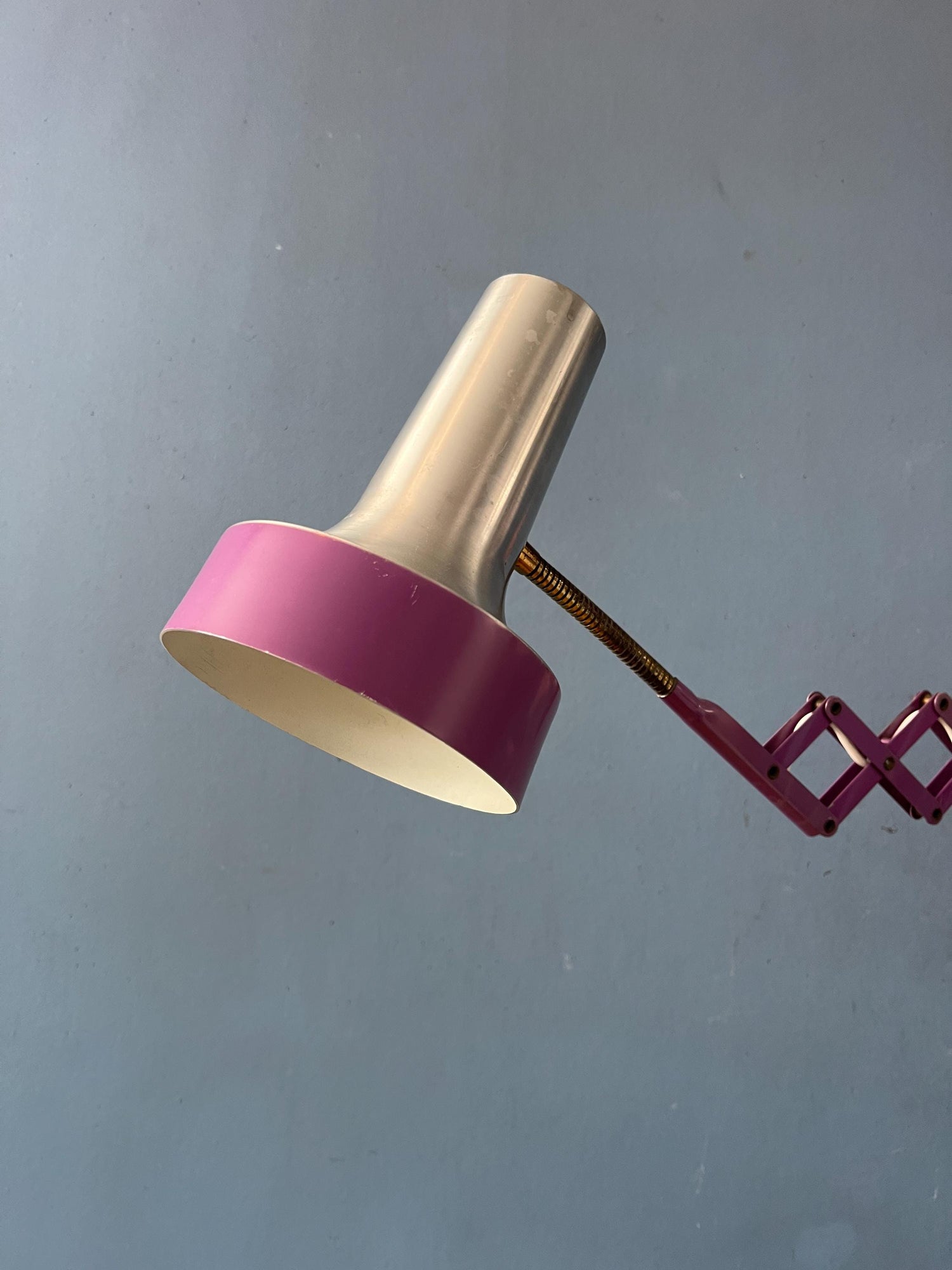 Purple mid century space age scissor wall lamp made out of metal. The lamp is extendable with the scissor mechanism. Also the shade itself can be adjusted. The lamp requires an E27/26 (standard) lightbulb and currently has an EU-plug (works outside EU with plug-converter).