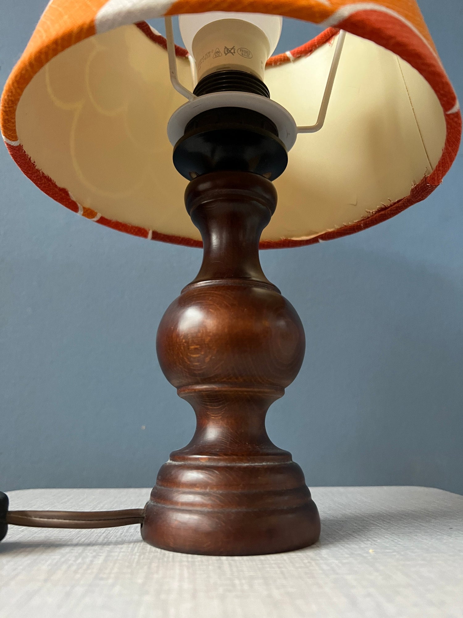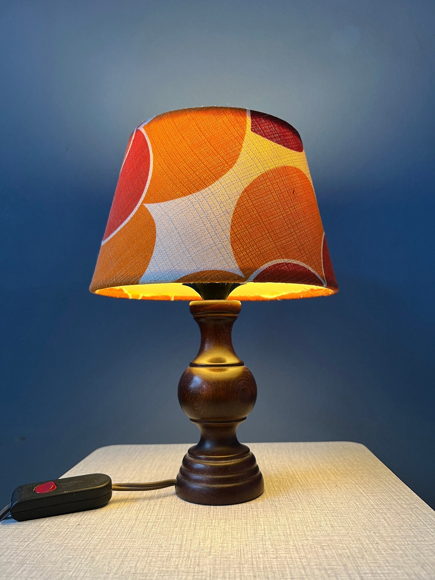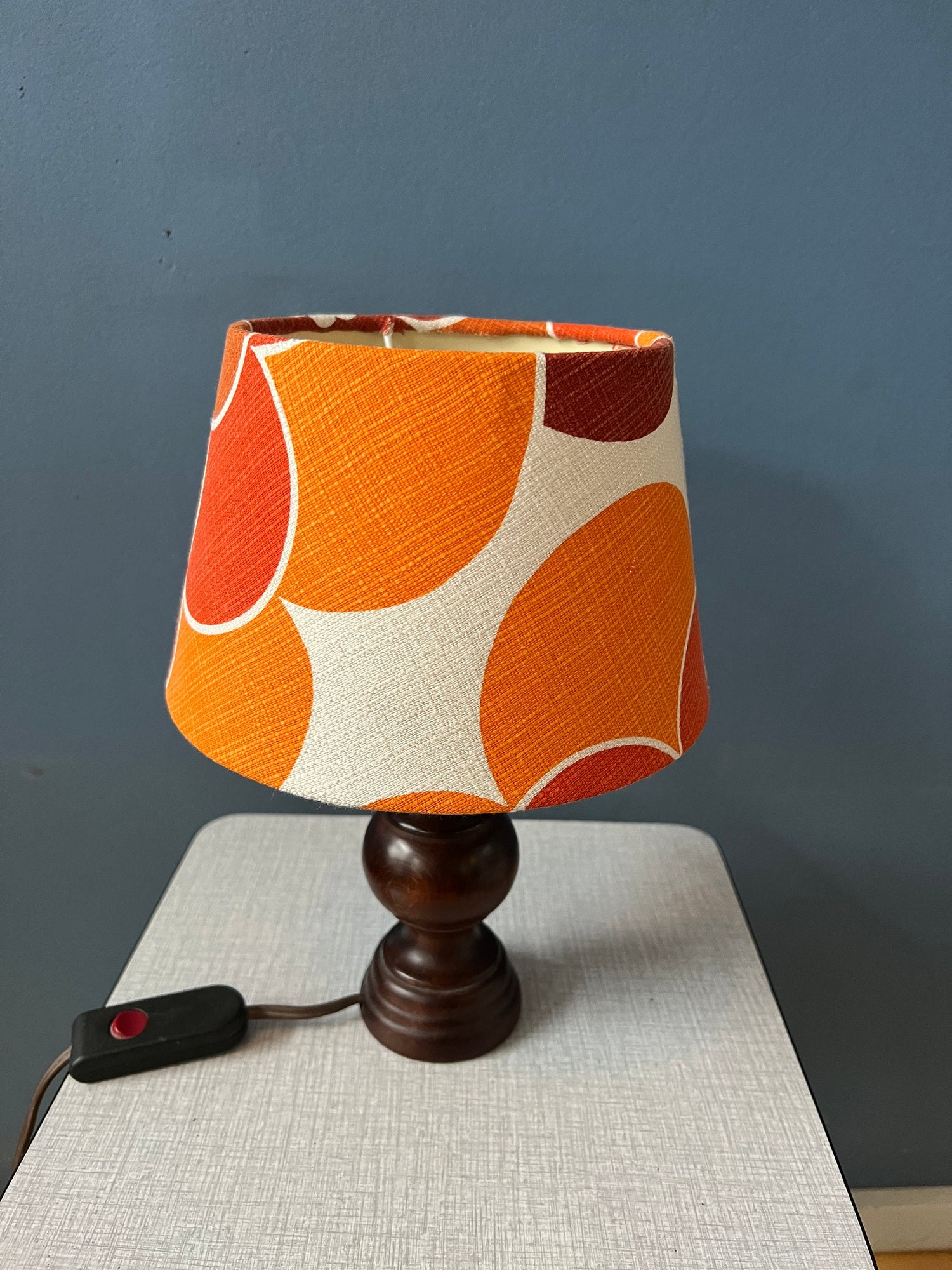 Small retro table lamp with newly made orange, space age style shade. The lamp has a wooden base and textile shade. The lamp requires one E27 lightbulb and currently has an EU-plug.