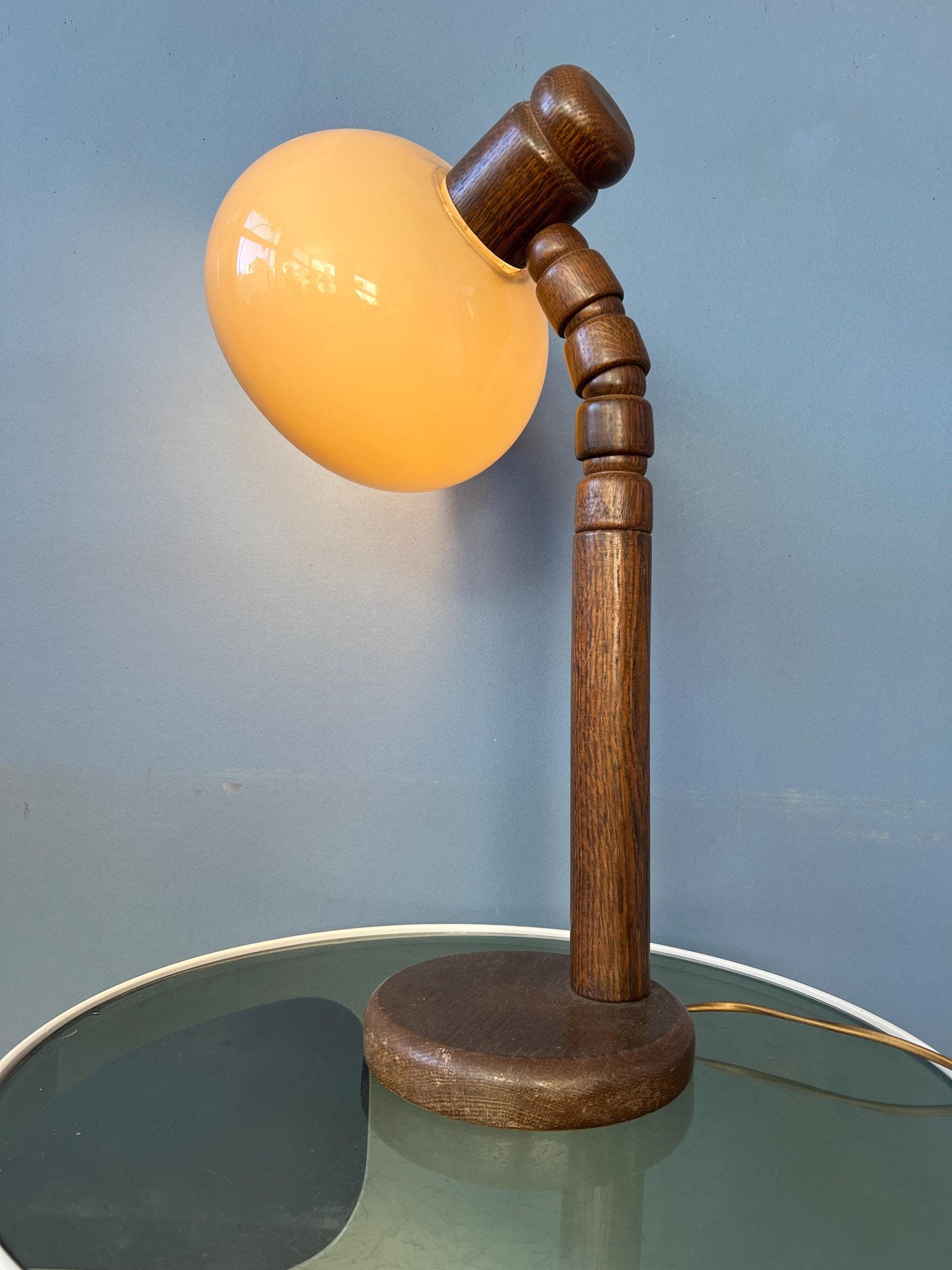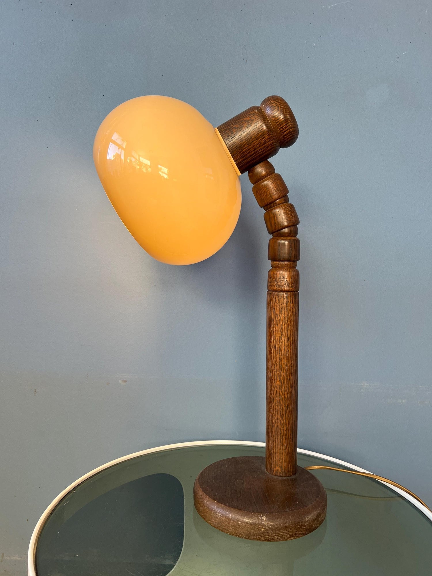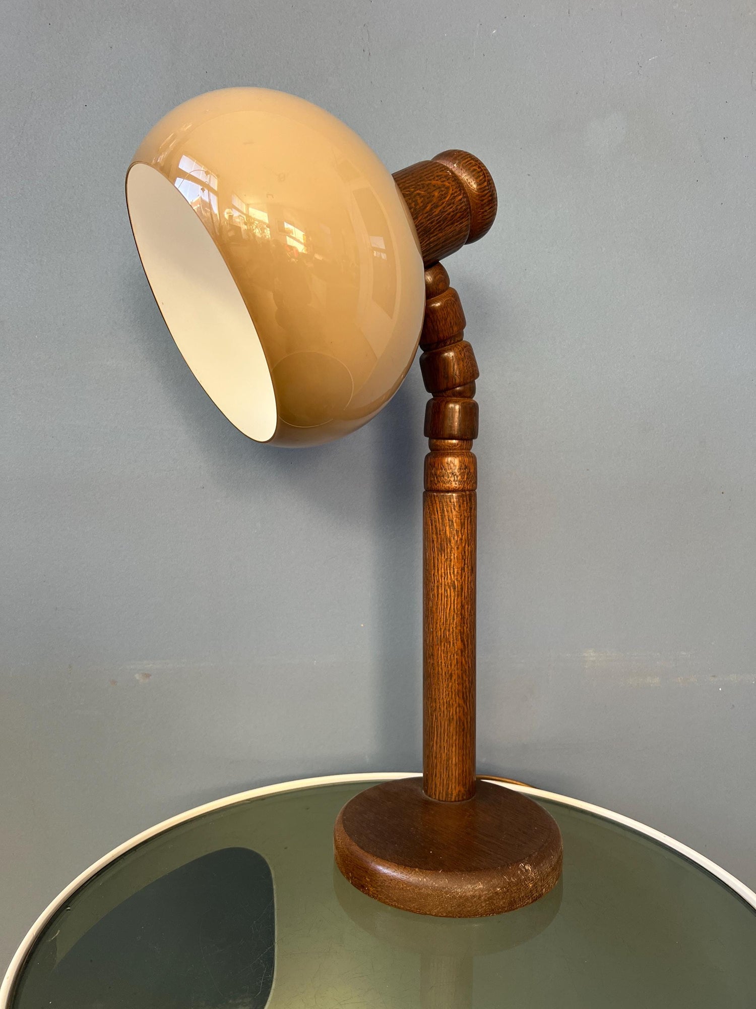 Vintage mushroom table lamp by Steinhauer made from wood and beige acrylic glass. The mocca coloured plexiglass produces a nice and warm light. The lamp requires one E27/26 (standard) lightbulb and currently has an EU-plug (works outside EU with plug-converter).