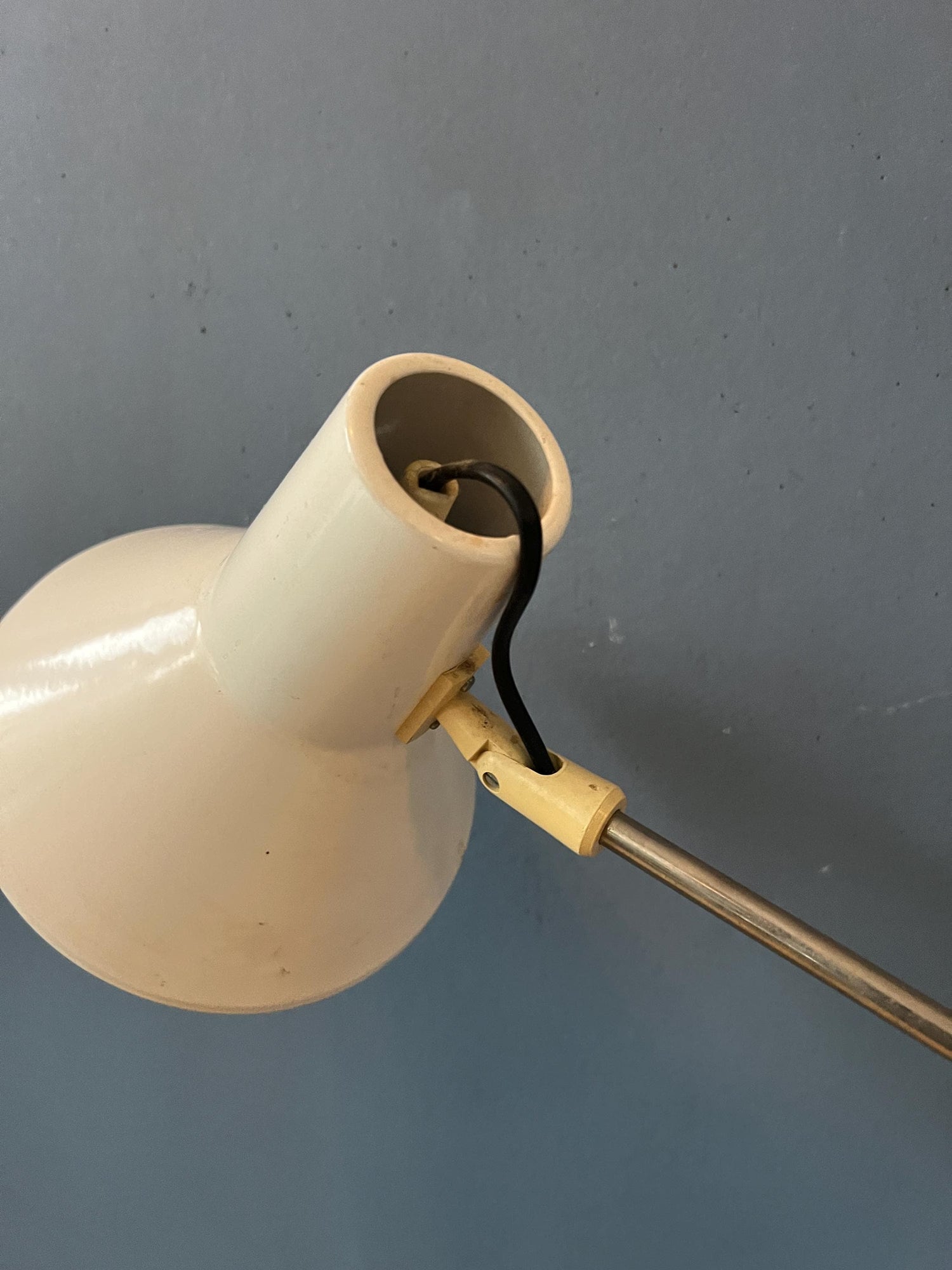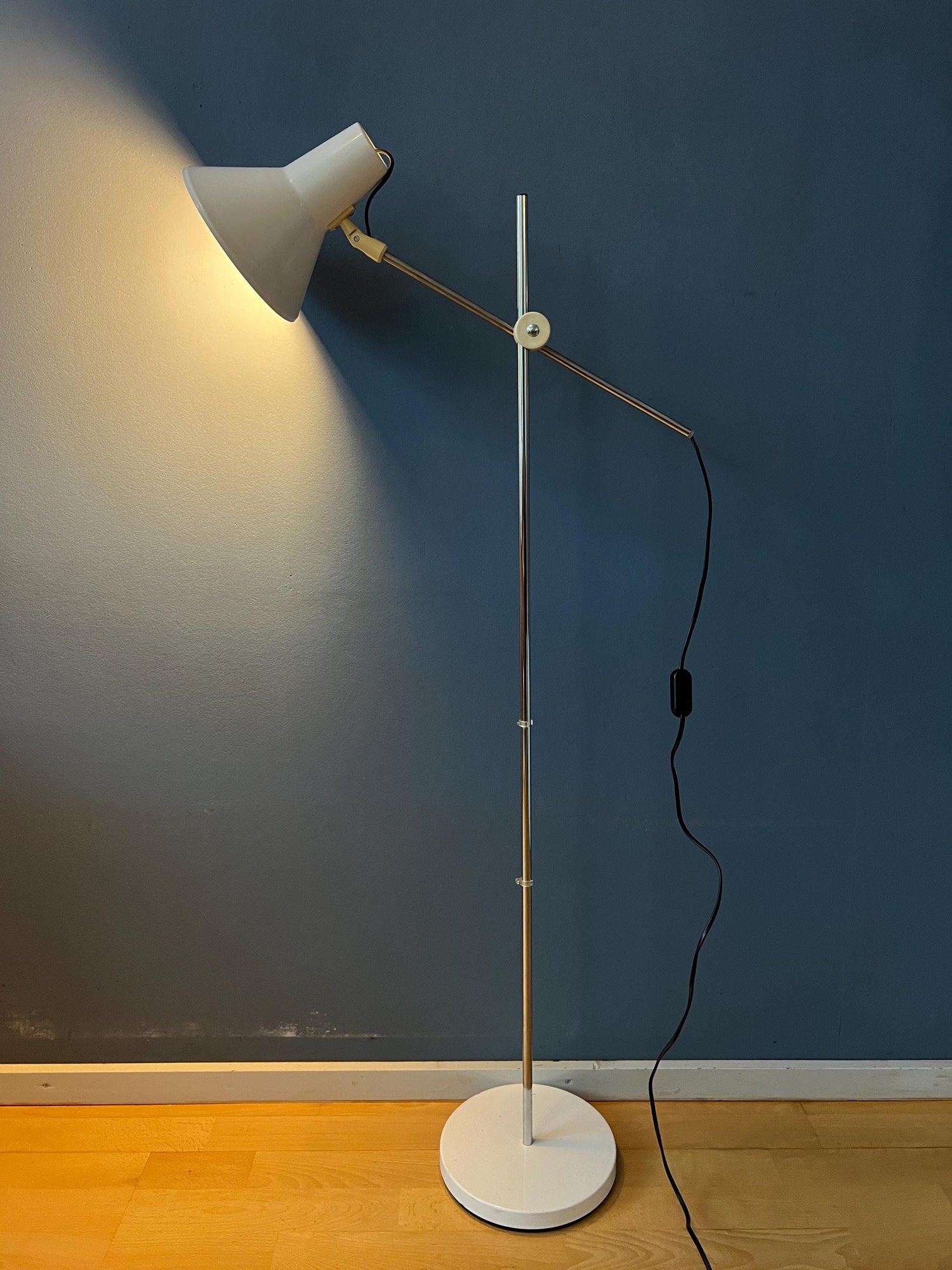 Flexible mid century floor lamp with white/beige base and shade. The height of the arm can easily be adjusted, as well as the position of the arm and the shade. This allows you to customize the direction and focus of the light. The white/beige color of the lamp's finish gives it a neutral and versatile look, making it suitable for a wide range of interior design styles. The lamp requires one E26/27 lightbulb and currently has an EU-plug.