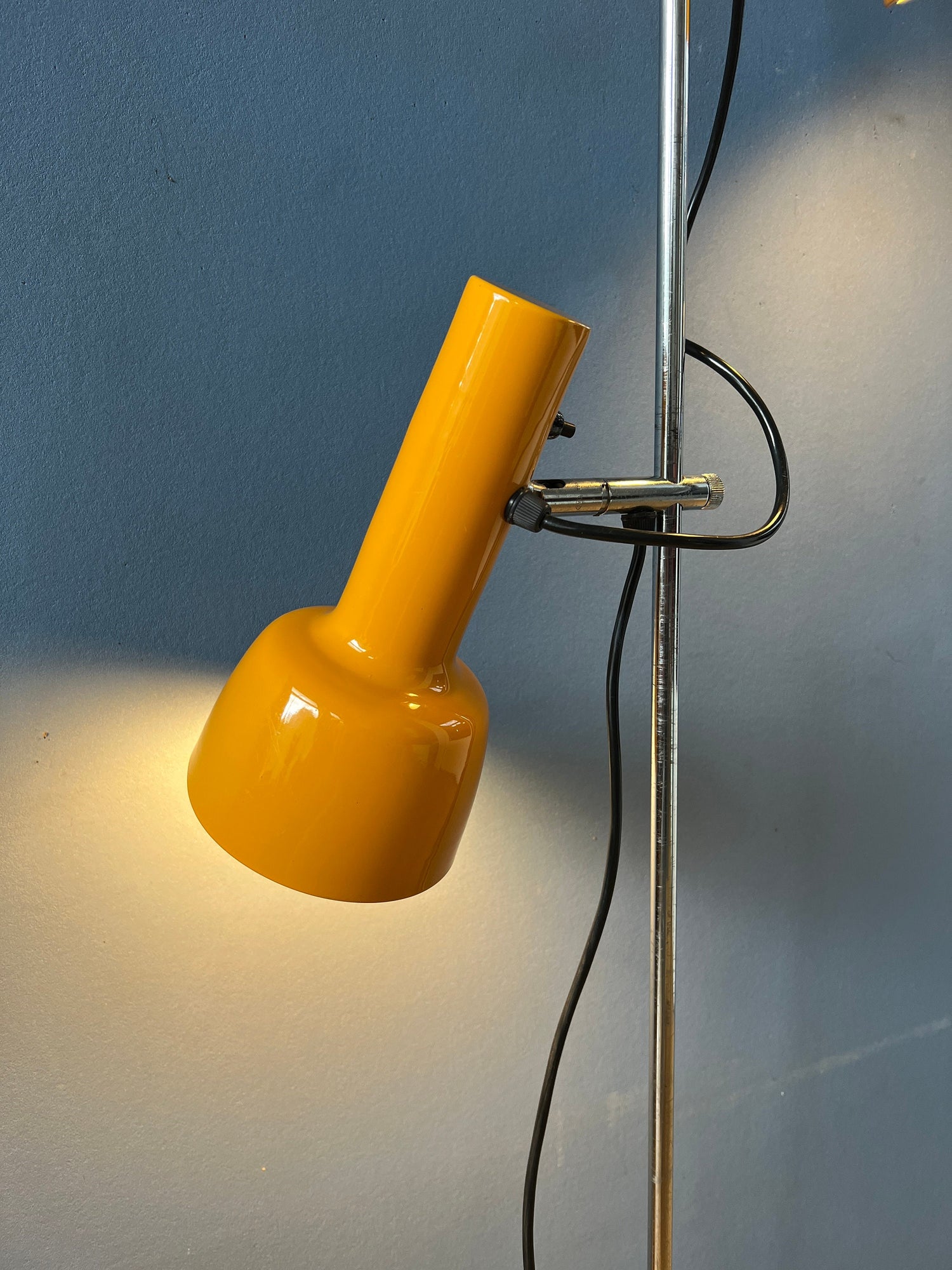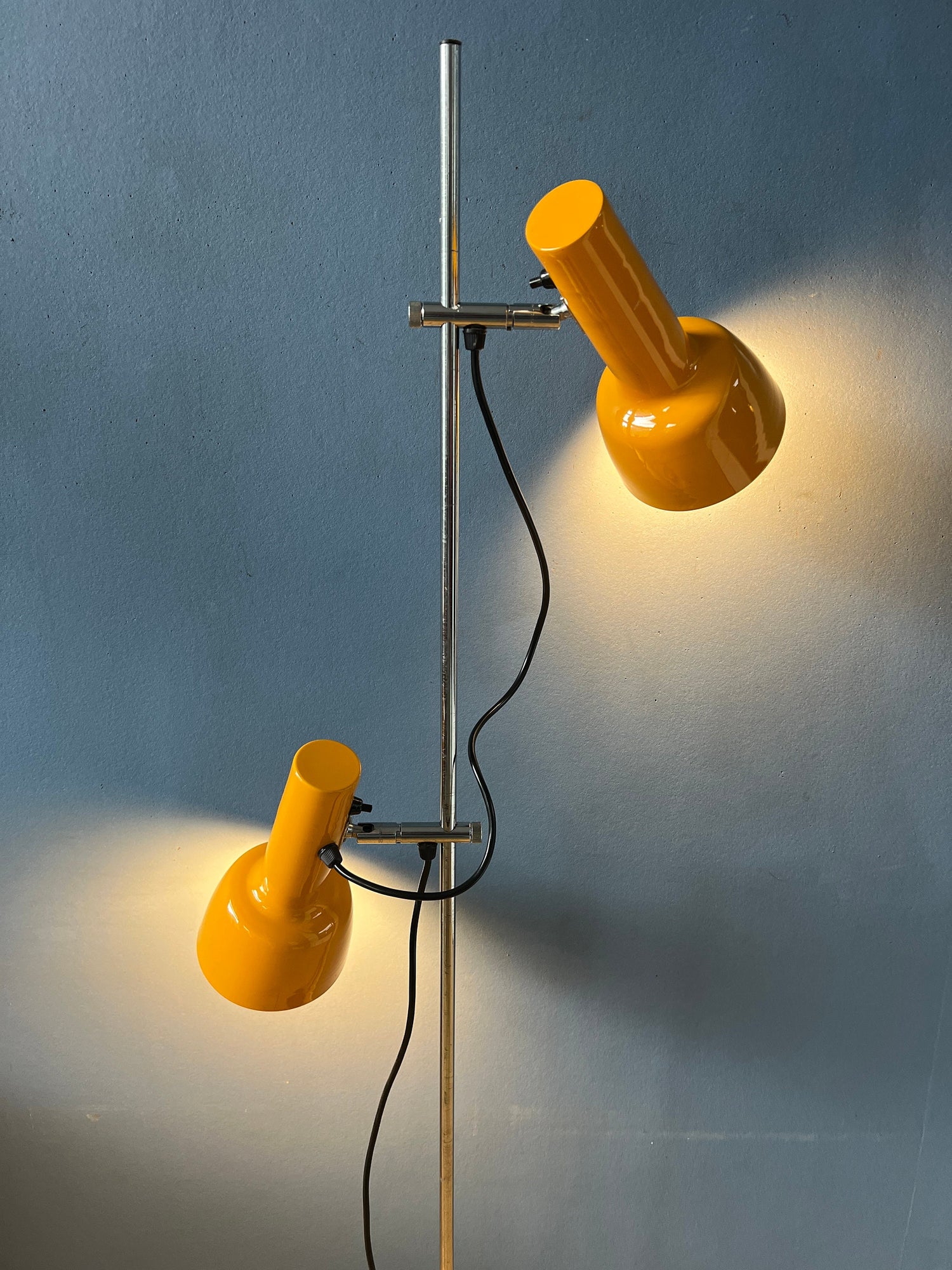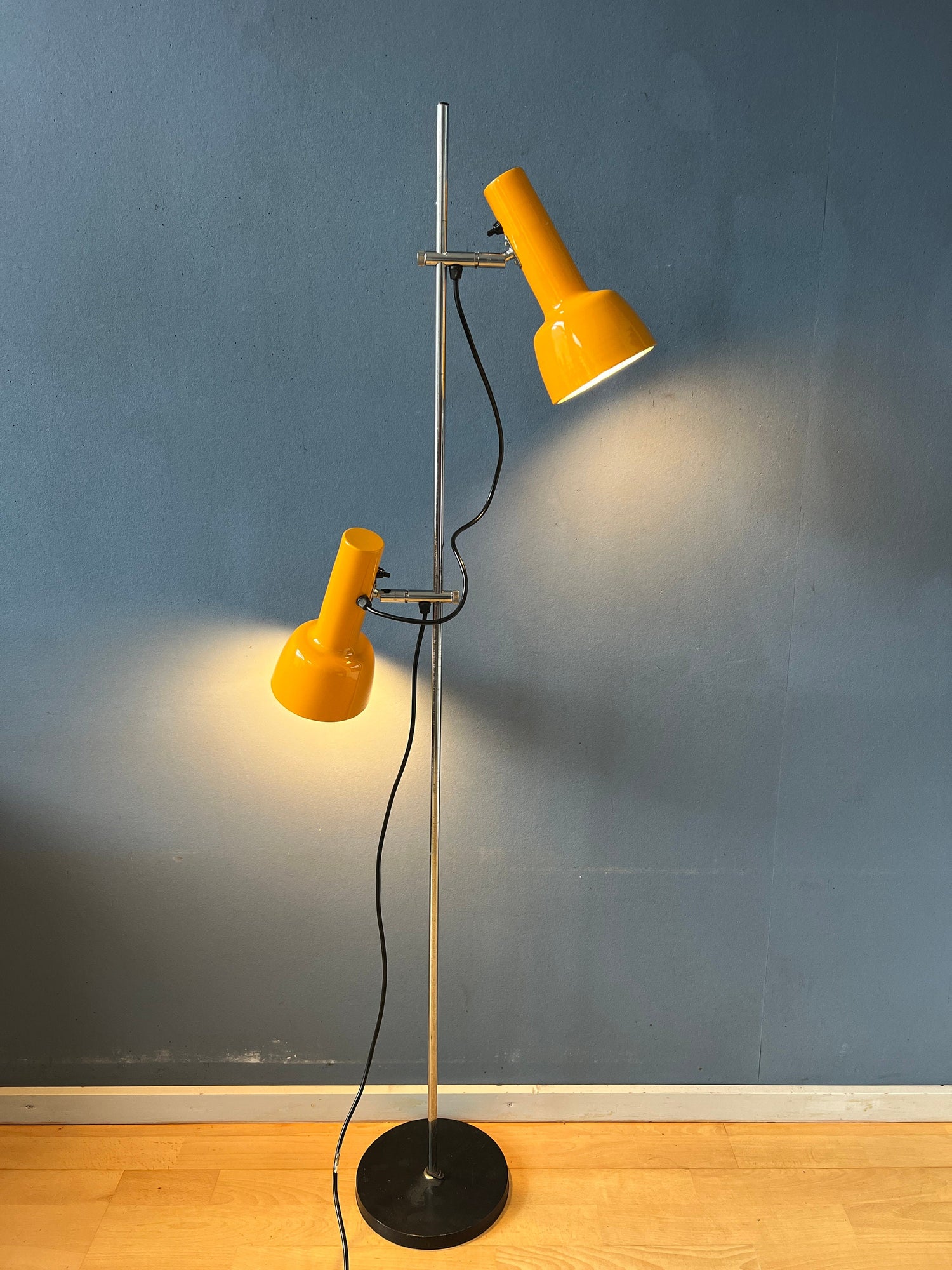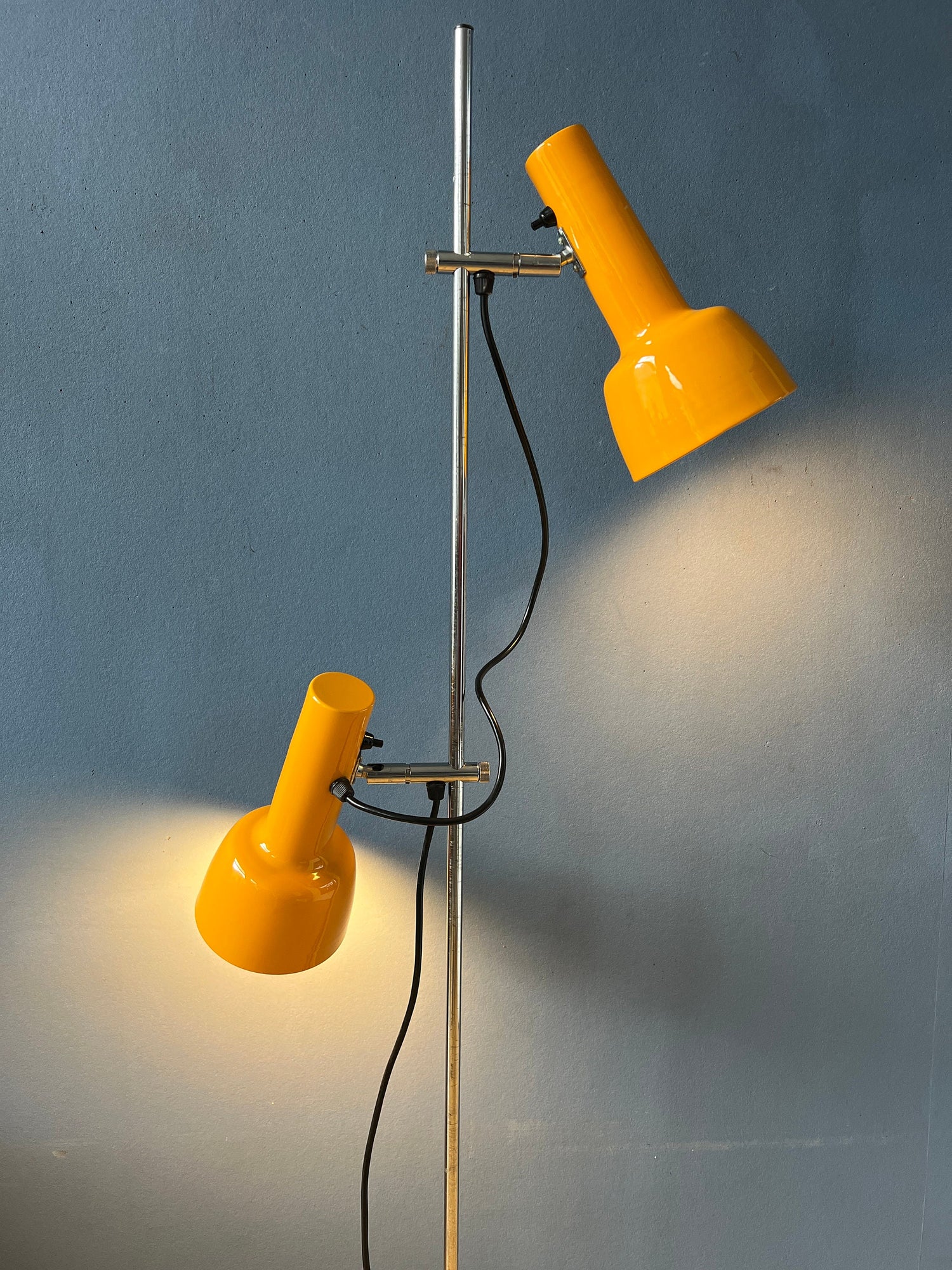 Mid century floor lamp with yellow shades. The shades have beautiful, thick yellow lacquer. The metal shades can be directed in any way desirable. They can also move up and down the base. The lights can be switched on/off with buttons on the shades. The lamp requires two E27/26 lightbulbs and currently has an EU-plug (plug-converter can be added).