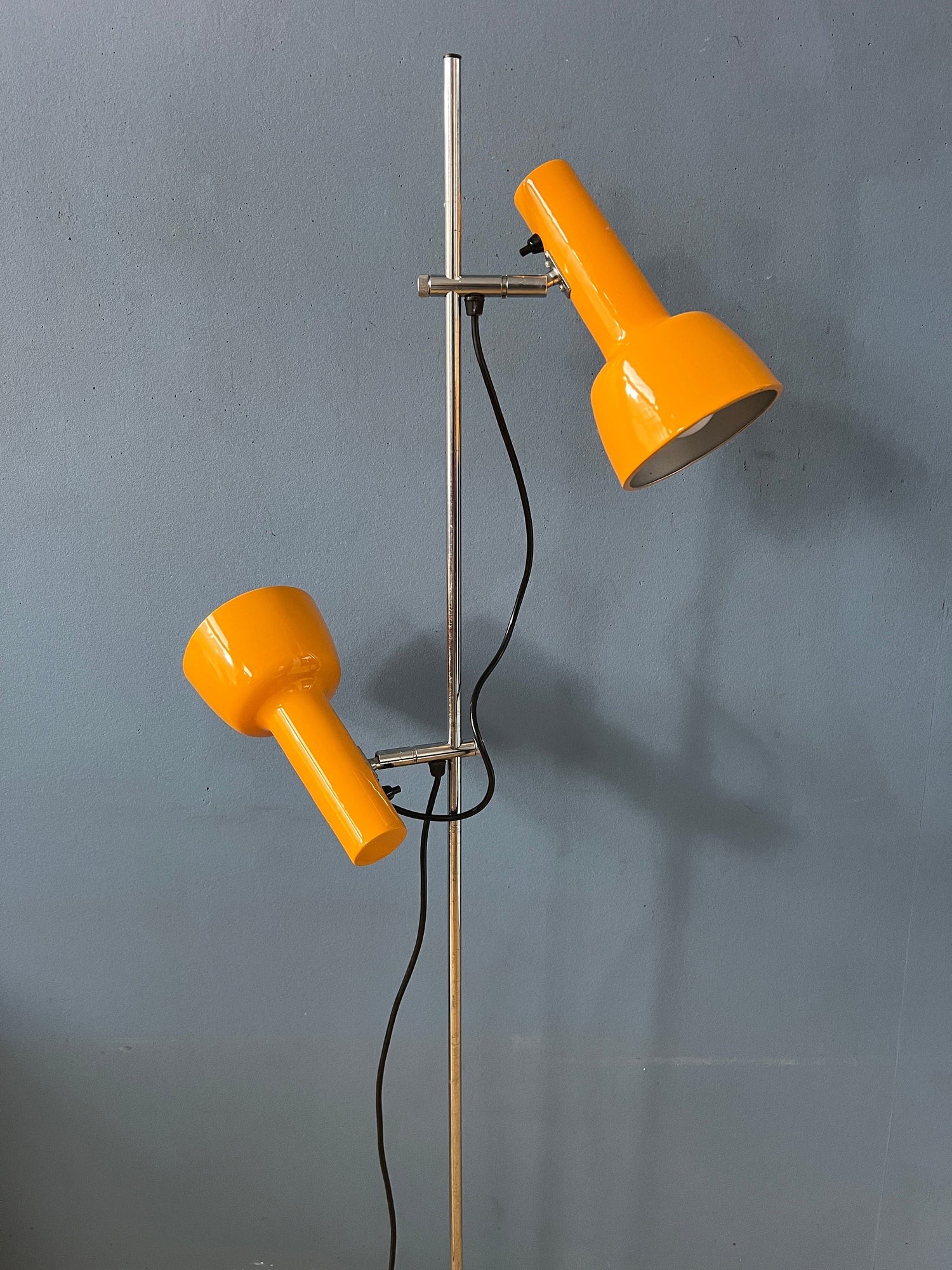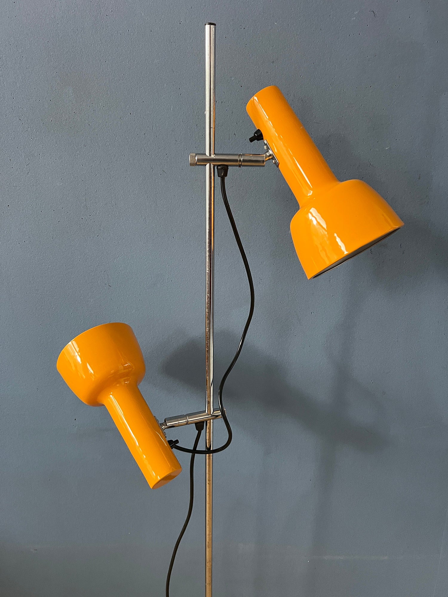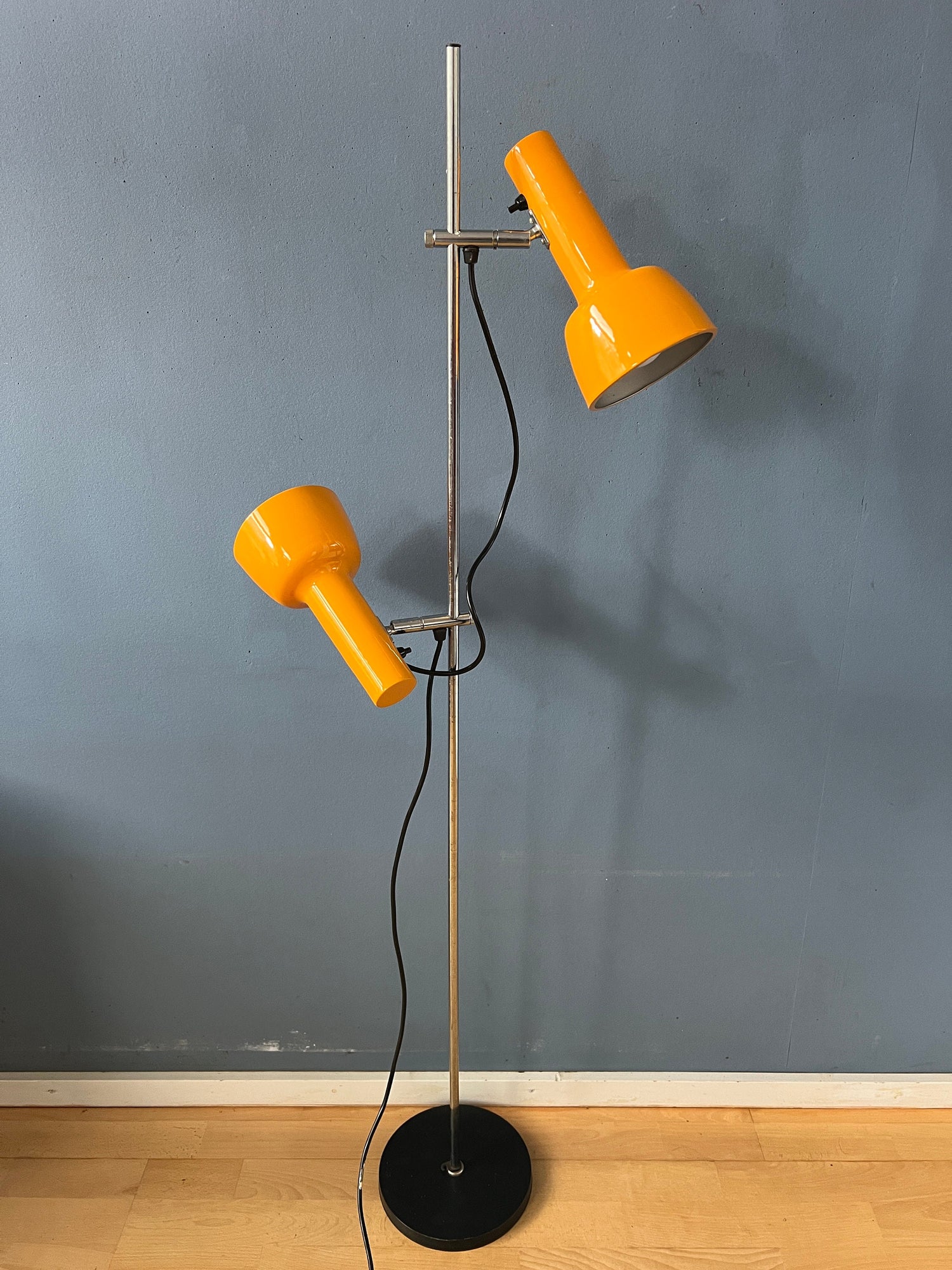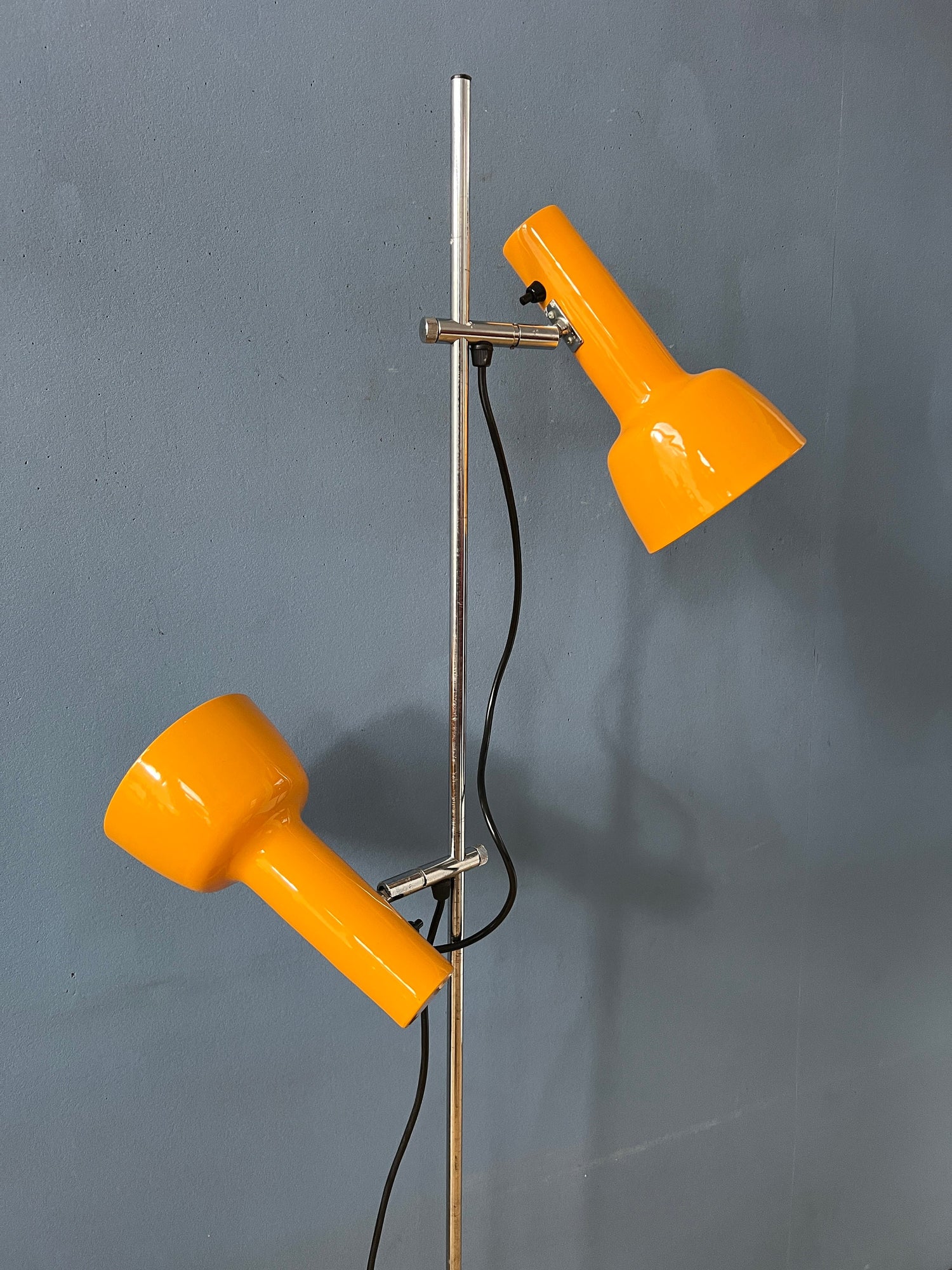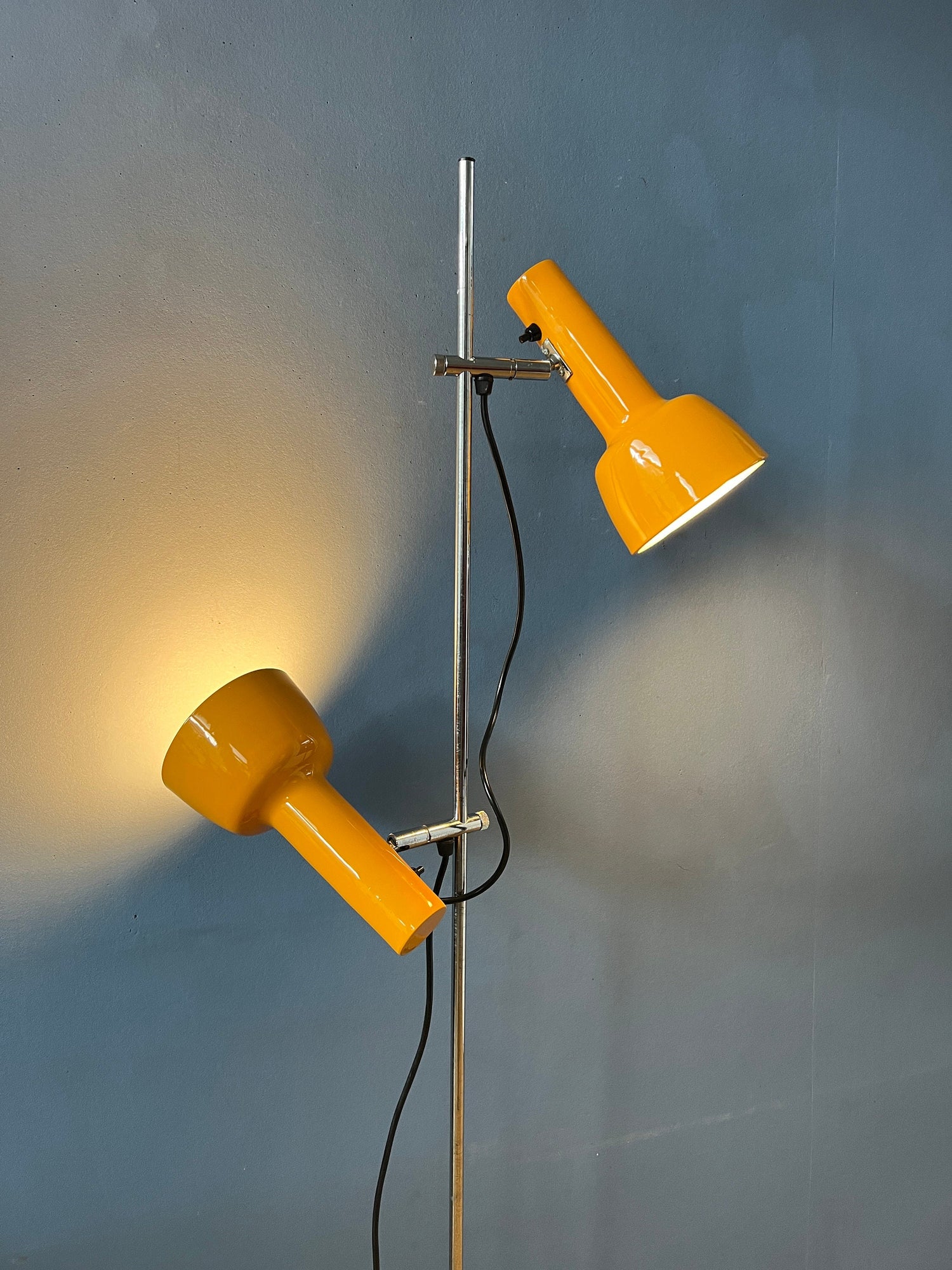 Mid century floor lamp with yellow shades. The shades have beautiful, thick yellow lacquer. The metal shades can be directed in any way desirable. They can also move up and down the base. The lights can be switched on/off with buttons on the shades. The lamp requires two E27/26 lightbulbs and currently has an EU-plug (plug-converter can be added).