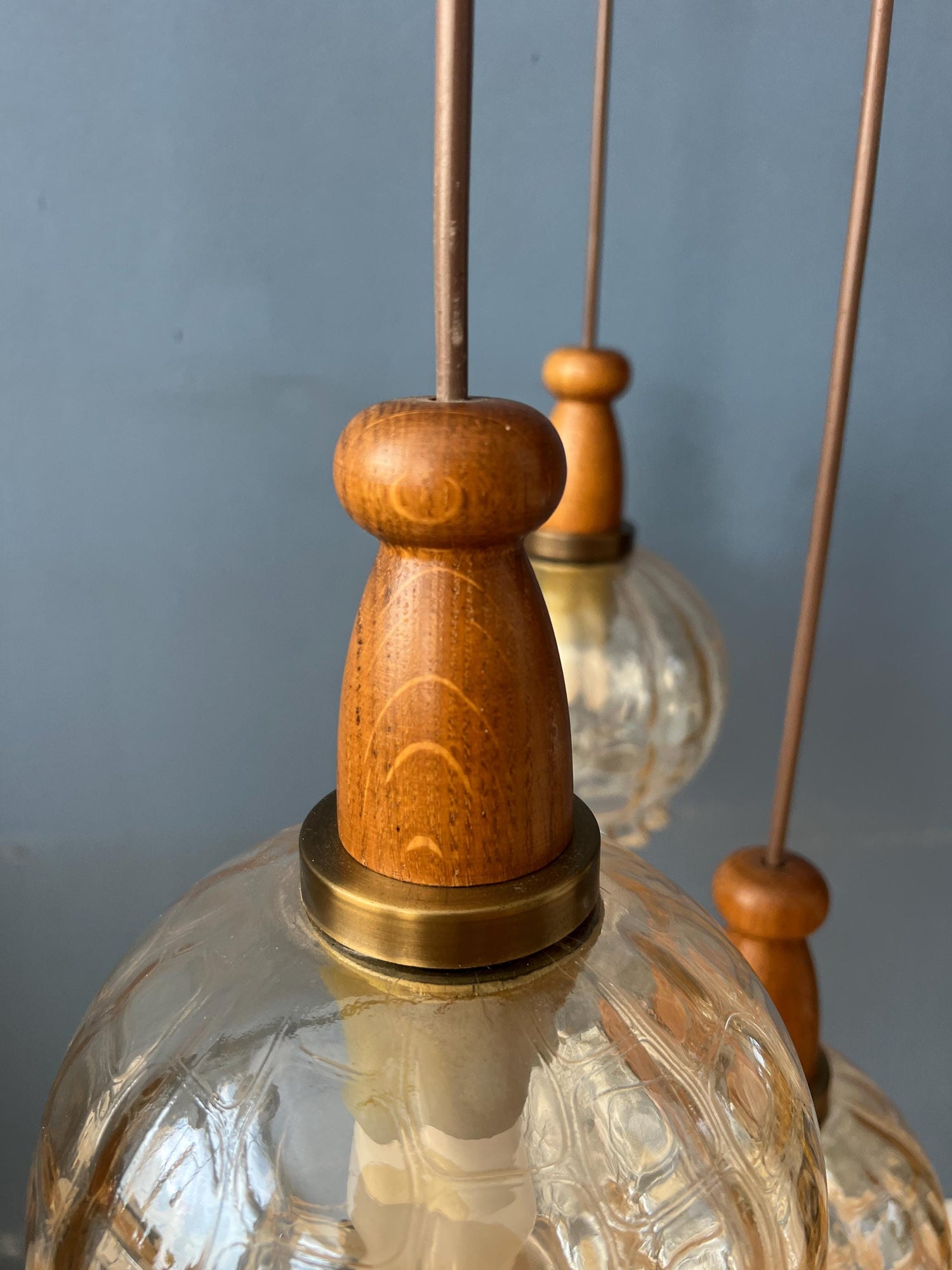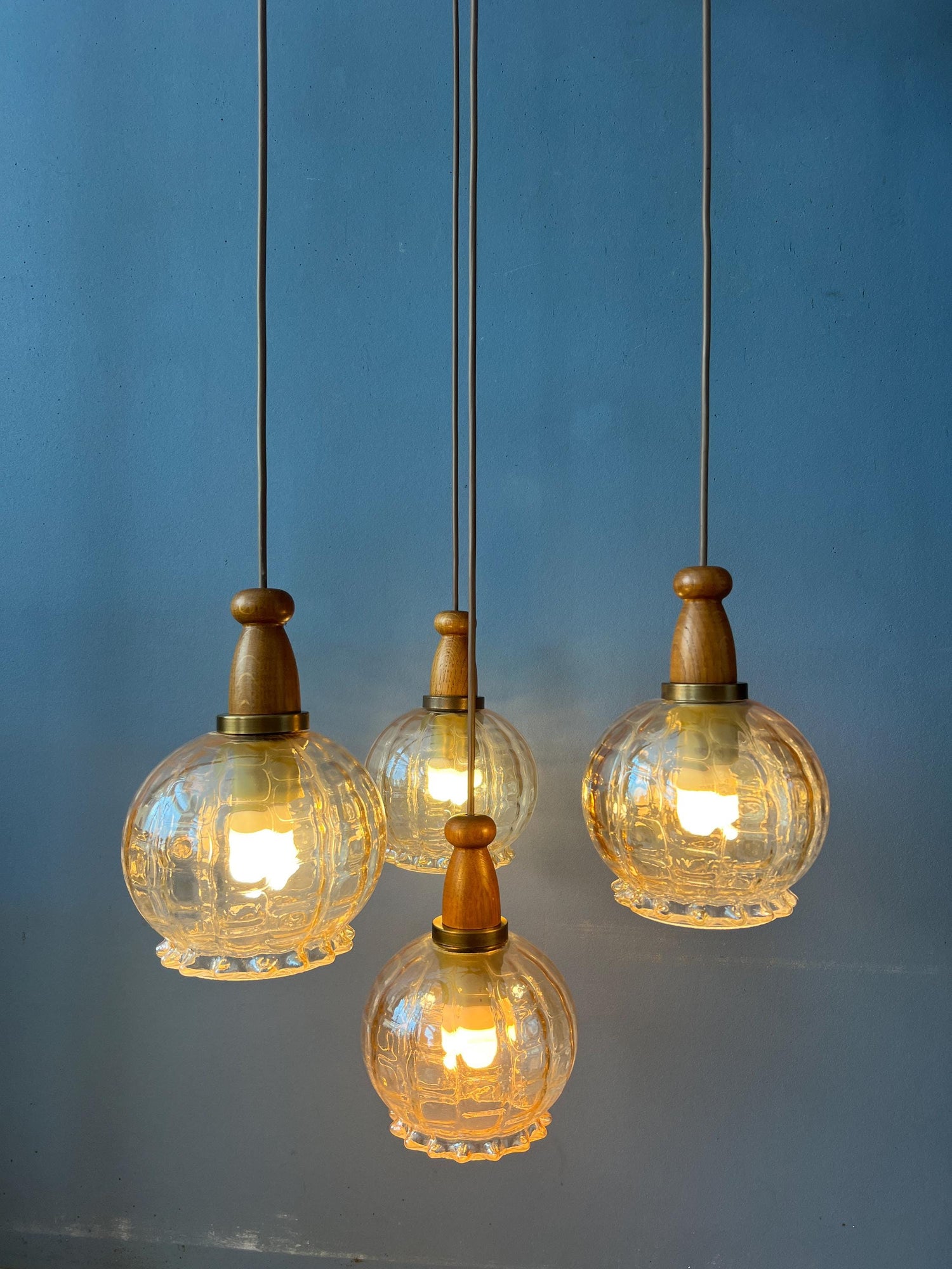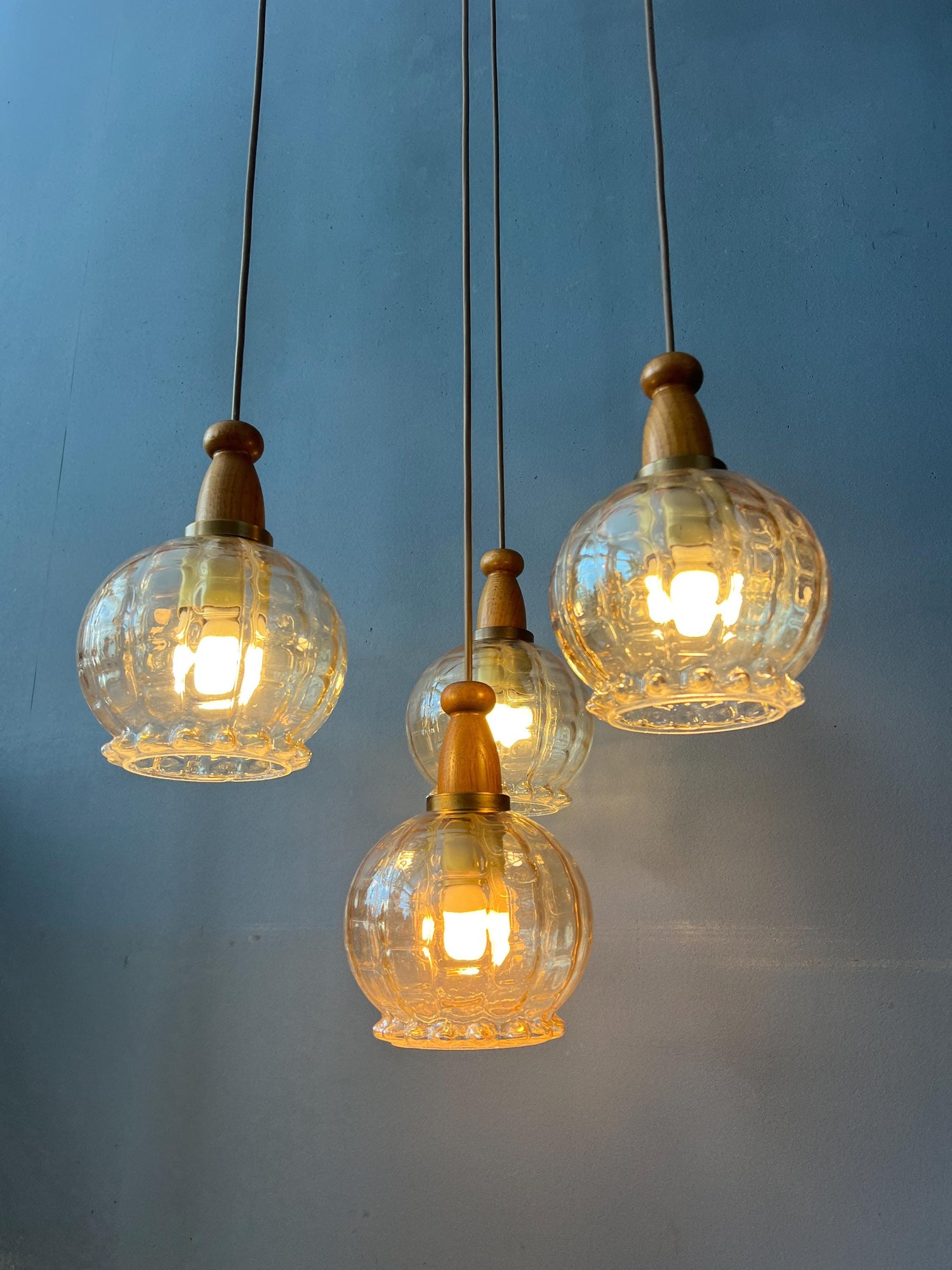 Hustadt Leuchten vintage cascade chandelier with 4 glass shades. The shades have a decorative shape and the glass has a champagne-like colour. The height of each shade can be adjusted by refixating the separate cords. The lamp requires five small E27/26 lightbulbs.