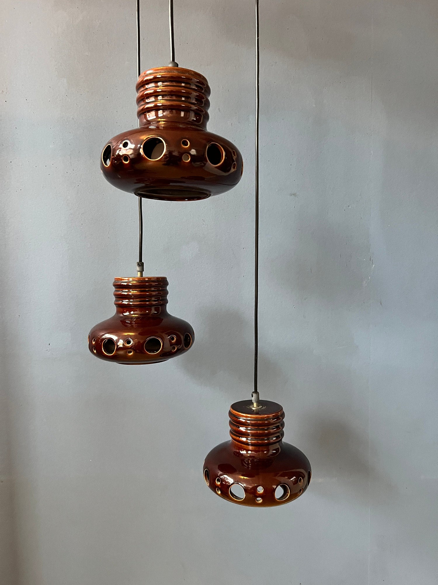 West germany cascade chandelier with three ceramic lights. The height of each individual light can easily be adjusted, the pictures show one possible example. The lamp requires three E27/26 (standard) lightbulbs.