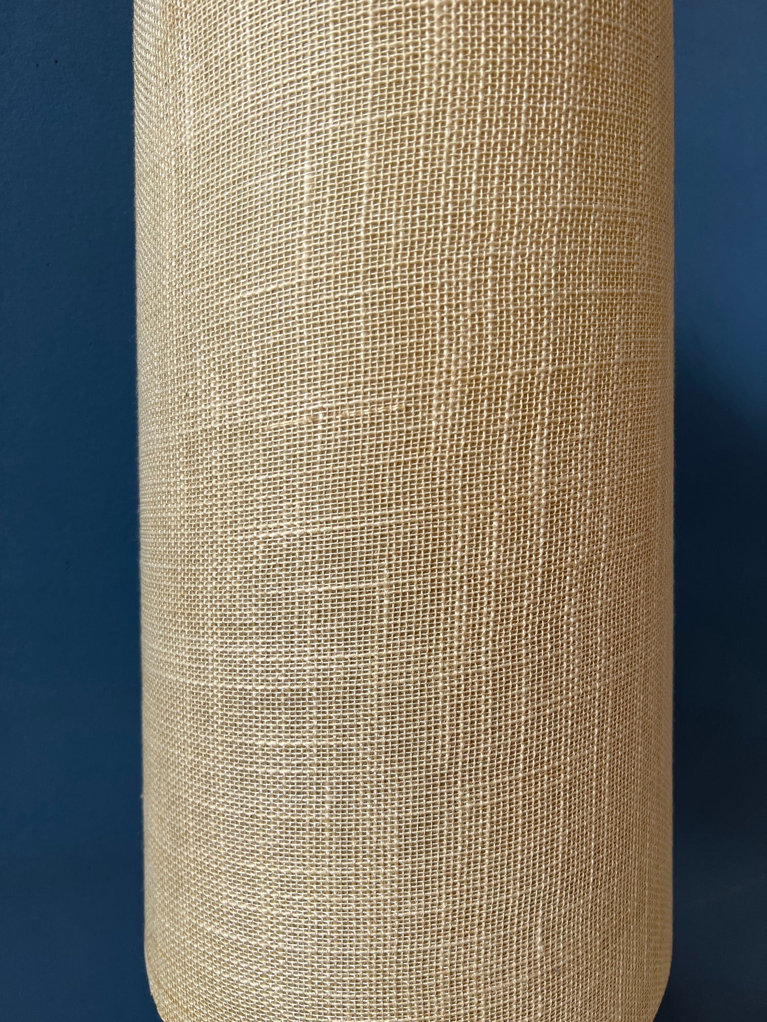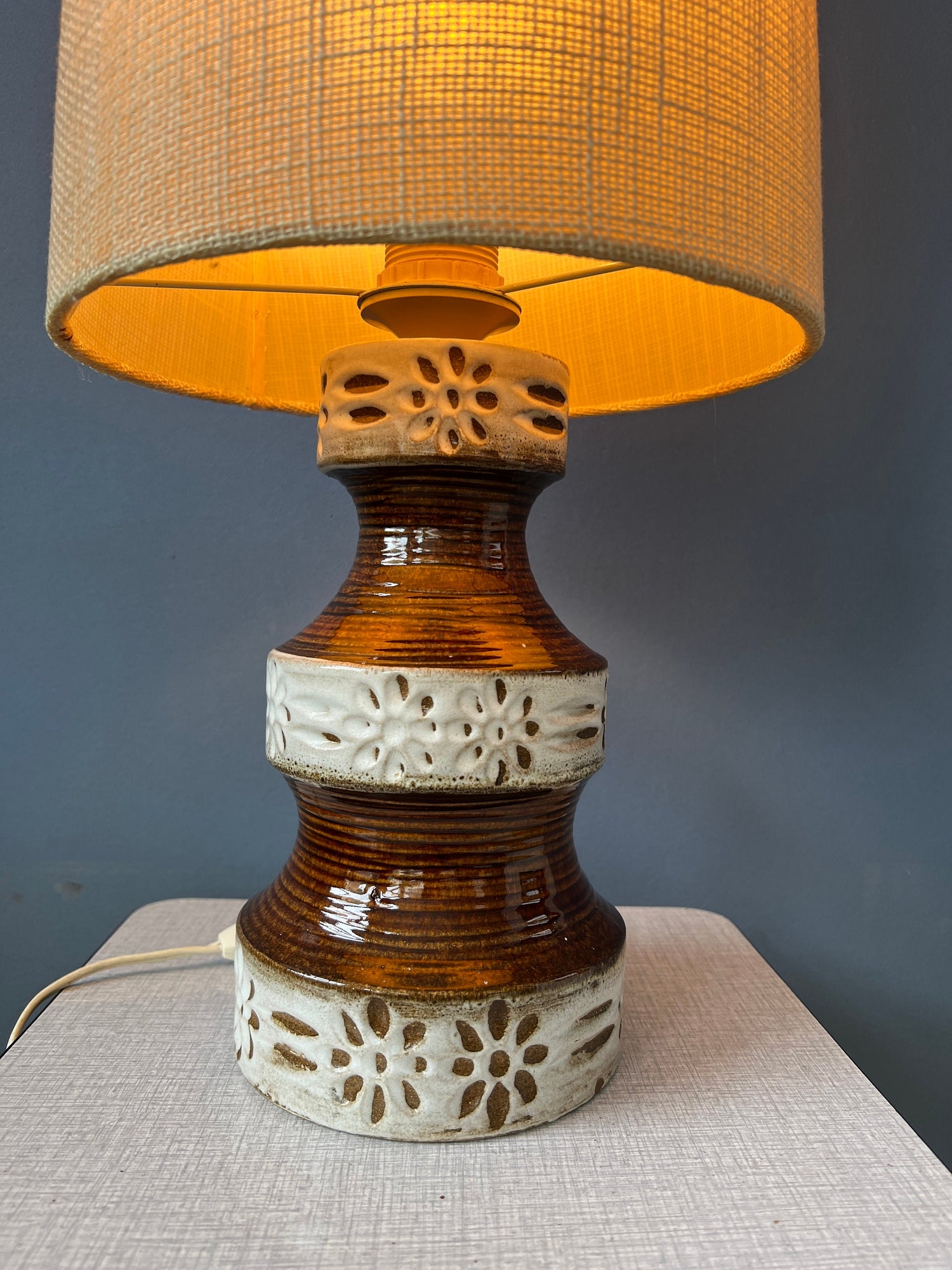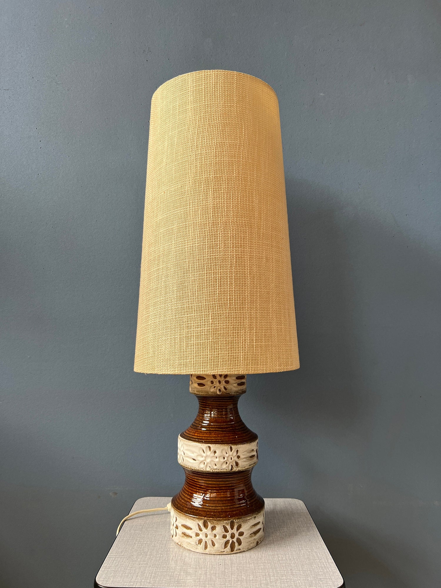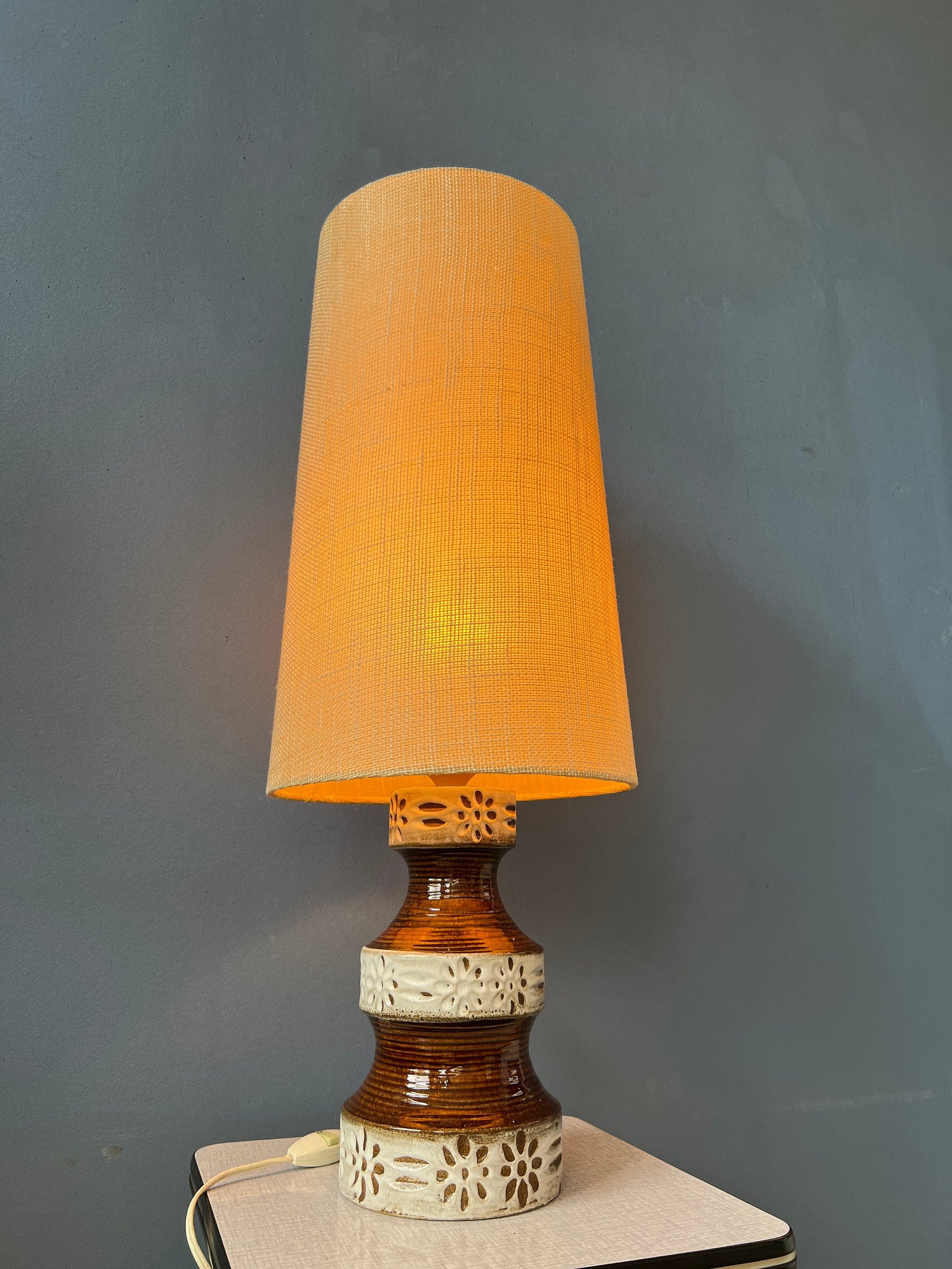 West Germany Fat Lava table lamp with ceramic base and textile shade. The lamp requires one E27 lightbulb and currently has an EU-plug.