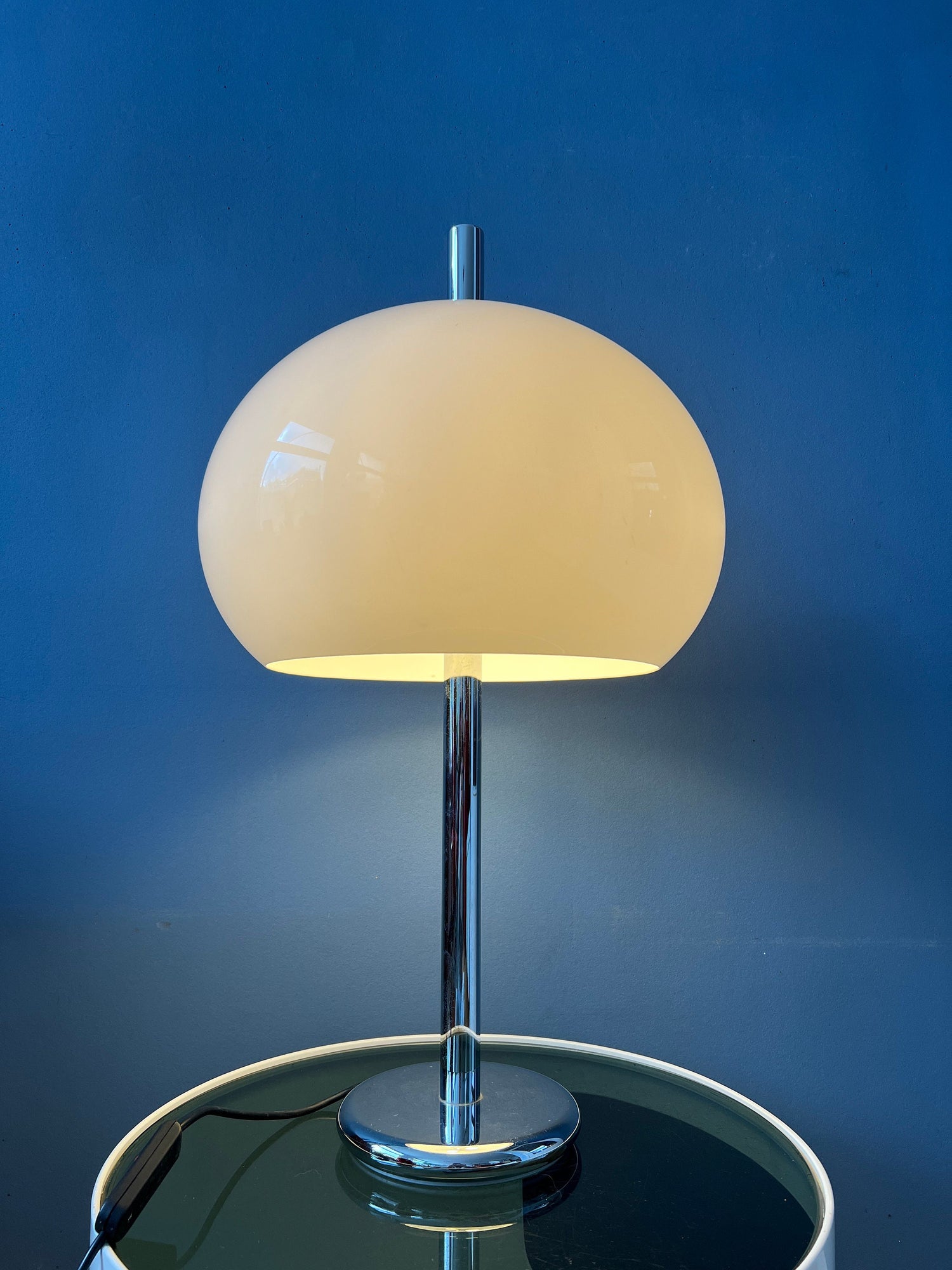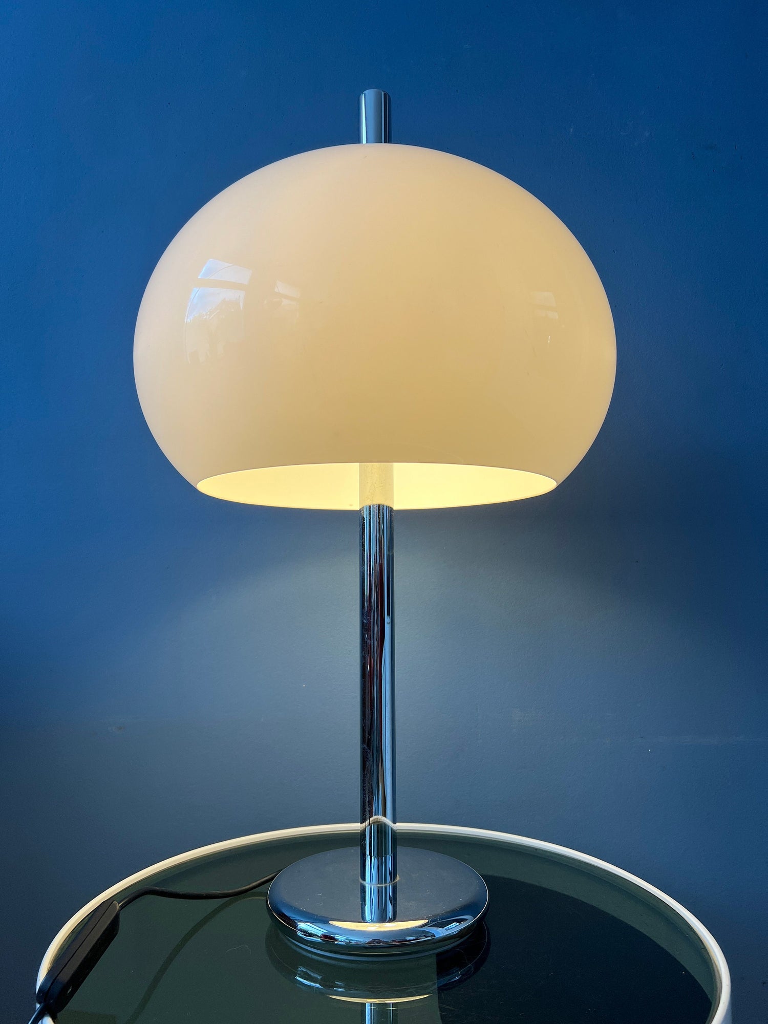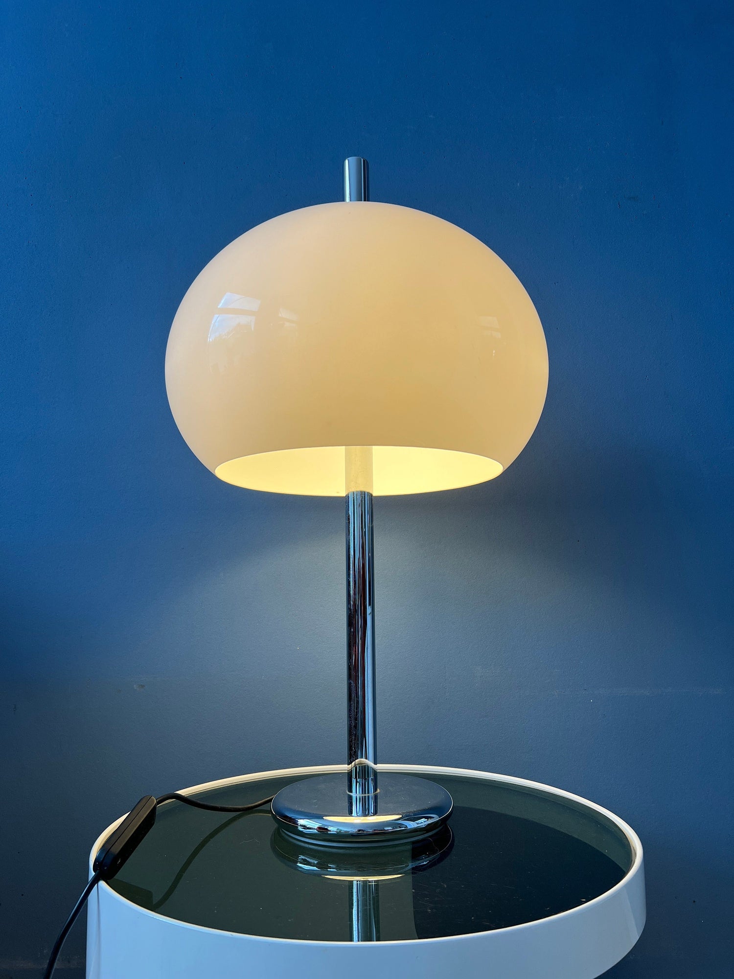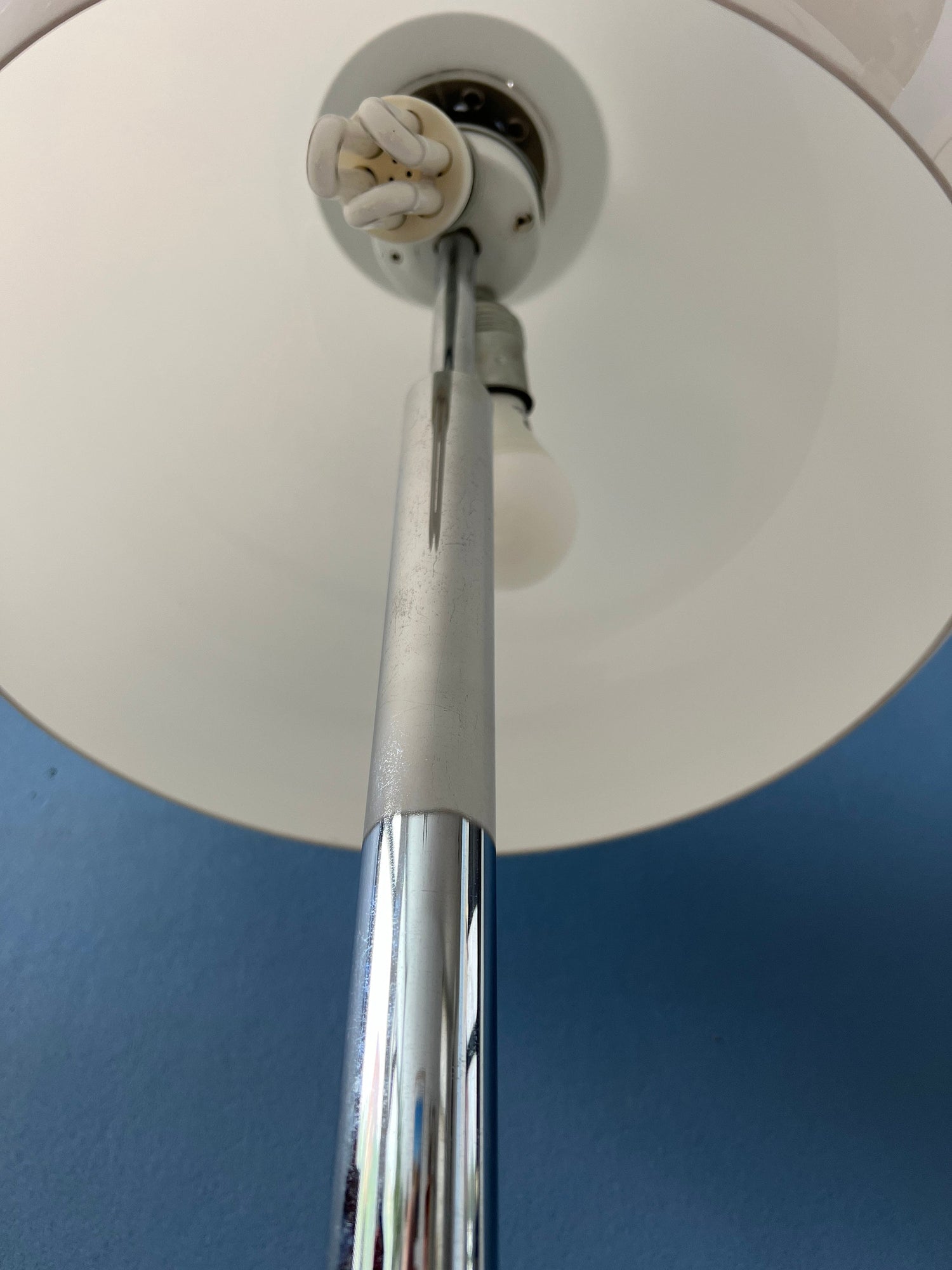 Big mid century Dijkstra mushroom table lamp with chrome frame and white shade. The large mushroom shades creates a magnificent light which reflects beautifully on the chrome frame. The lamp requires two E27 lightbulbs and currently has a EU-plug (easily used outside EU with plug-converter).