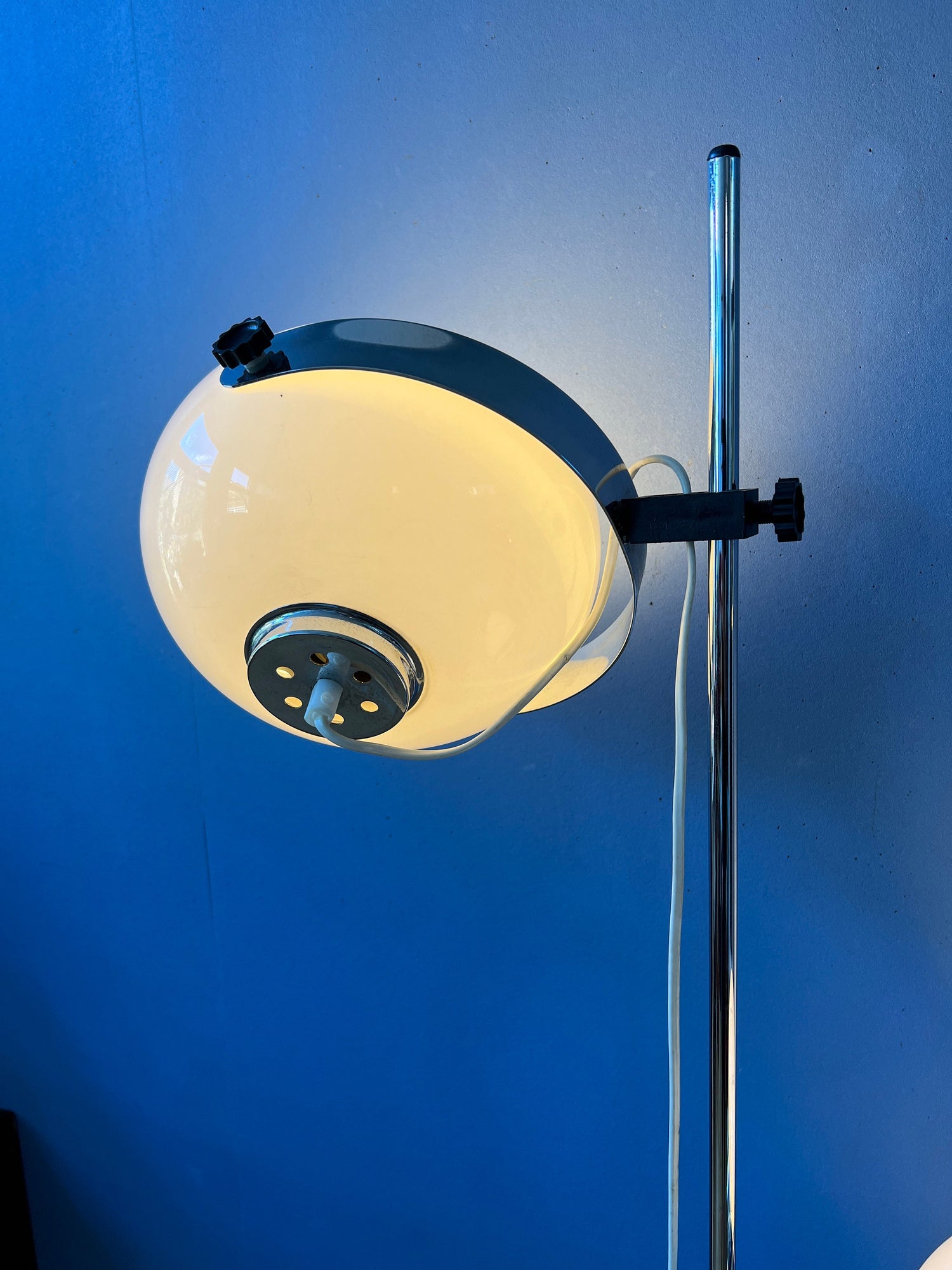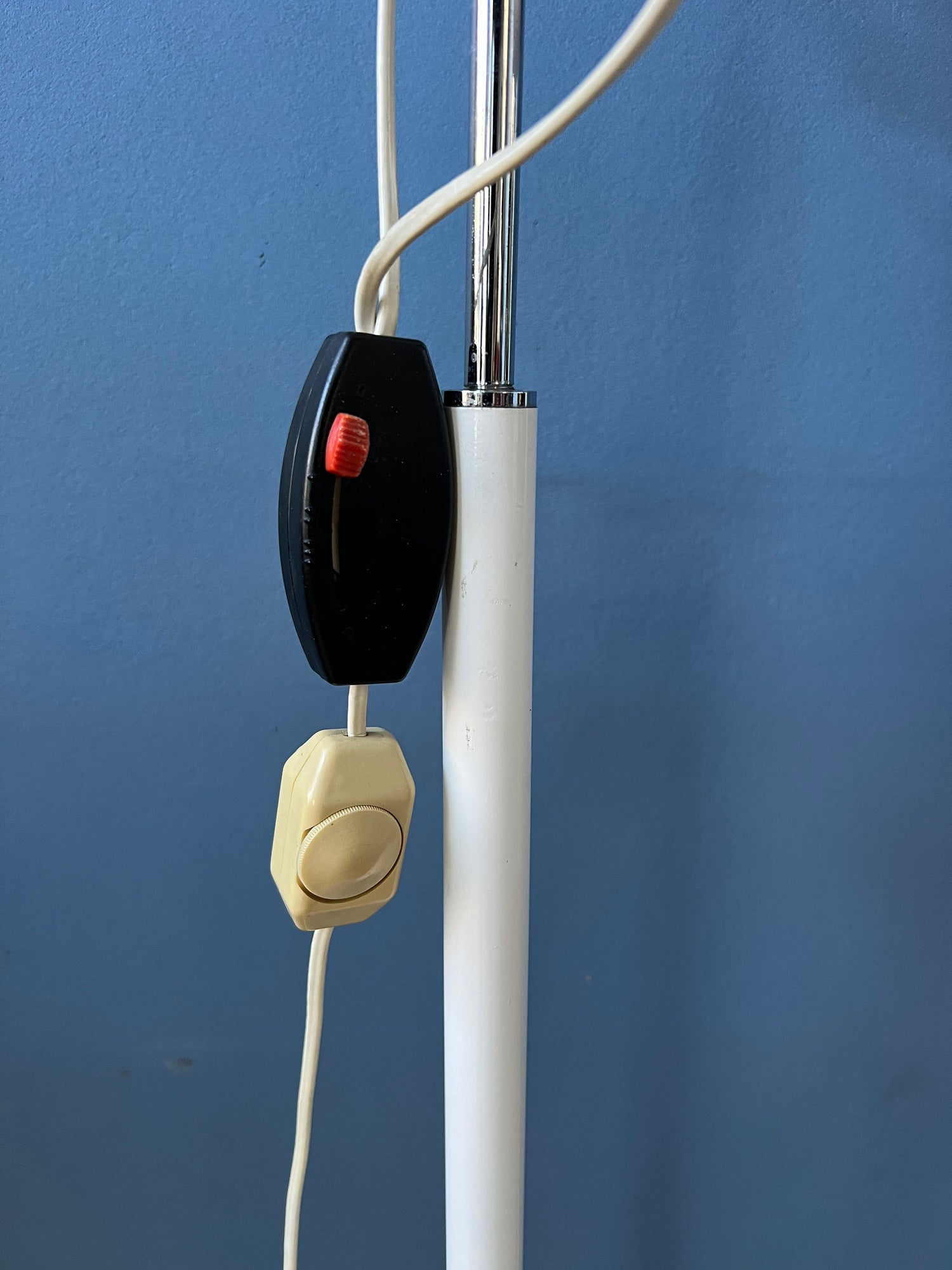 Mid century space age floor lamp with mushroom shades by Dijkstra. The mushroom shades can be turned in any direction and move up and down the base. The floor switch allows you to switch on the lights simultaneously or separately. The lamp requires two E27 lightbulbs and currently has an EU-plug.