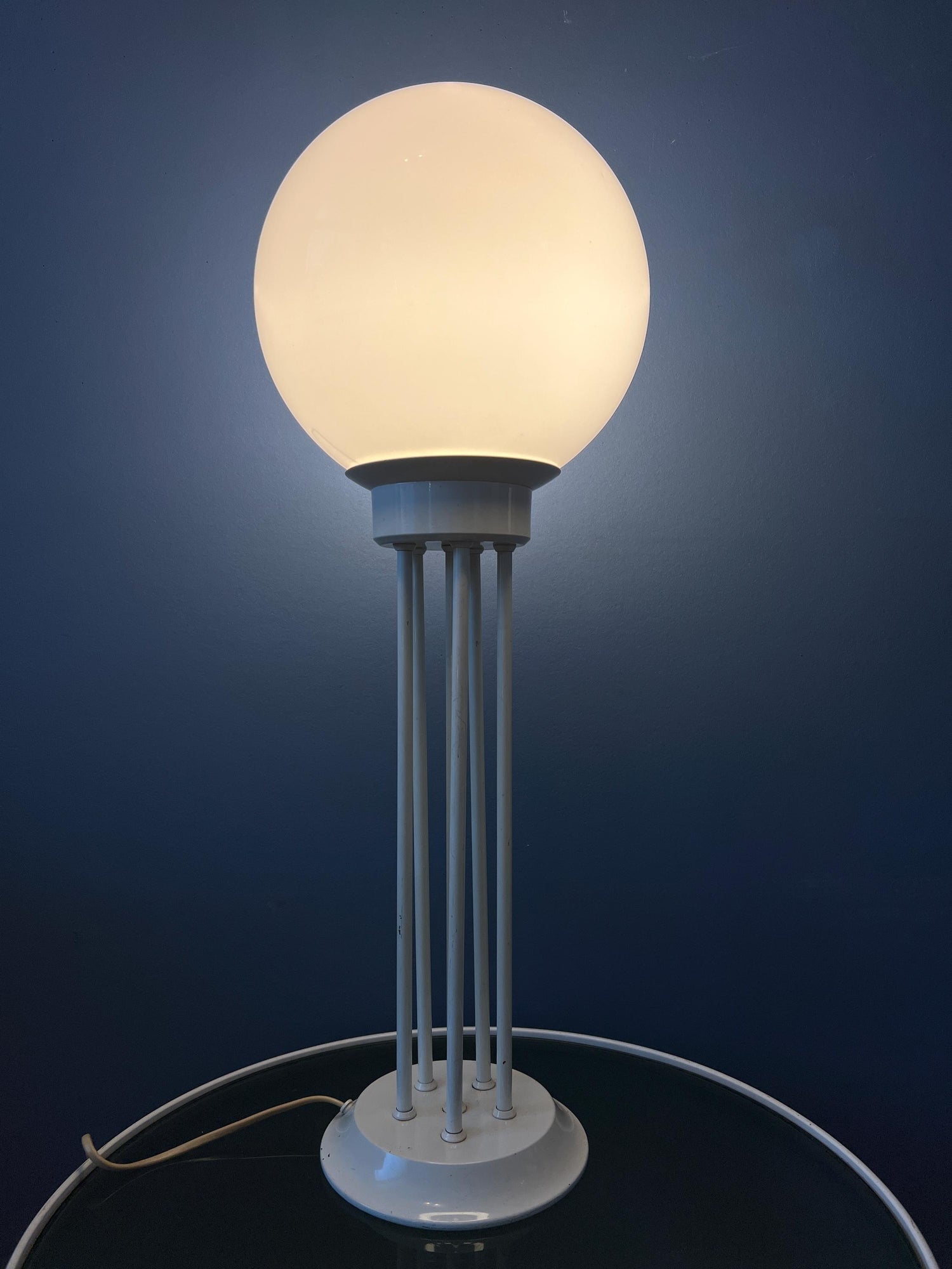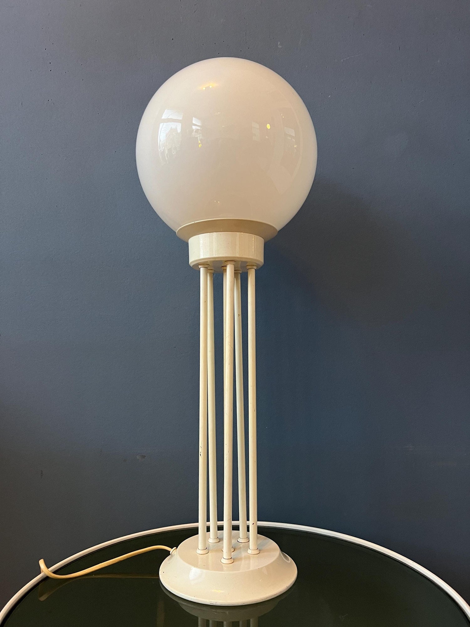 White space age desk lamp by Woja Holland. The base is made out of metal and has a white lacquer. The piece has an opaline glass shade. The lamp requires one E27/26 lightbulb and currently has an EU-plug.