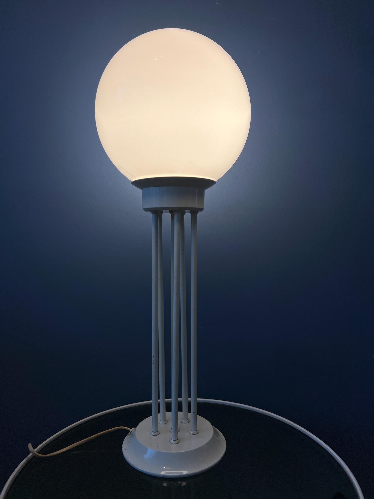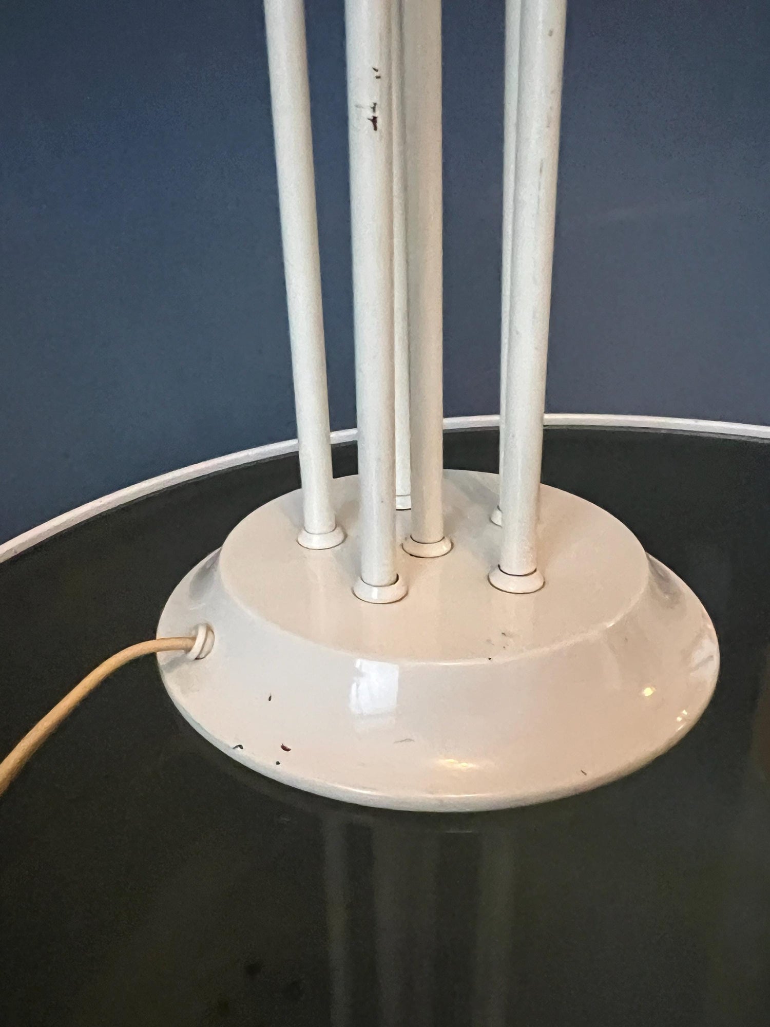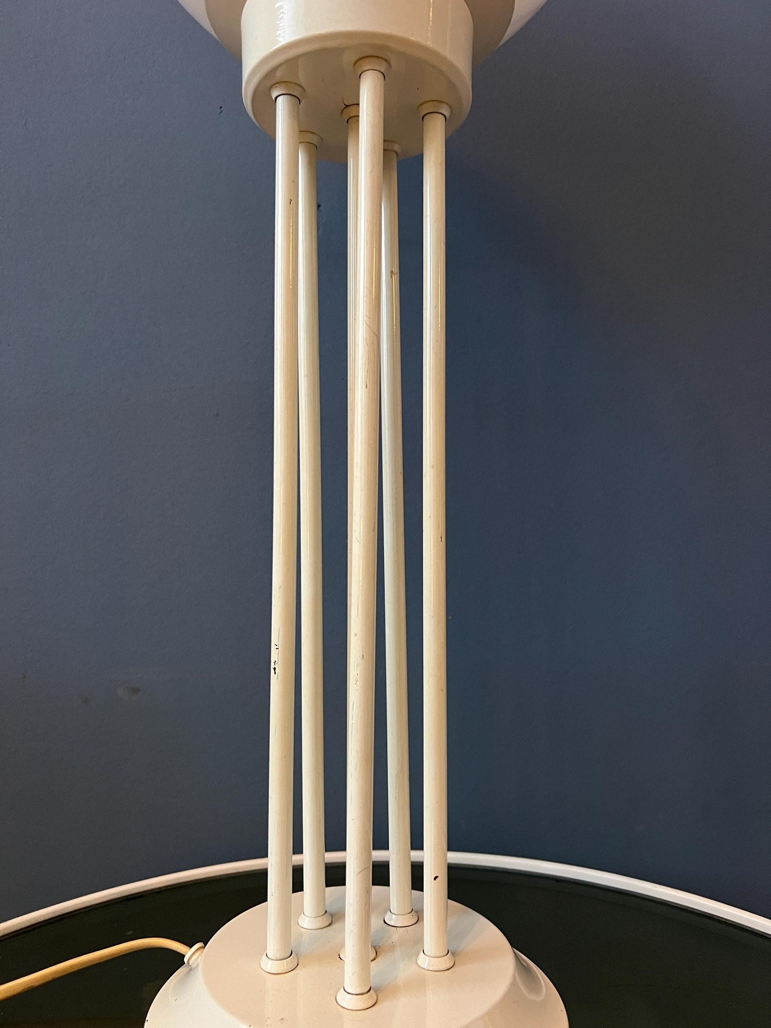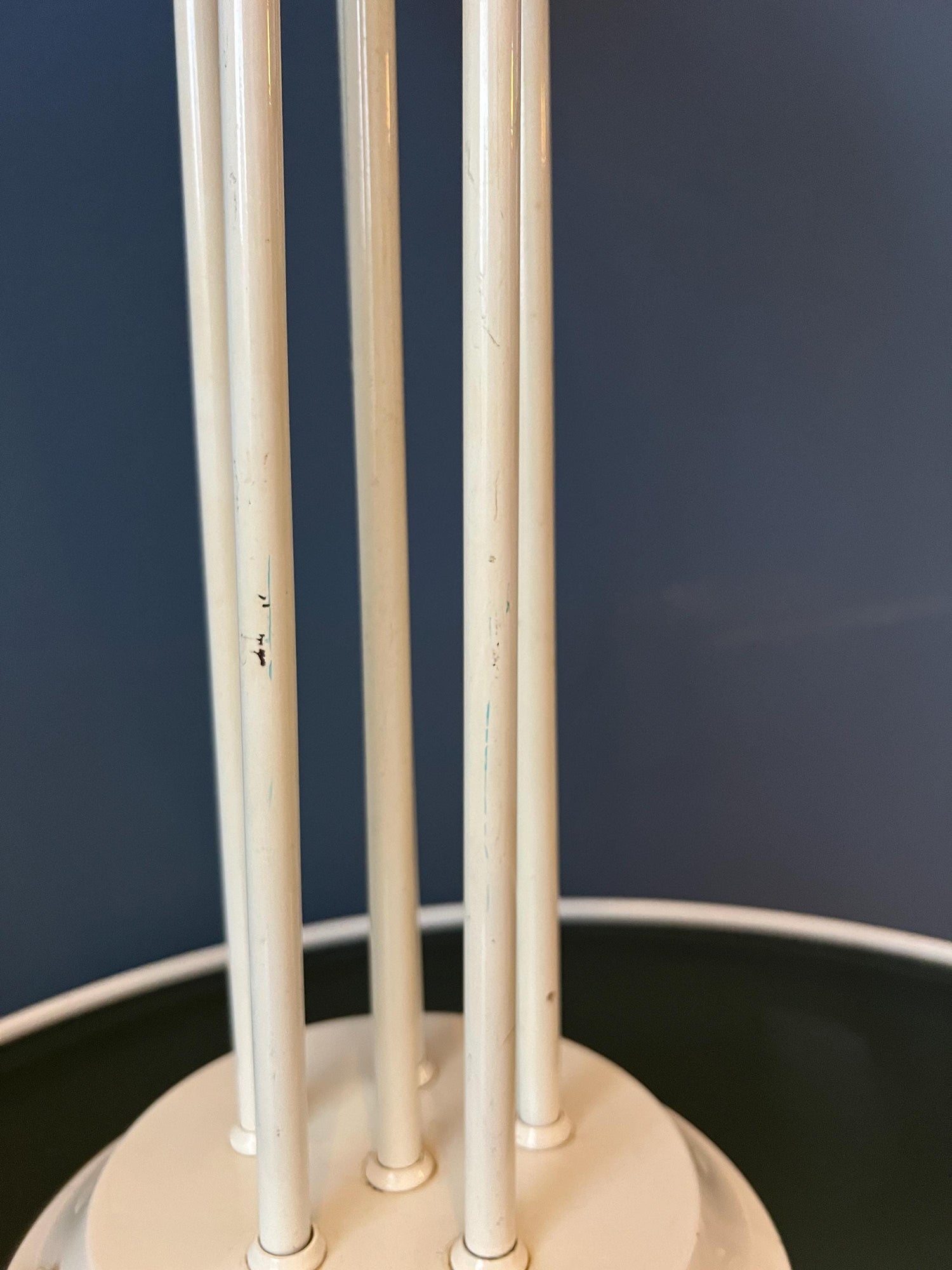 Very good. The lamp is still looking great. The lacquer of the base has some scratches, see last pictures. Some of the metal bars are not running completely vertically straight, see pictures.