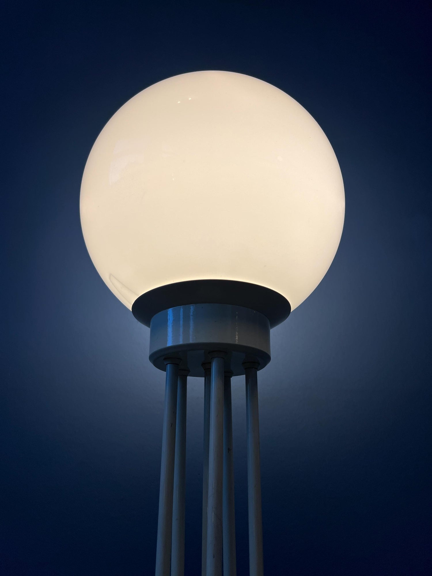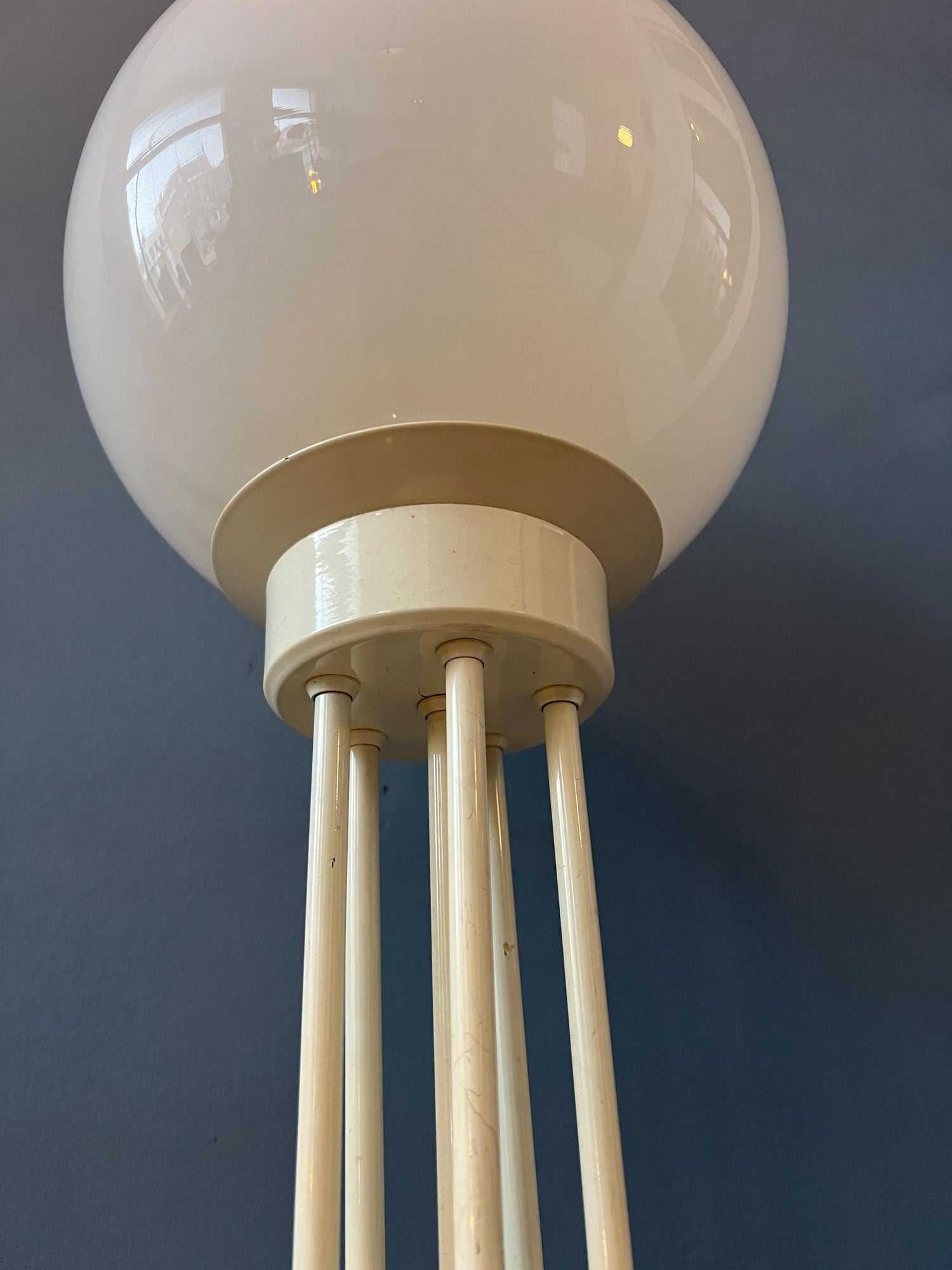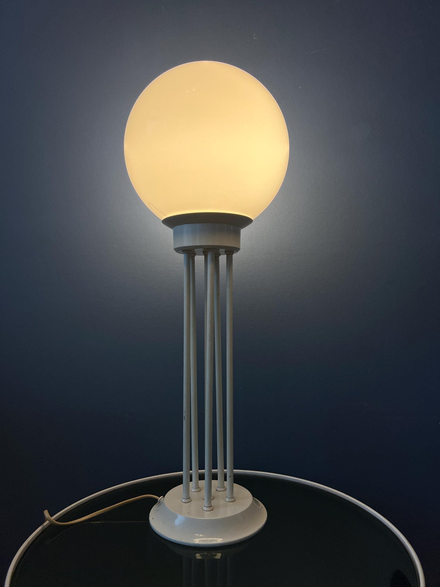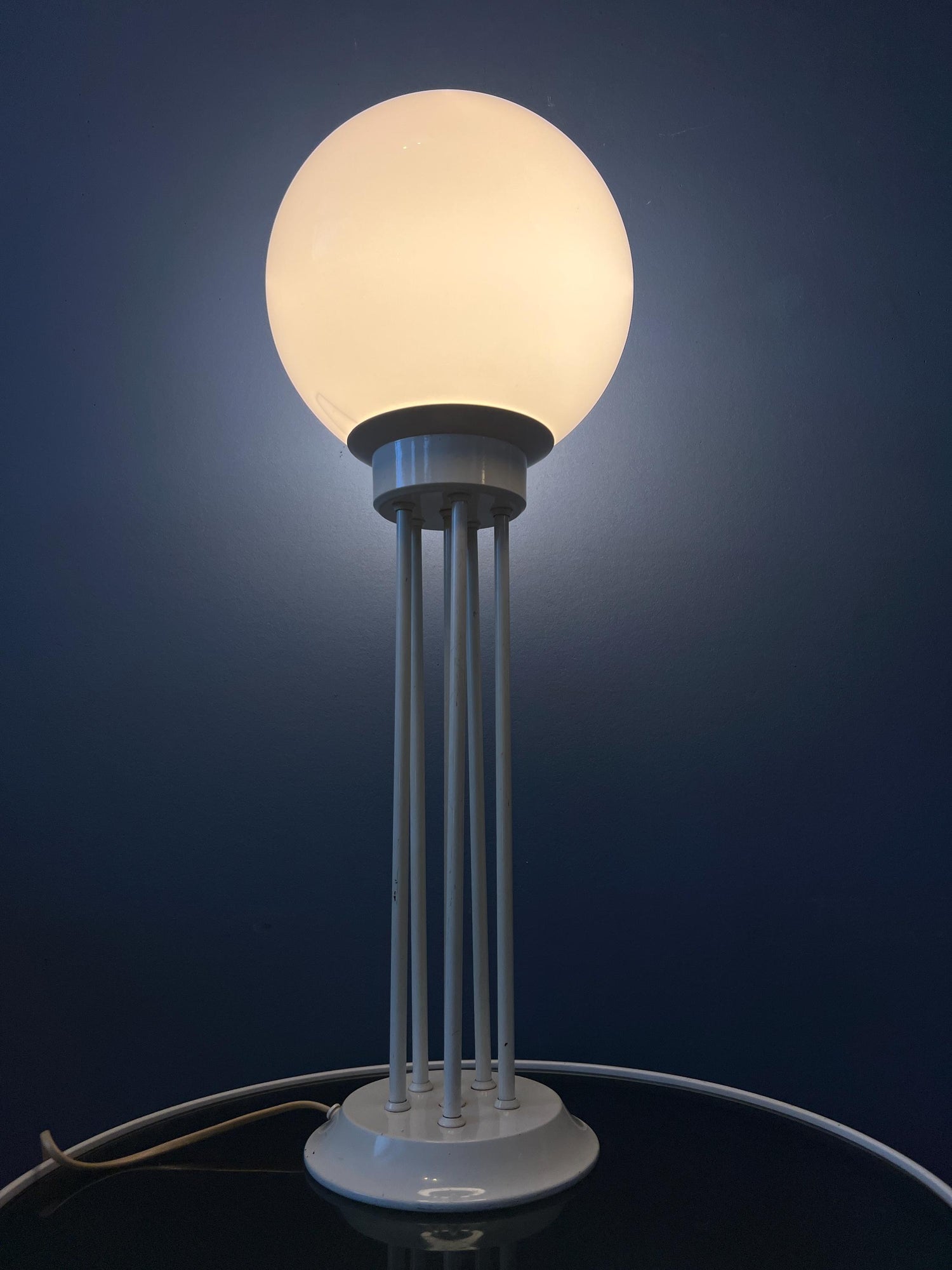 Very good. The lamp is still looking great. The lacquer of the base has some scratches, see last pictures. Some of the metal bars are not running completely vertically straight, see pictures.