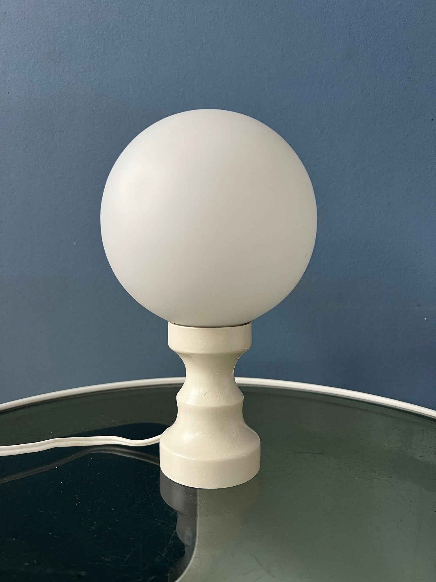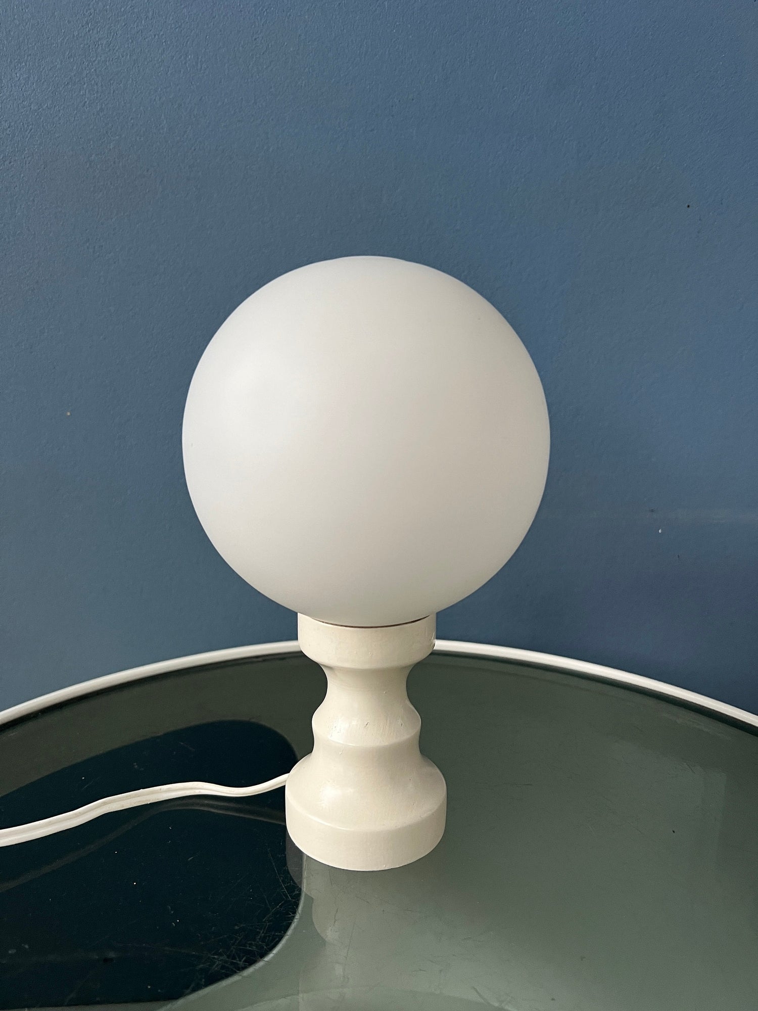 Space age desk lamp with opaline glass shade. The base is made out of wood and has a white lacquer. The lamp requires an E14 lightbulb and currently has an EU-plug.