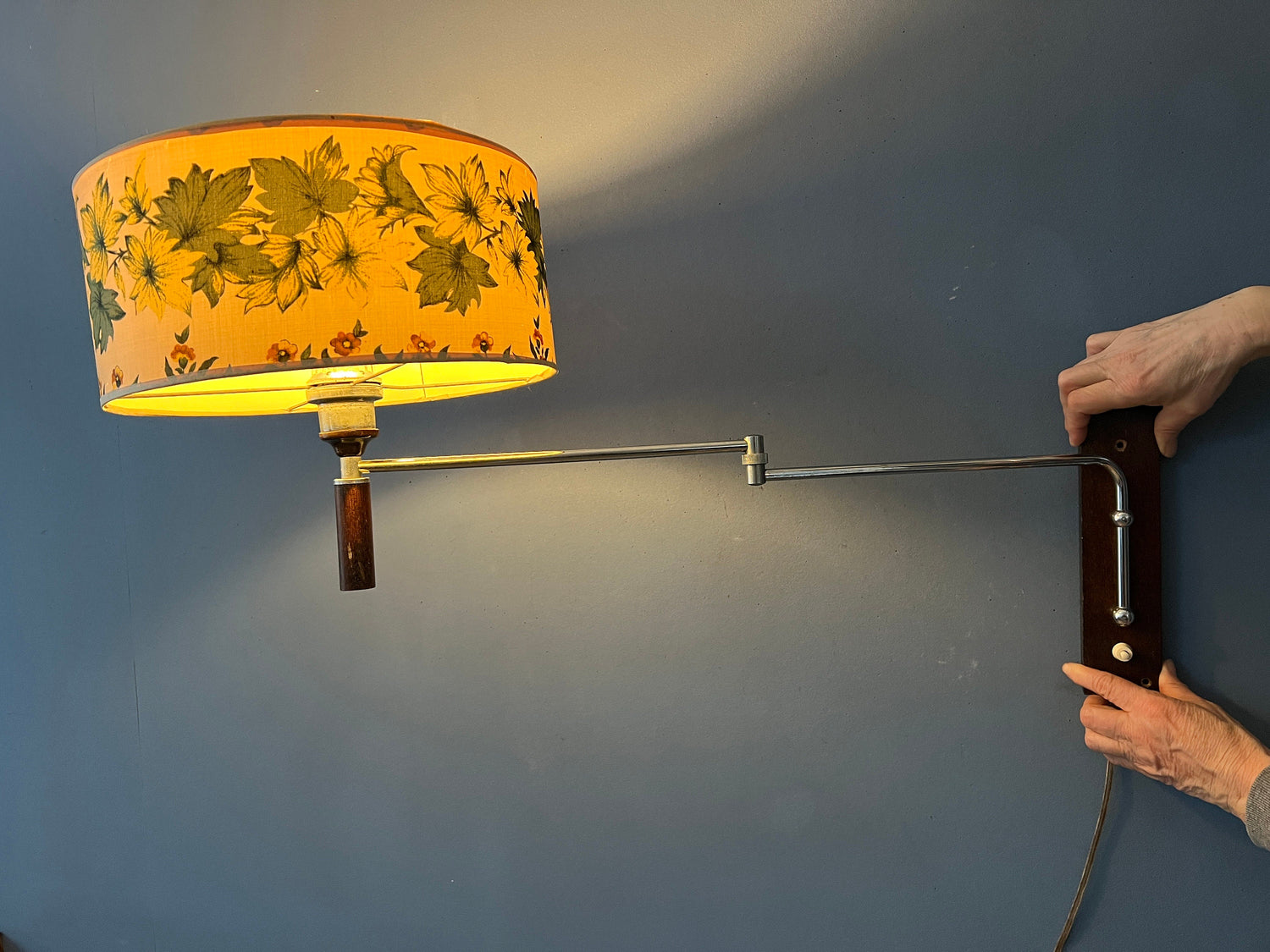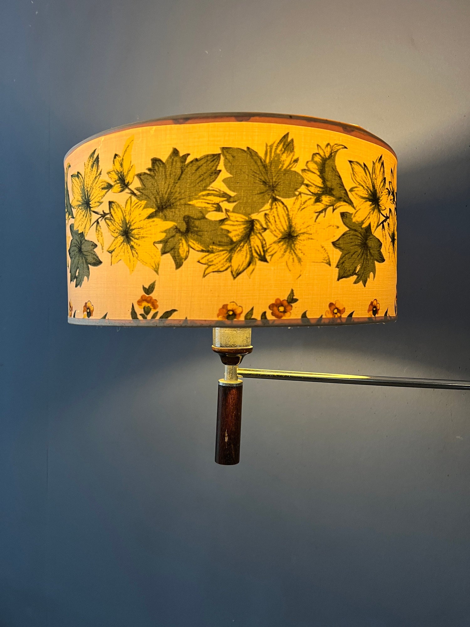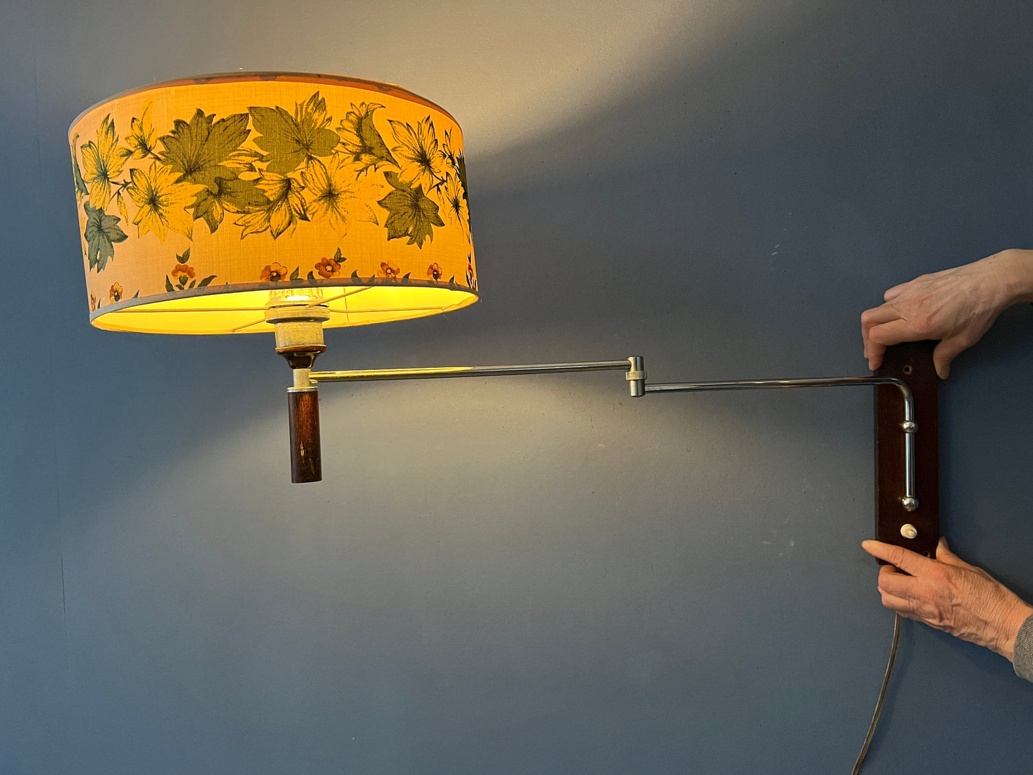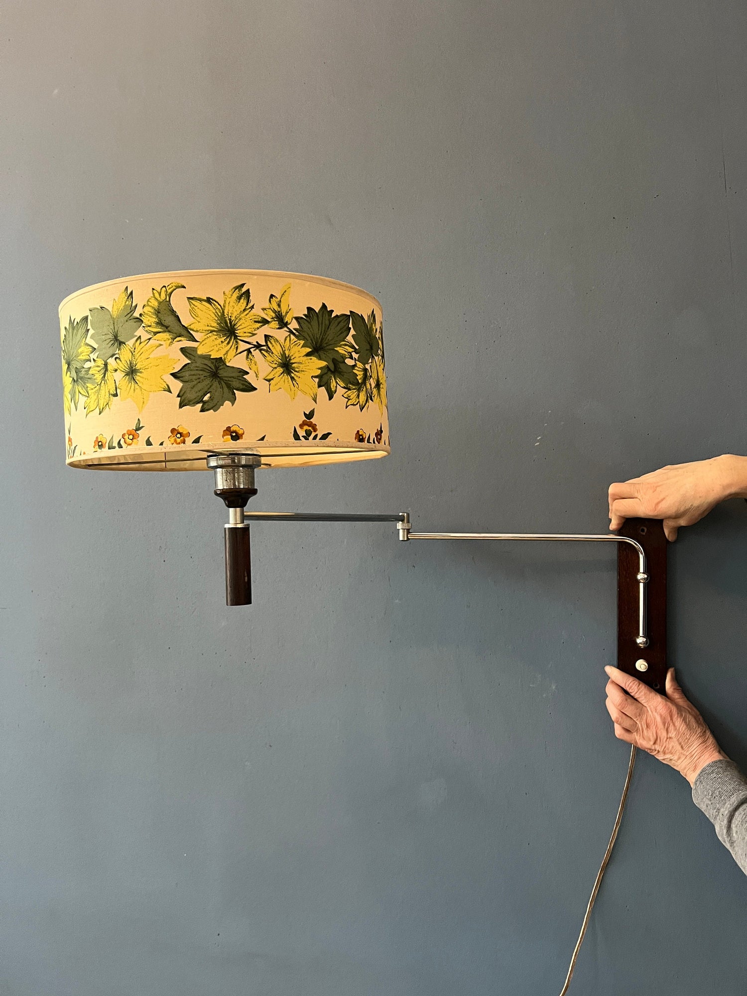 Classy mid-century swing arm wall lamp with textile flower patterned shade and wooden elements. The lamp has a beige and green shade and the arm consists of metal and wood. The lamp requires an E27/26 (standard) lightbulb and currently has an EU-plug (easily used outside EU with plug-converter).