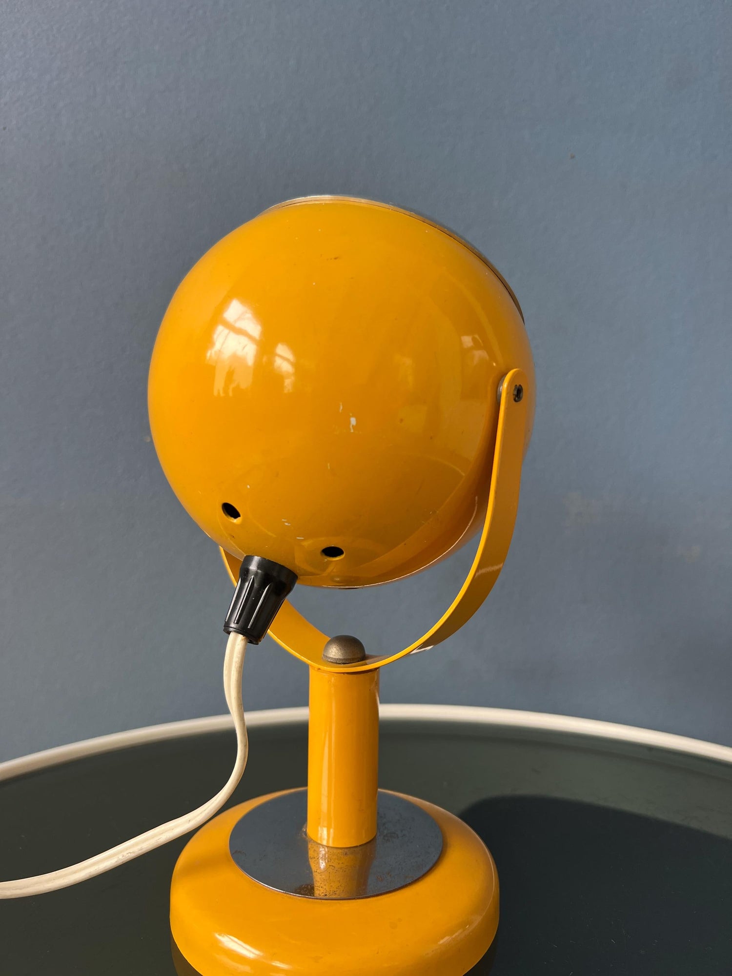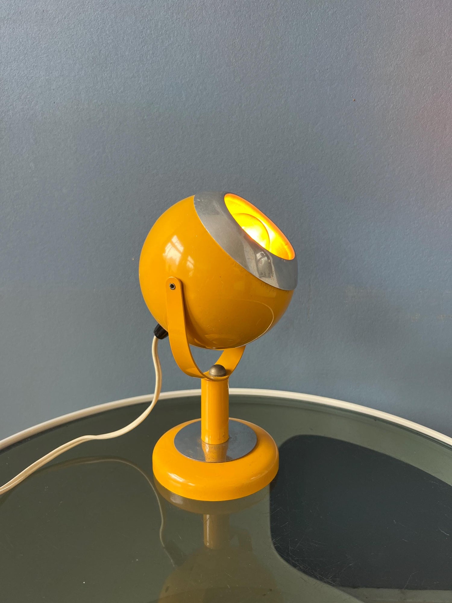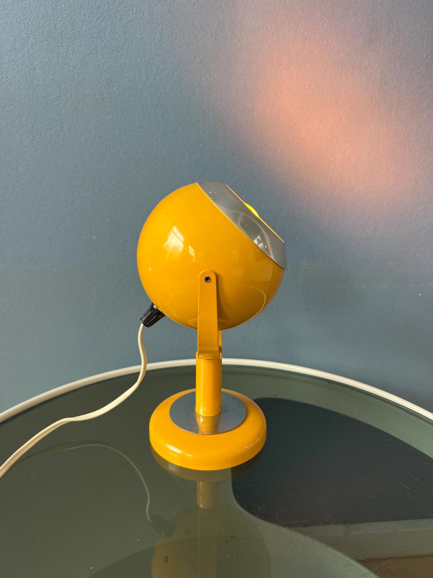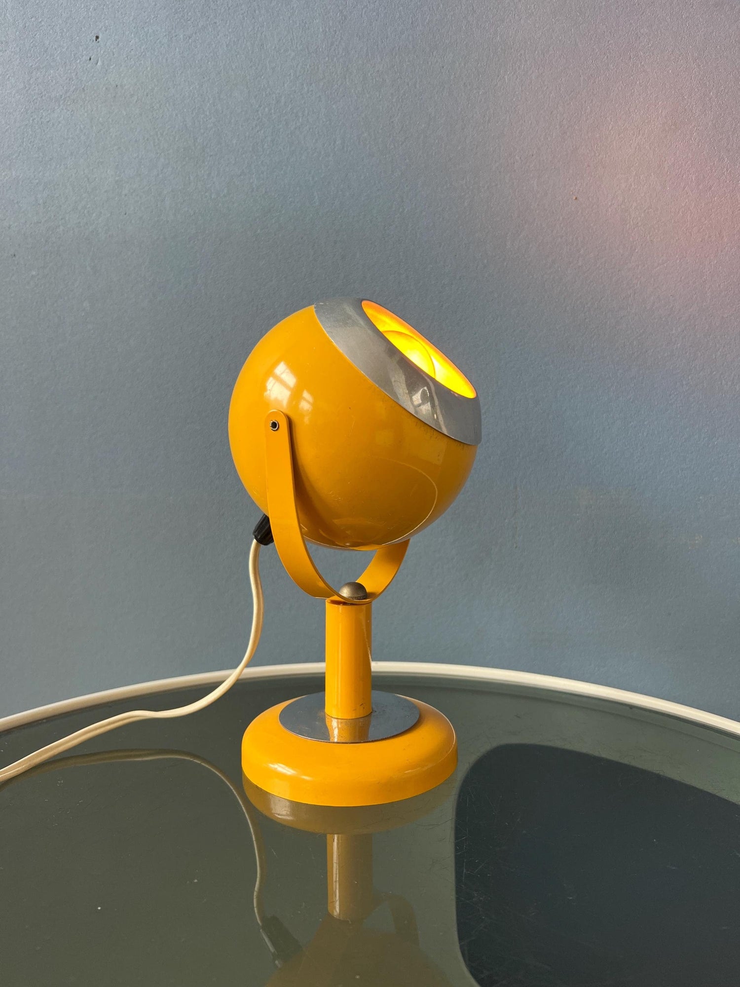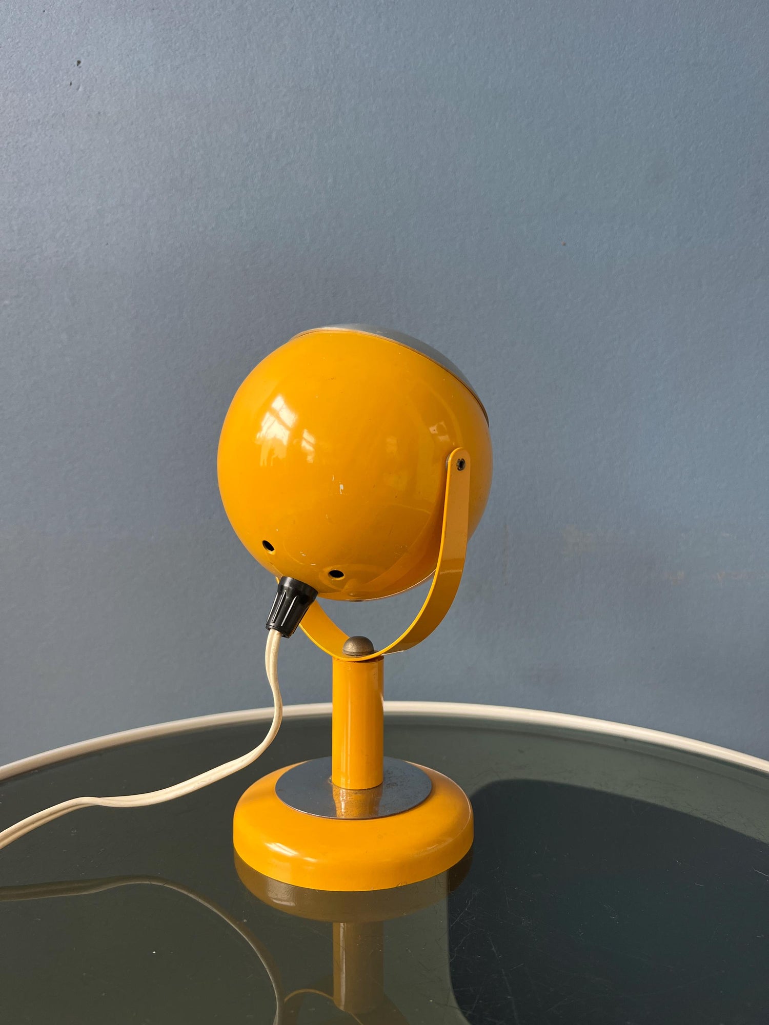 Beautiful yellow space age eyeball table lamps. The eyeball shade can be turned in any direction desirable. The lamp requires one E14 lightbulb and currently has an EU-plug (works outside EU with different plug or plug-converter).