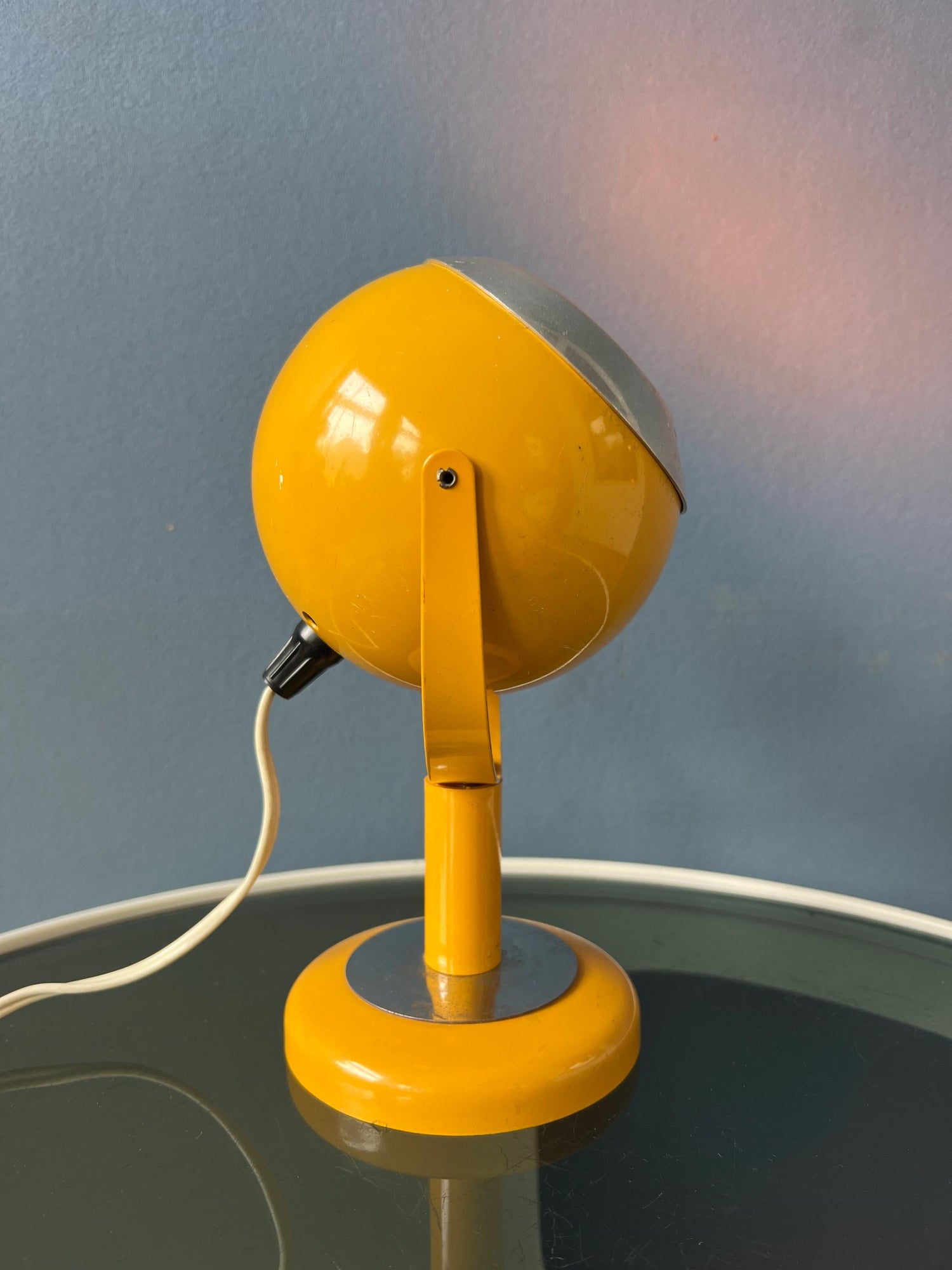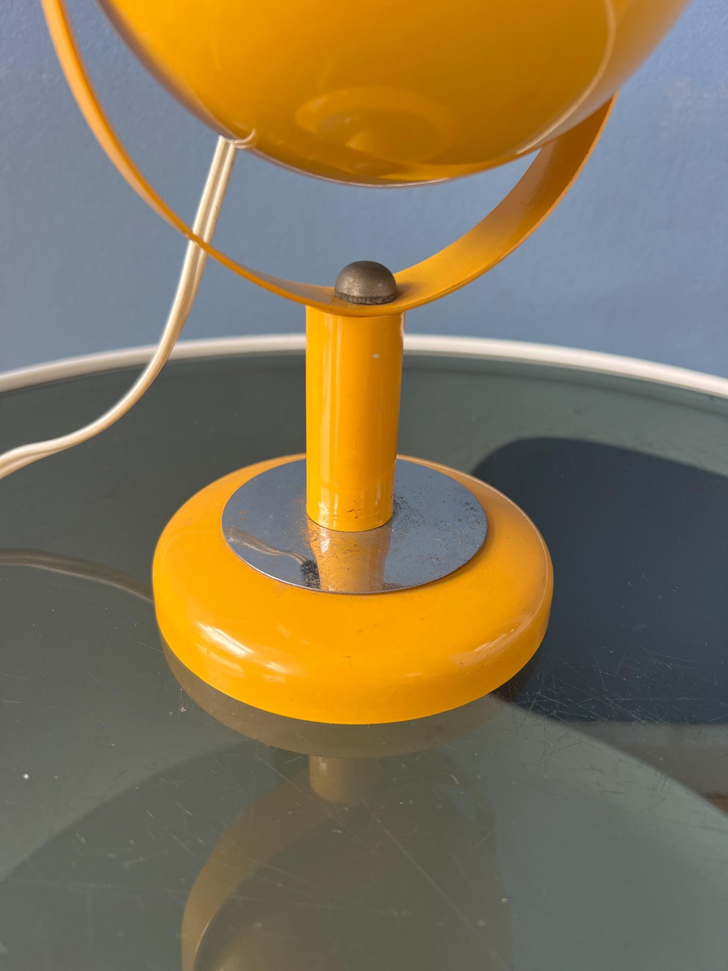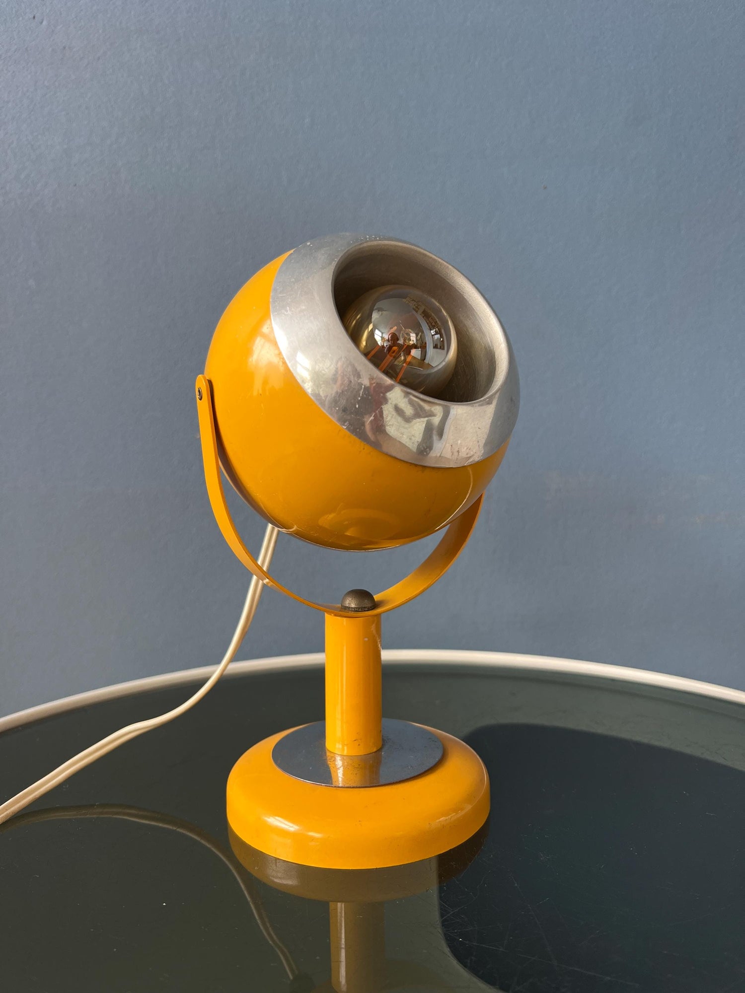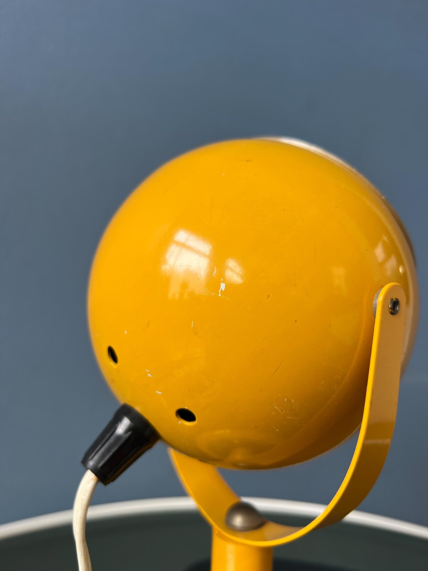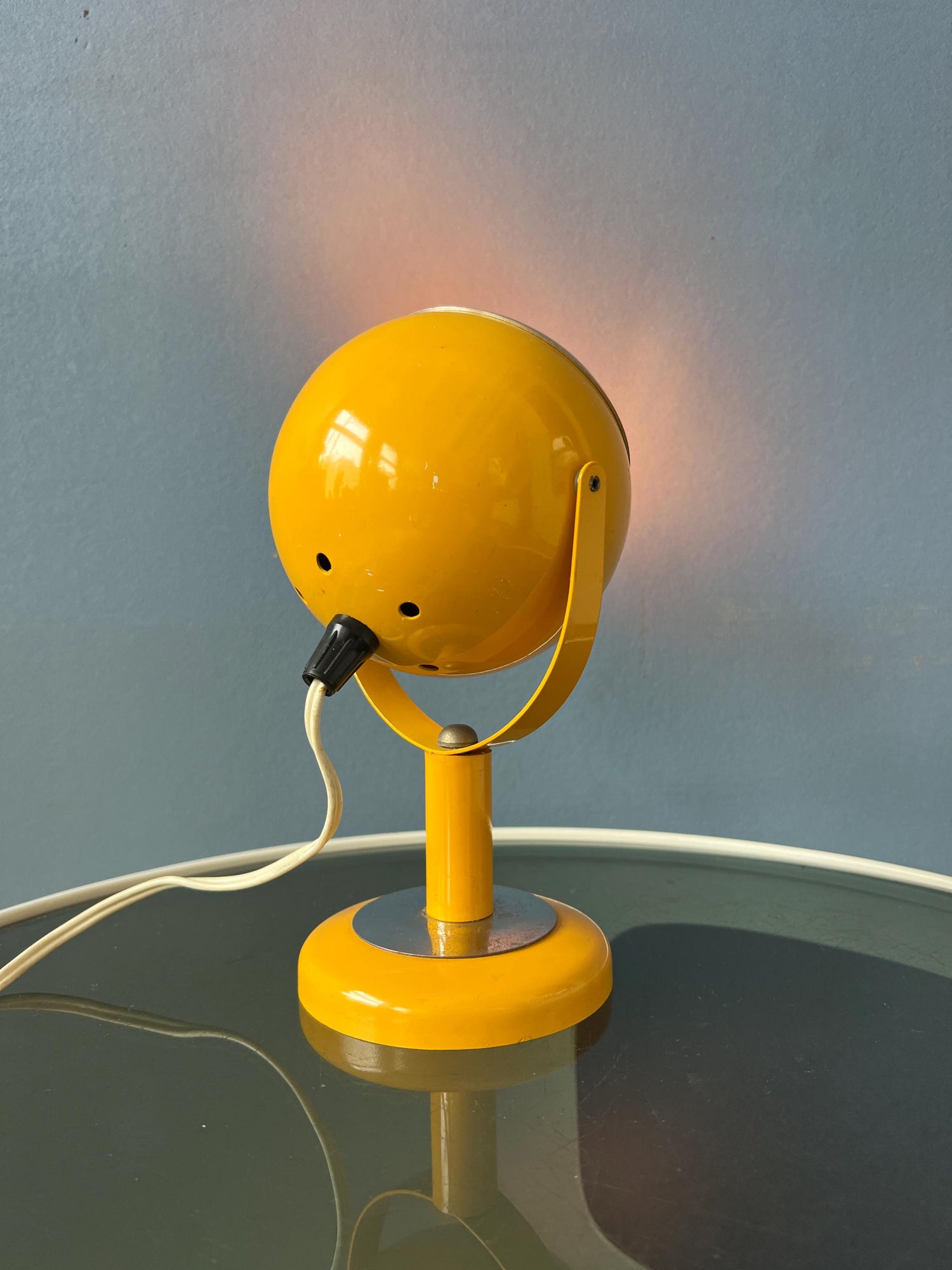 Beautiful yellow space age eyeball table lamps. The eyeball shade can be turned in any direction desirable. The lamp requires one E14 lightbulb and currently has an EU-plug (works outside EU with different plug or plug-converter).