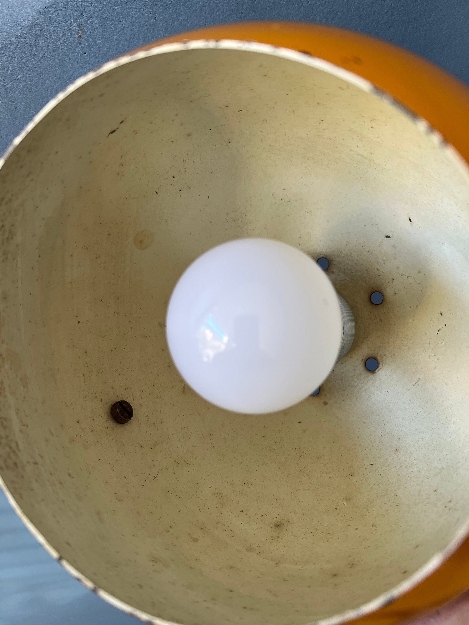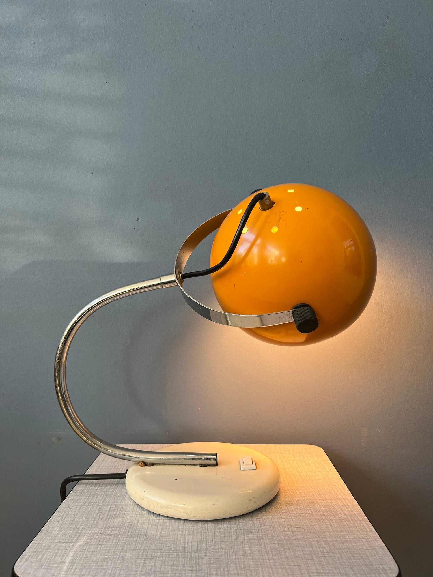 A very cute yellow space age eyeball desk lamp by Herda. The shade can be positioned in any way desirable. The lamp requires an E27 bulb and currently has an EU-plug.