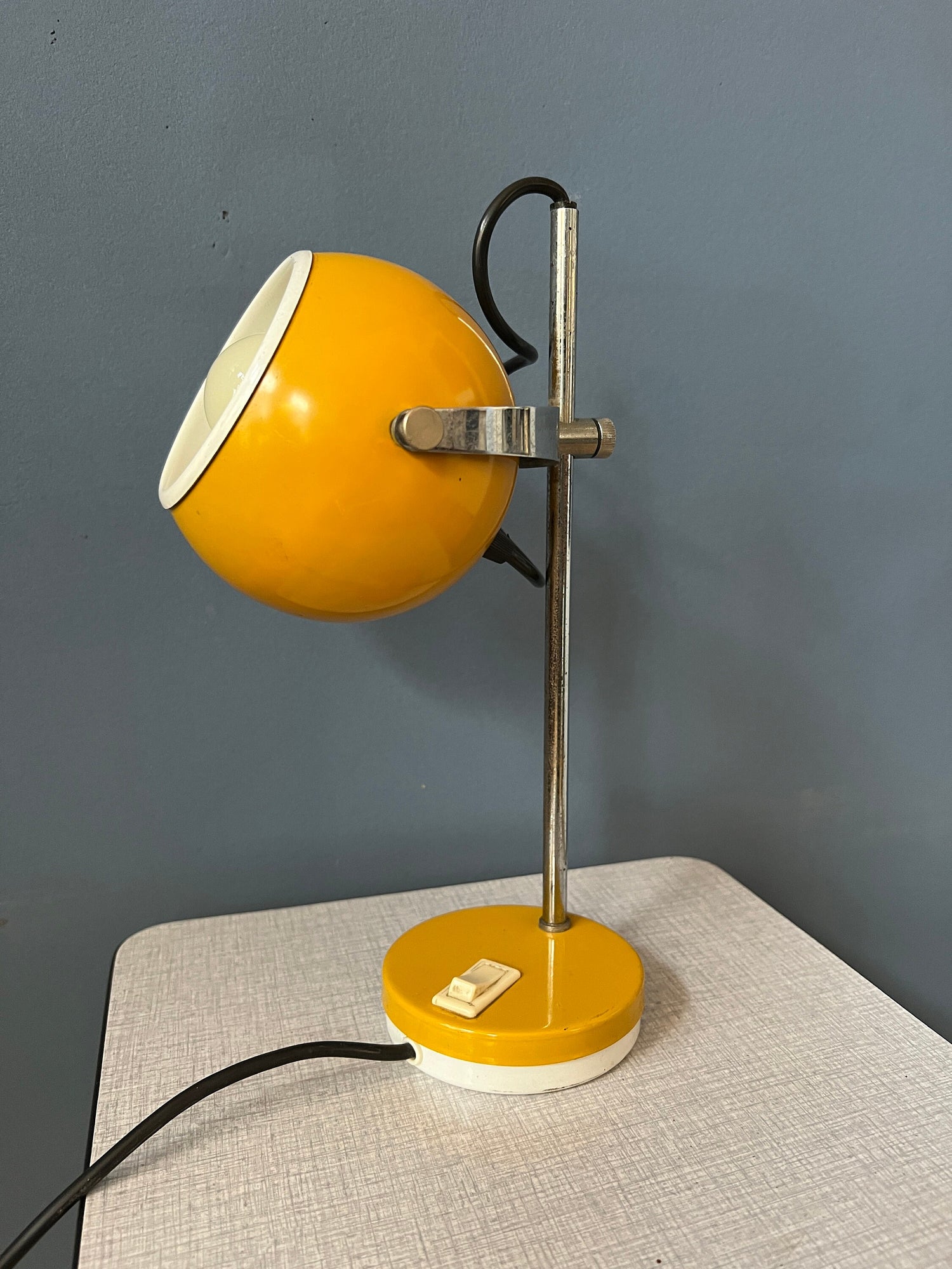 Yellow eyeball space age table lamp by the Dutch brand Herda. The yellow metal shade can be positioned in any way desirable and move up and down the base. The lamp requires an E27 lightbulb and currently has an EU-plug.