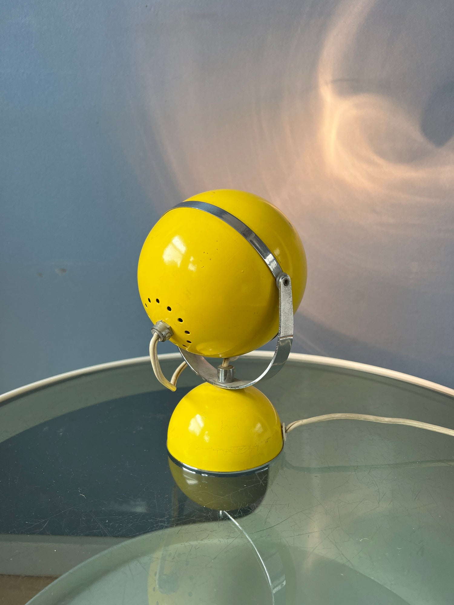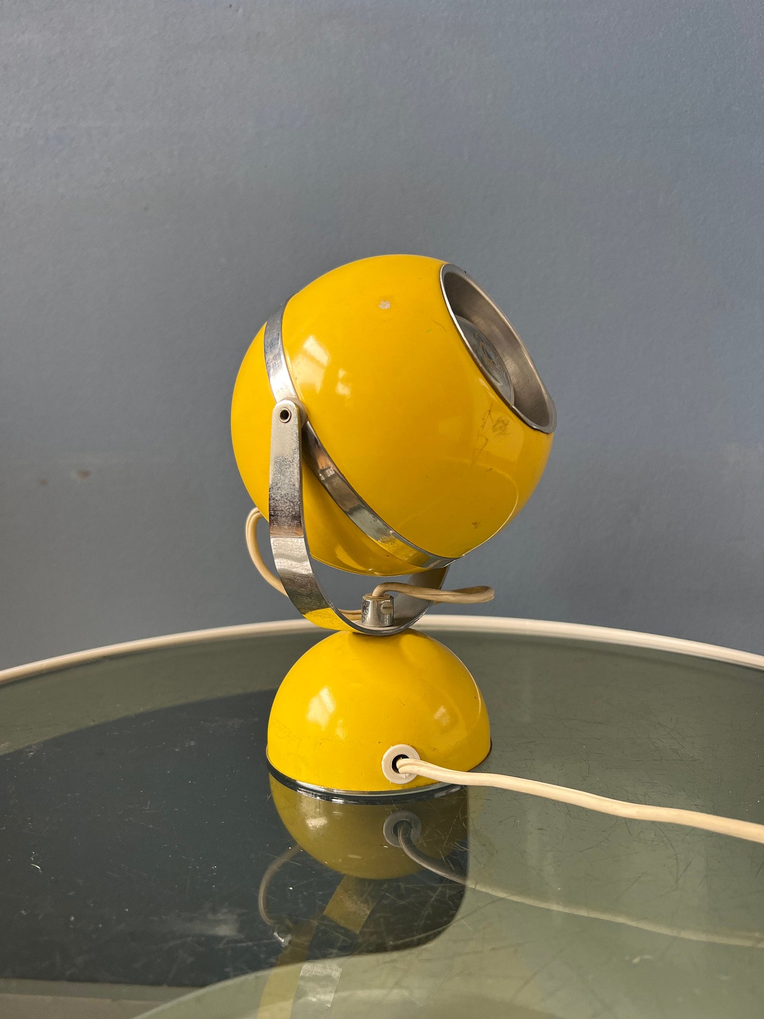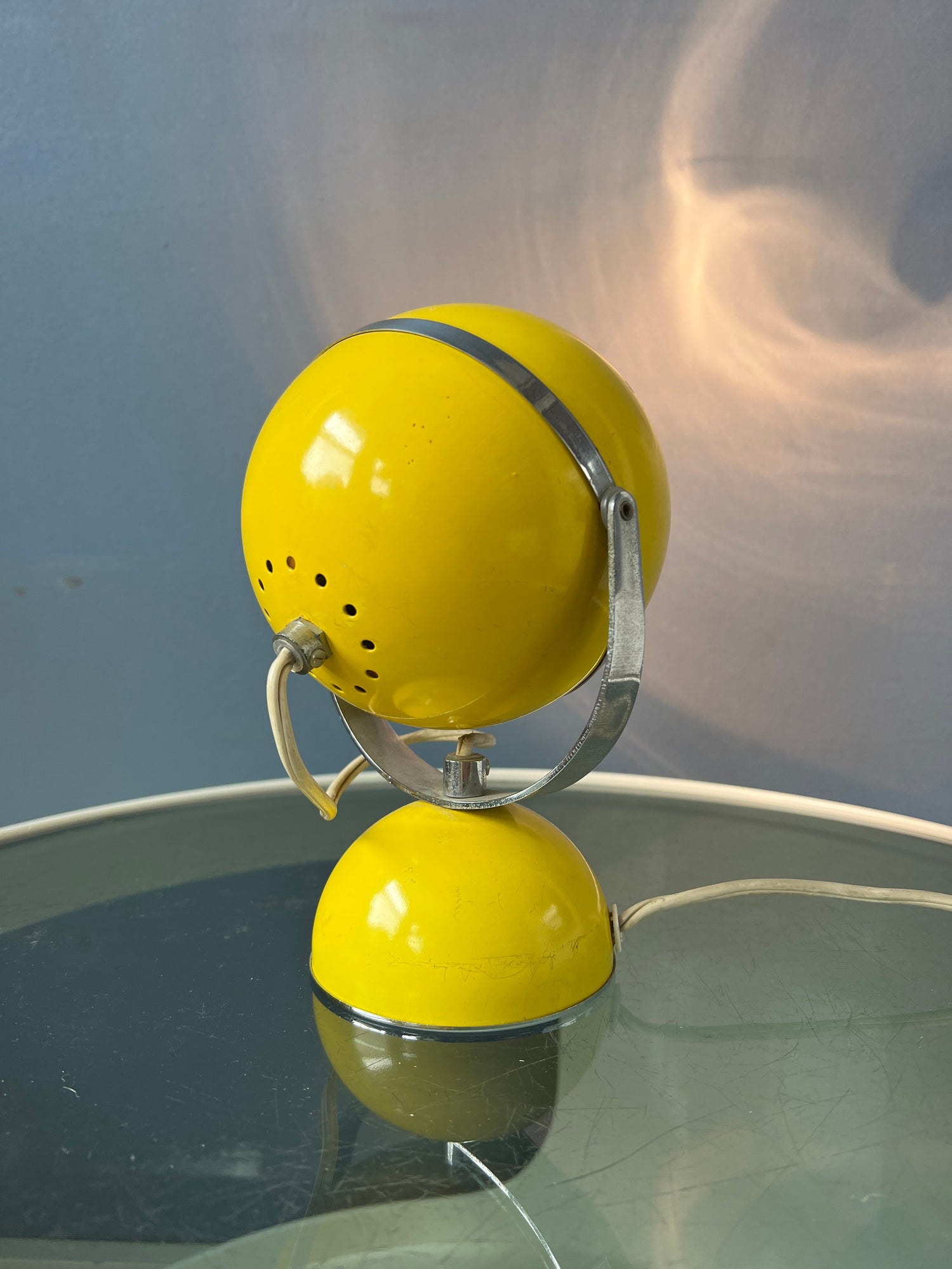 Yellow space age table lamp with adjustable eyeball shade. The shade can be turned in any direction. The lamp requires one E14 lightbulb and currently has an EU-plug (works outside EU with plug-converter).