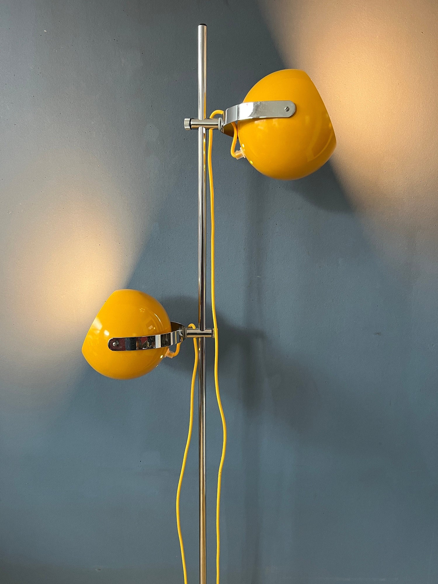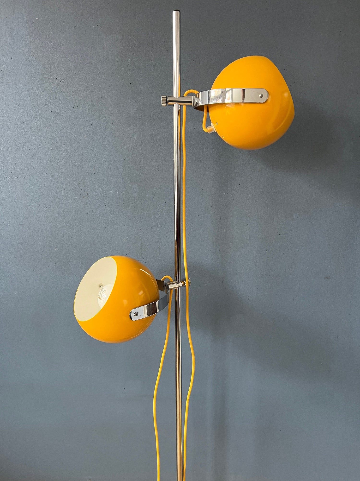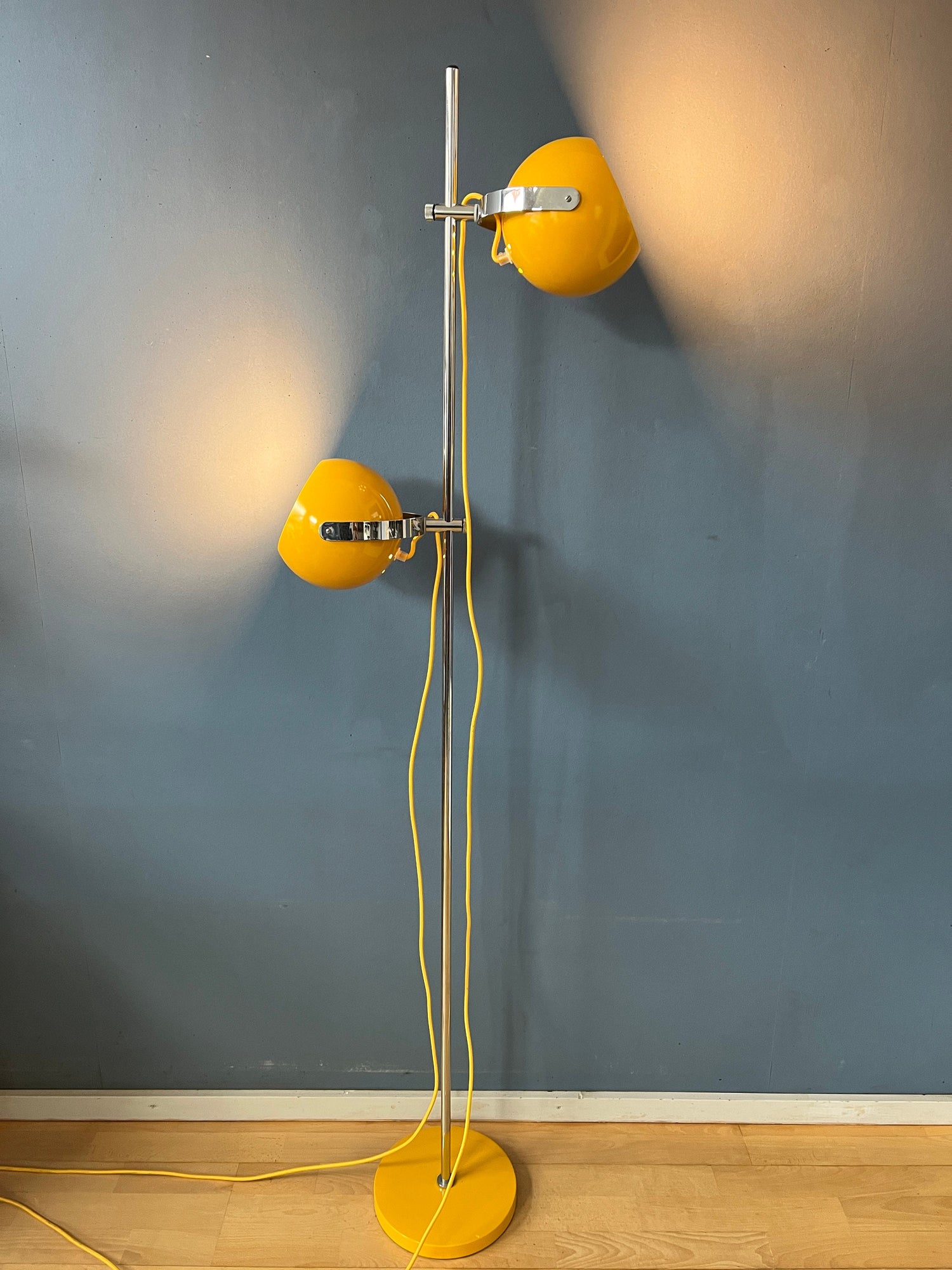 Renovated vintage Herda space age eyeball floor lamp in yellow colour. The metal shades can be directed in any way desirable. They can also move up and down the base. The lights can be switched on separately or simultaneously, the lamp has two switches: one for each light. The lamp requires two E27/26 lightbulbs and currently has a EU-plug (easily used outside EU with plug-converter).